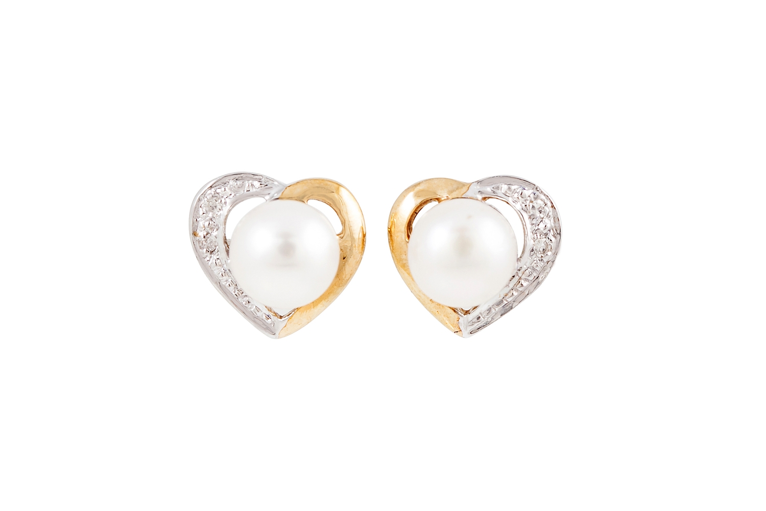 A PAIR OF DIAMOND AND PEARL EARRINGS, mounted in 9ct gold