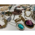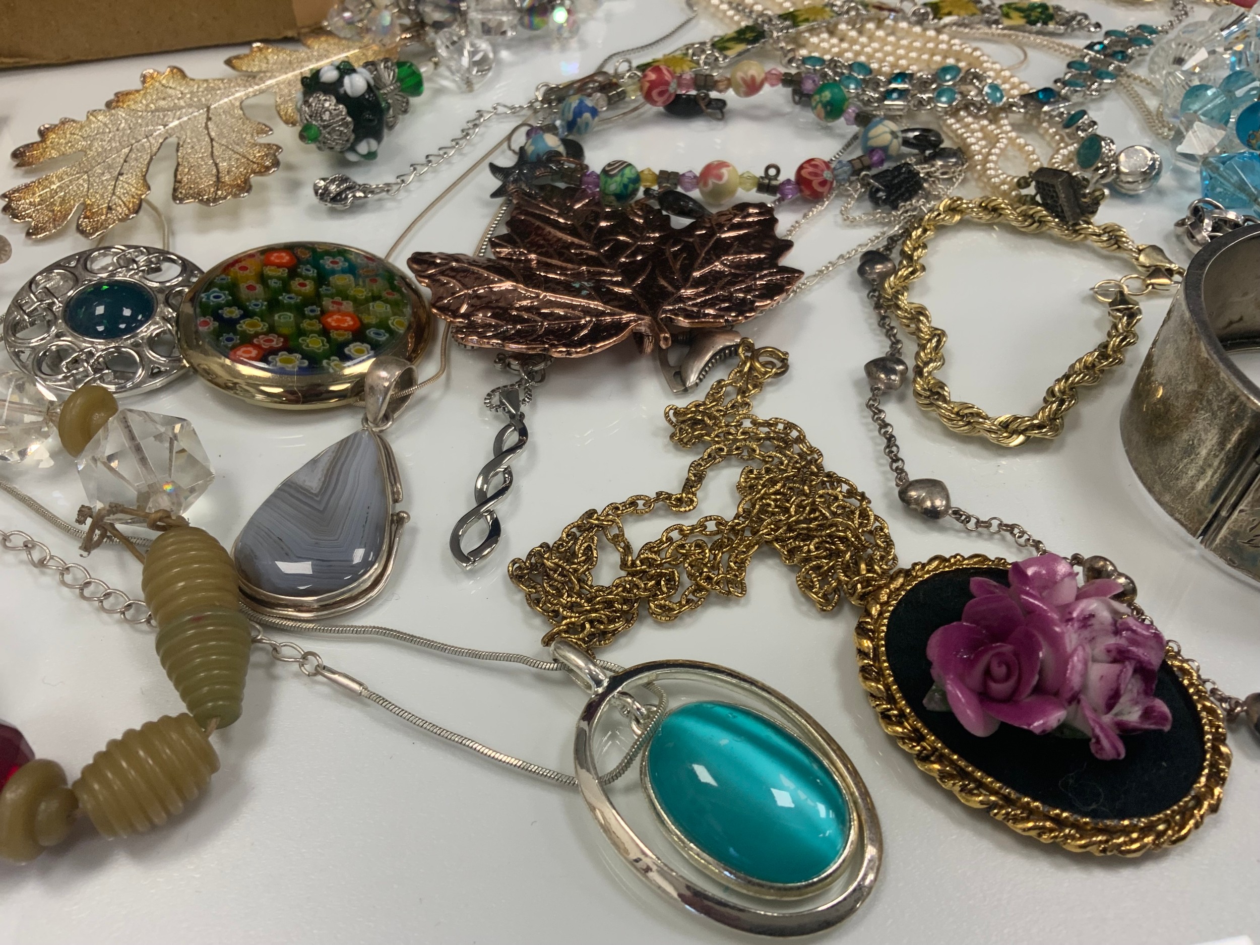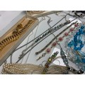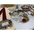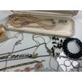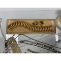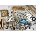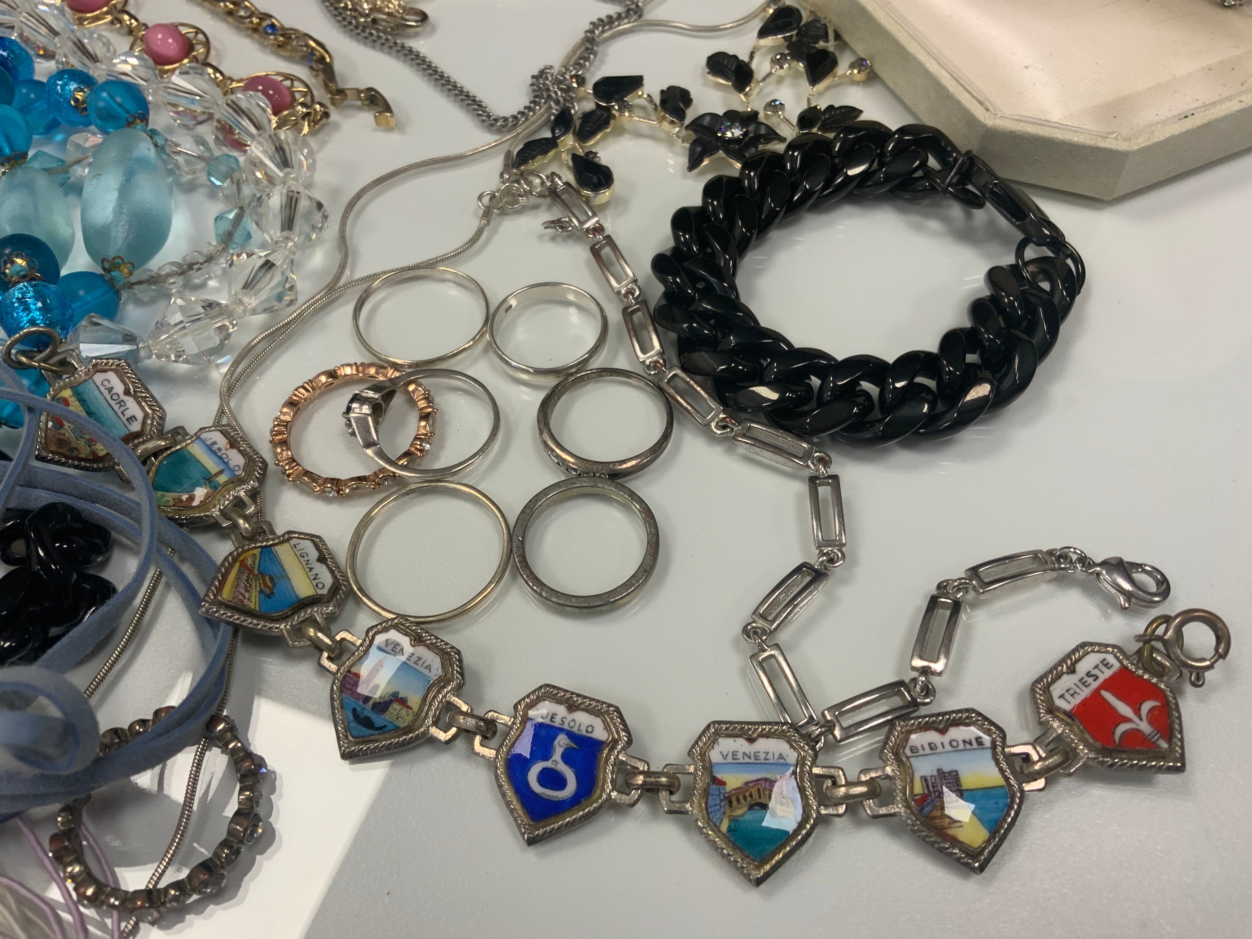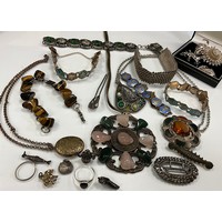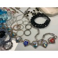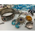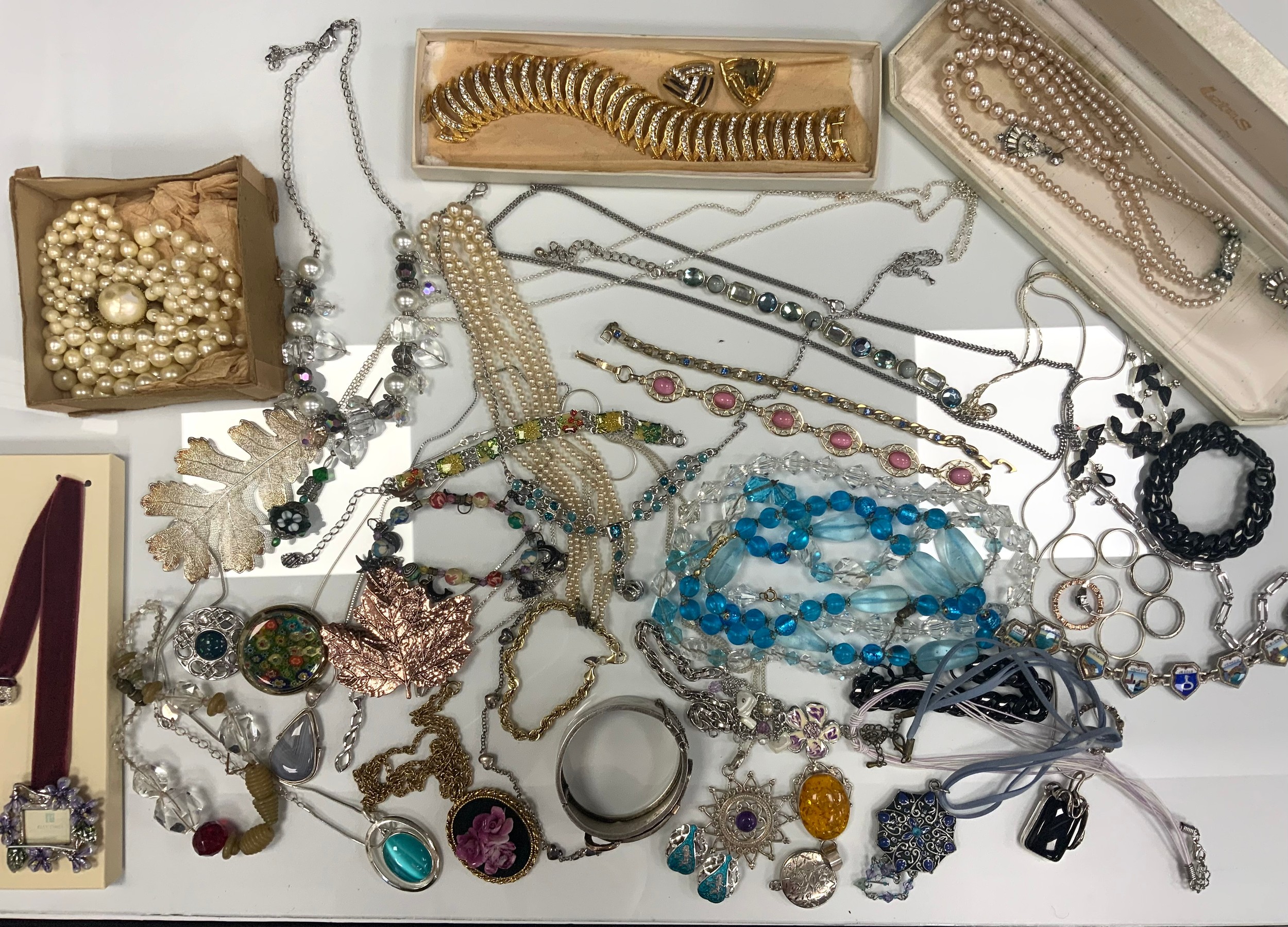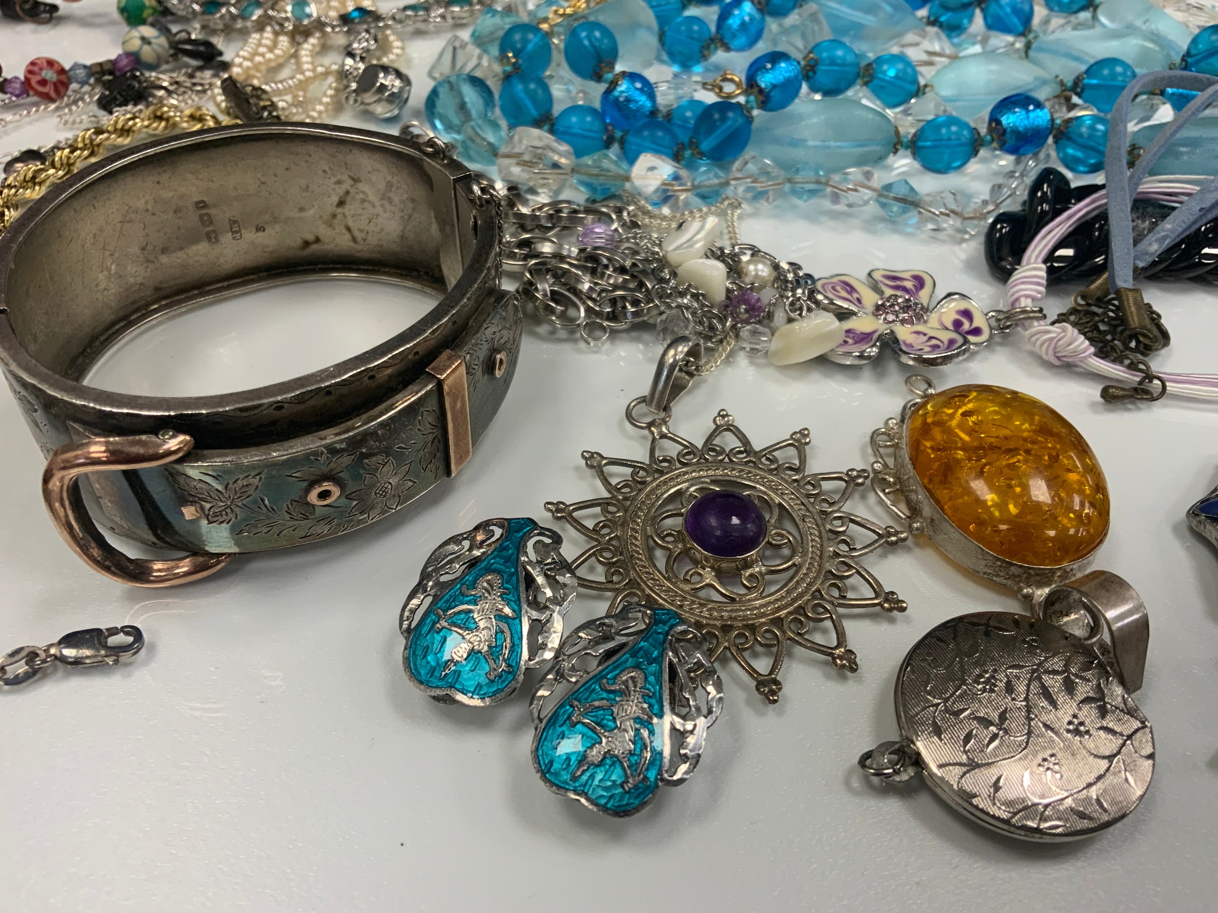 Jewellery - Victorian rose metal and silver belt buckle hinge bangle, Birmingham 1885, 32.6g gross, amethyst and white metal pendant necklace, banded agate silver mounted pendant necklace; others amber coloured resin, pair of Siam clip on sterling silver earrings, dress rings, part stamped 925, glass and other bead necklaces, tie/hat pins bracelets etc