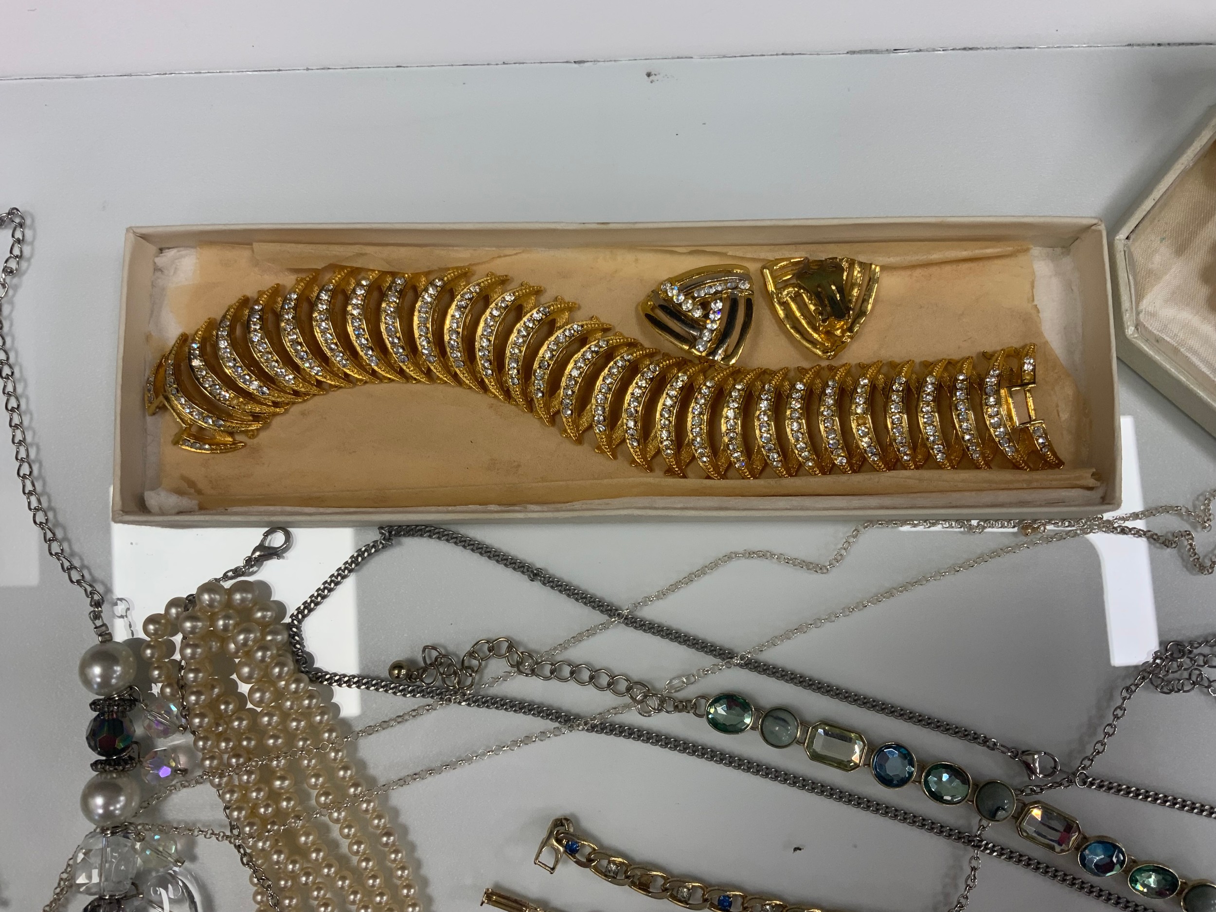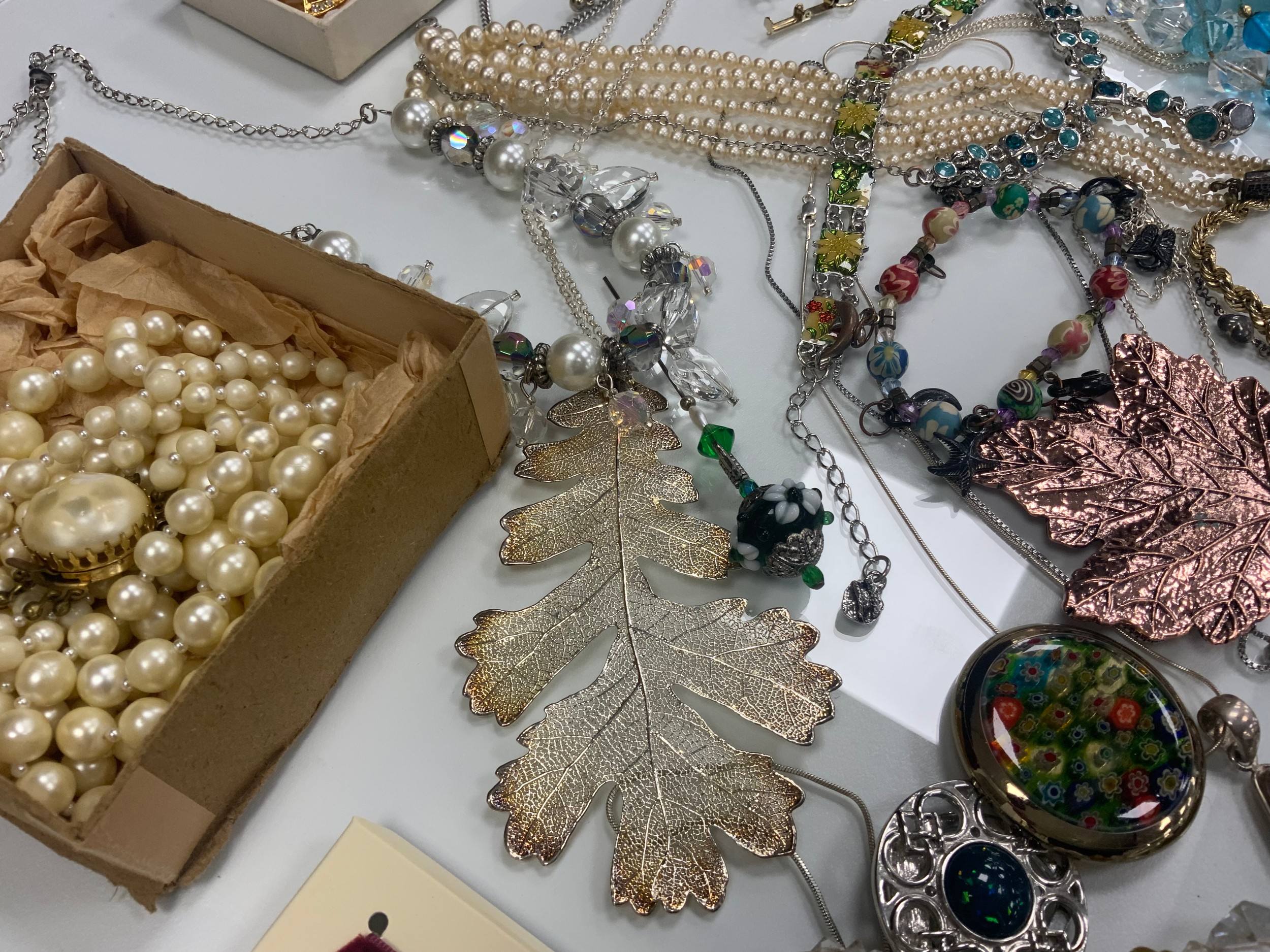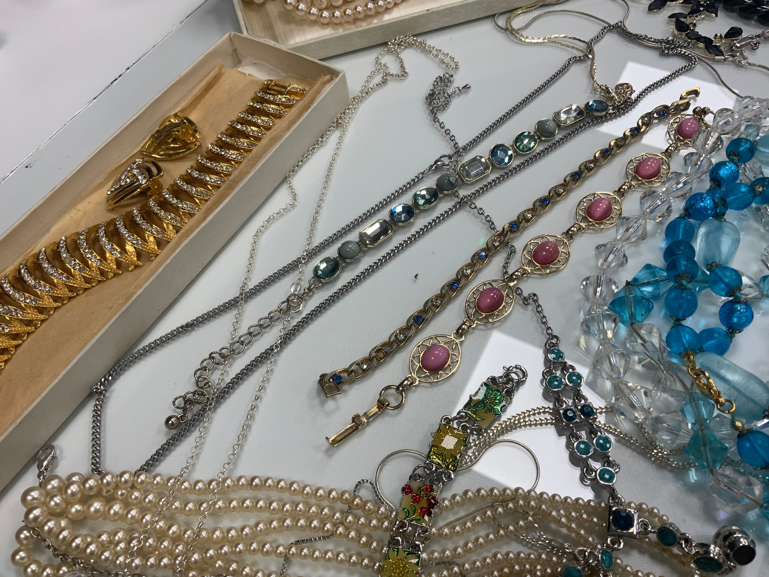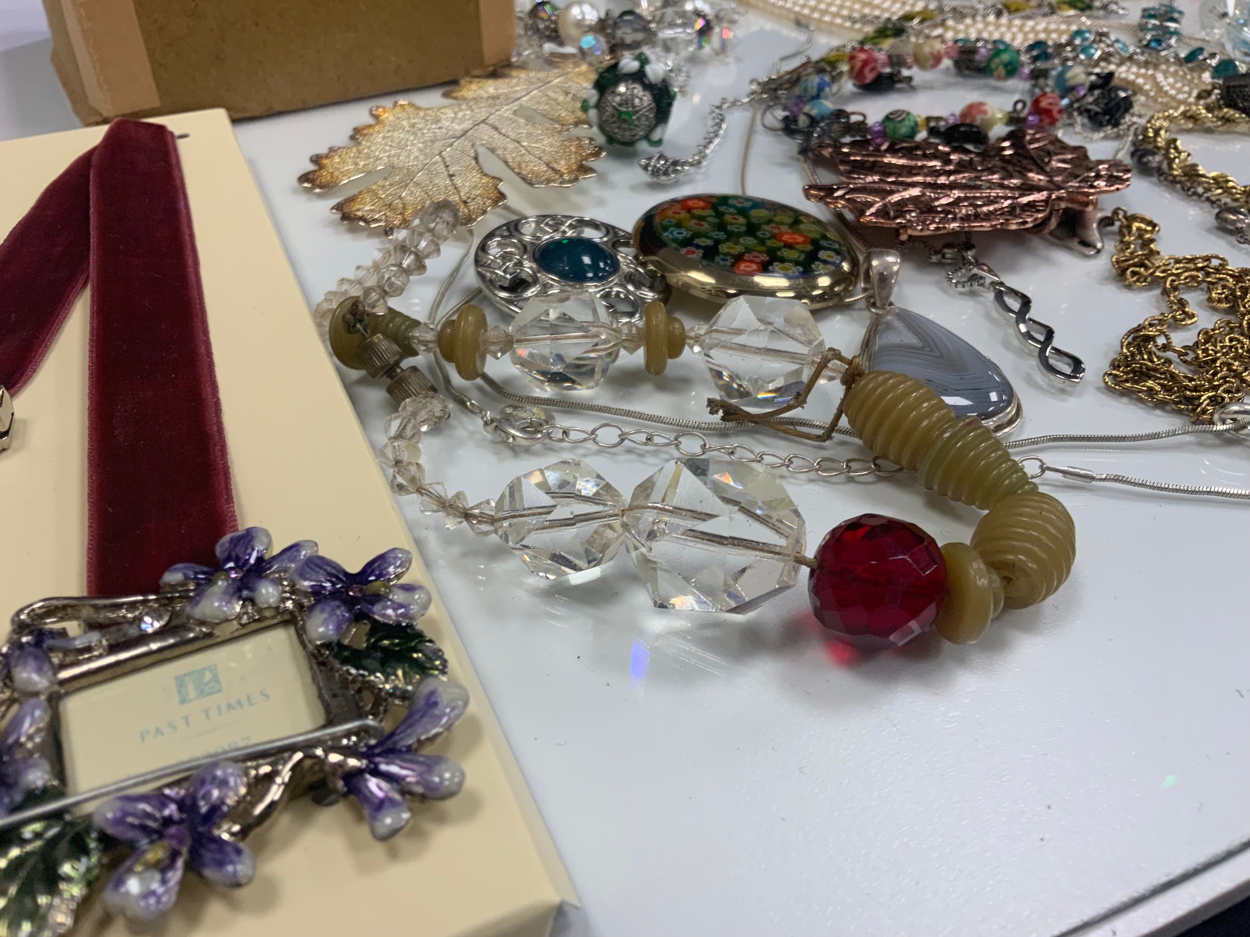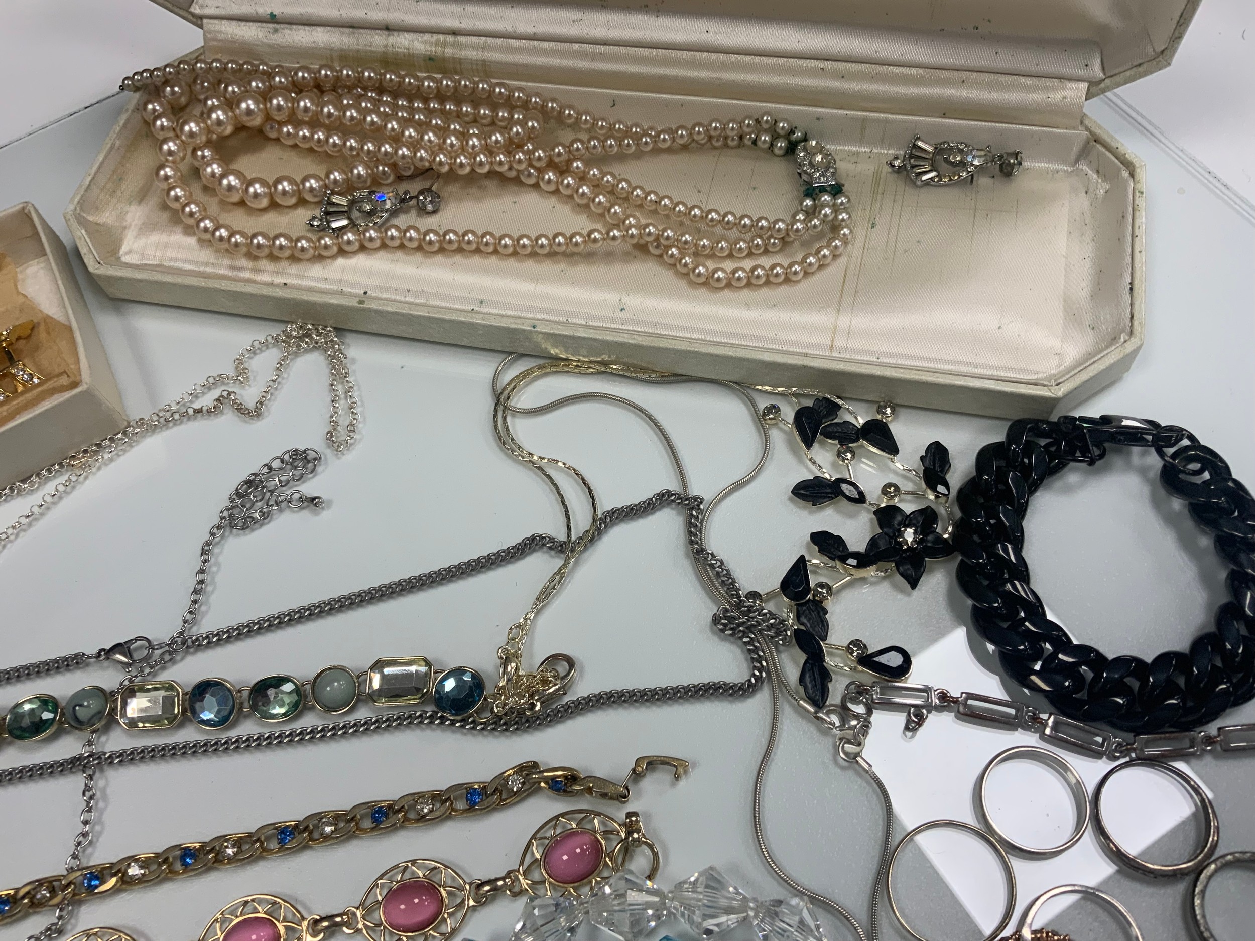 Jewellery - Victorian rose metal and silver belt buckle hinge bangle, Birmingham 1885, 32.6g gross, amethyst and white metal pendant necklace, banded agate silver mounted pendant necklace; others amber coloured resin, pair of Siam clip on sterling silver earrings, dress rings, part stamped 925, glass and other bead necklaces, tie/hat pins bracelets etc