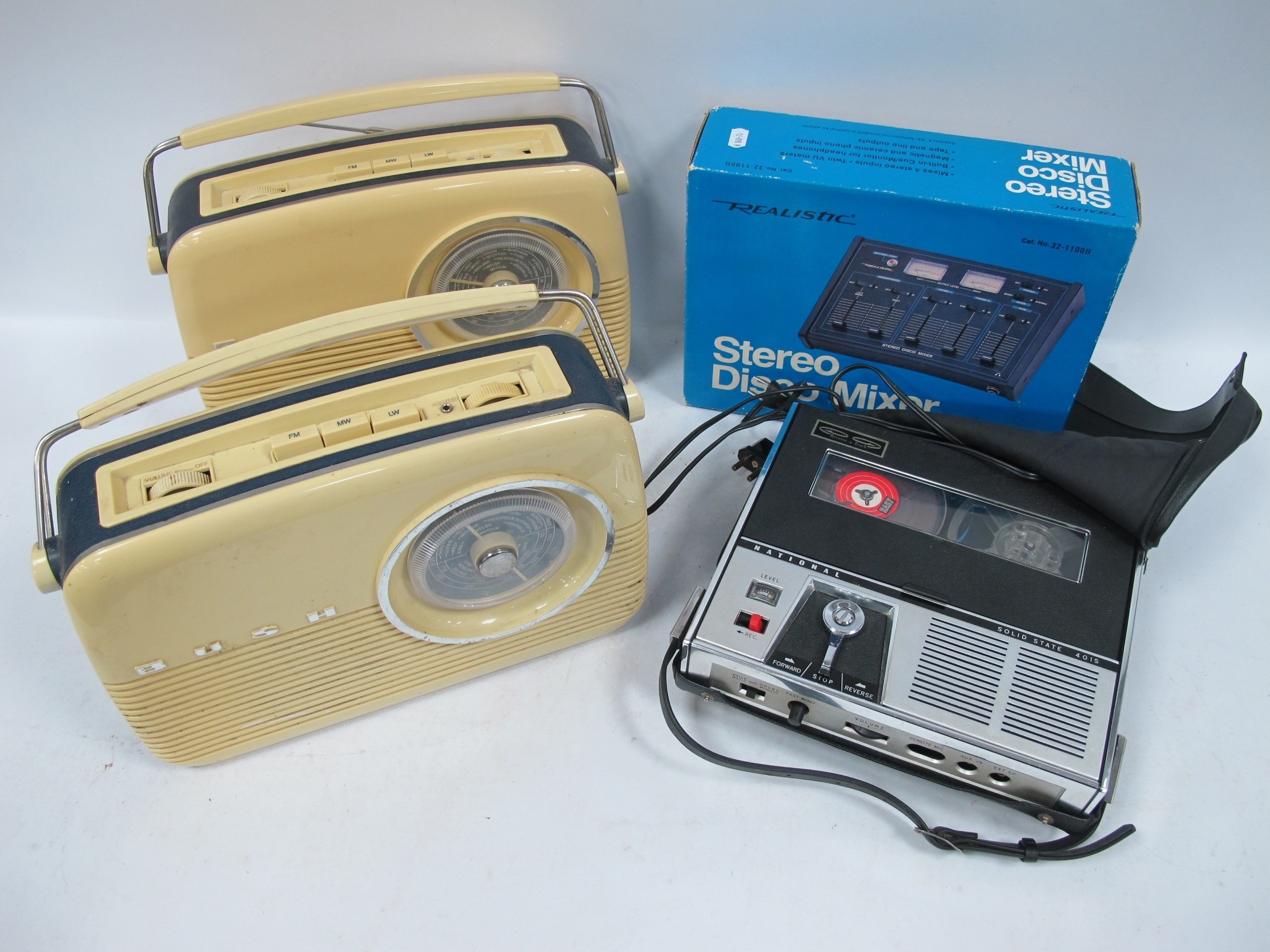 Vintage Electronics: two Bush TR82 radios, a boxed Realistic Stereo Disco Mixer and National "Solid State" 401S tape recorder. Untested:- One Box.
