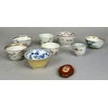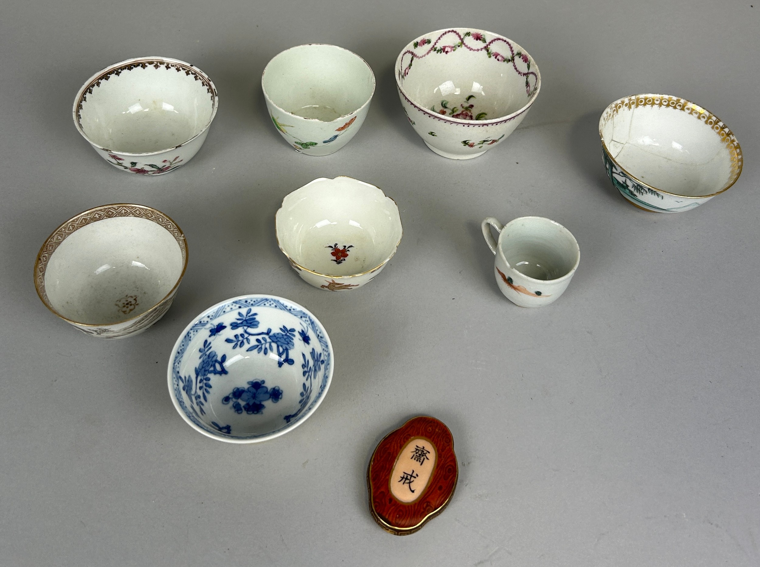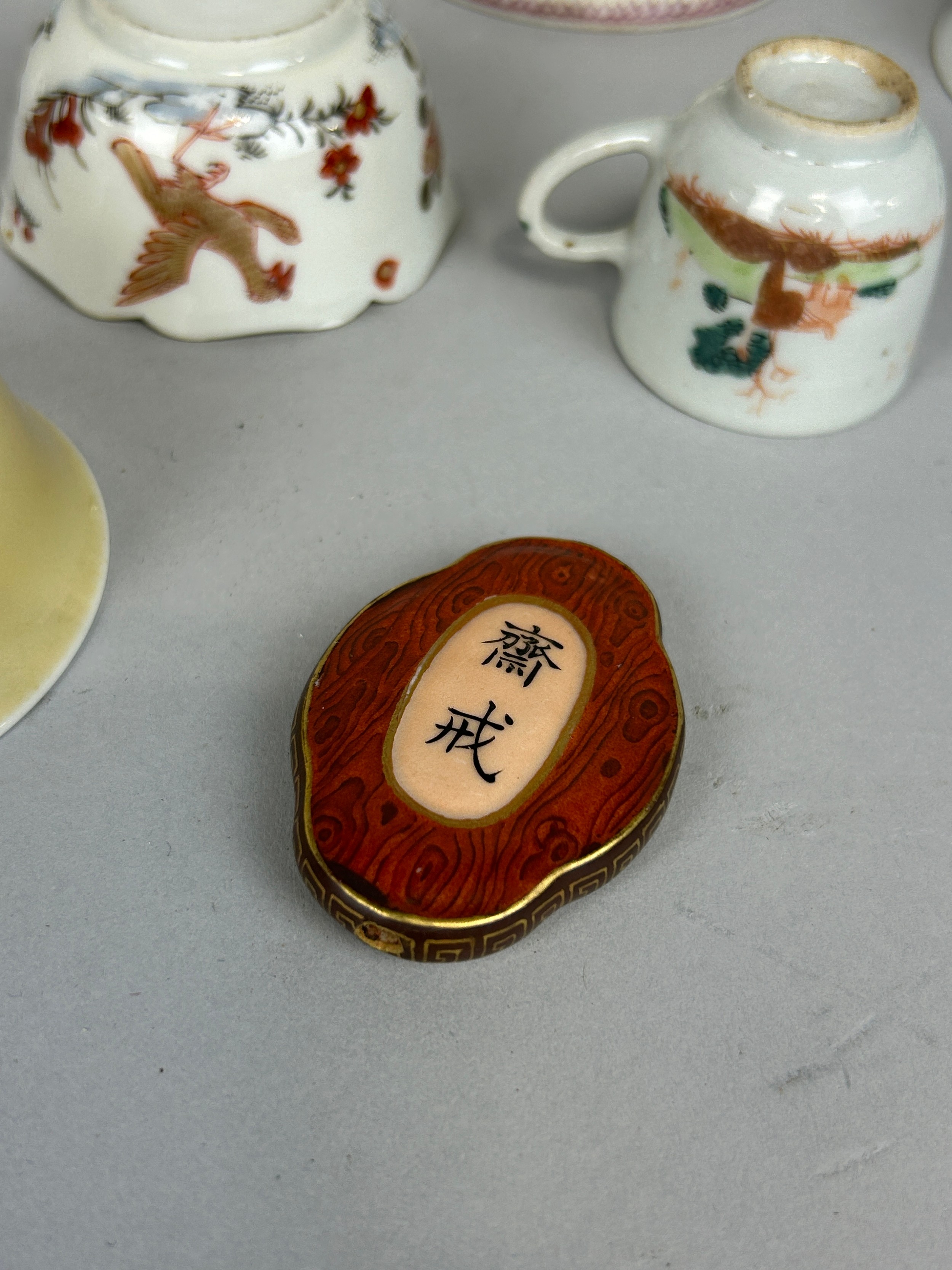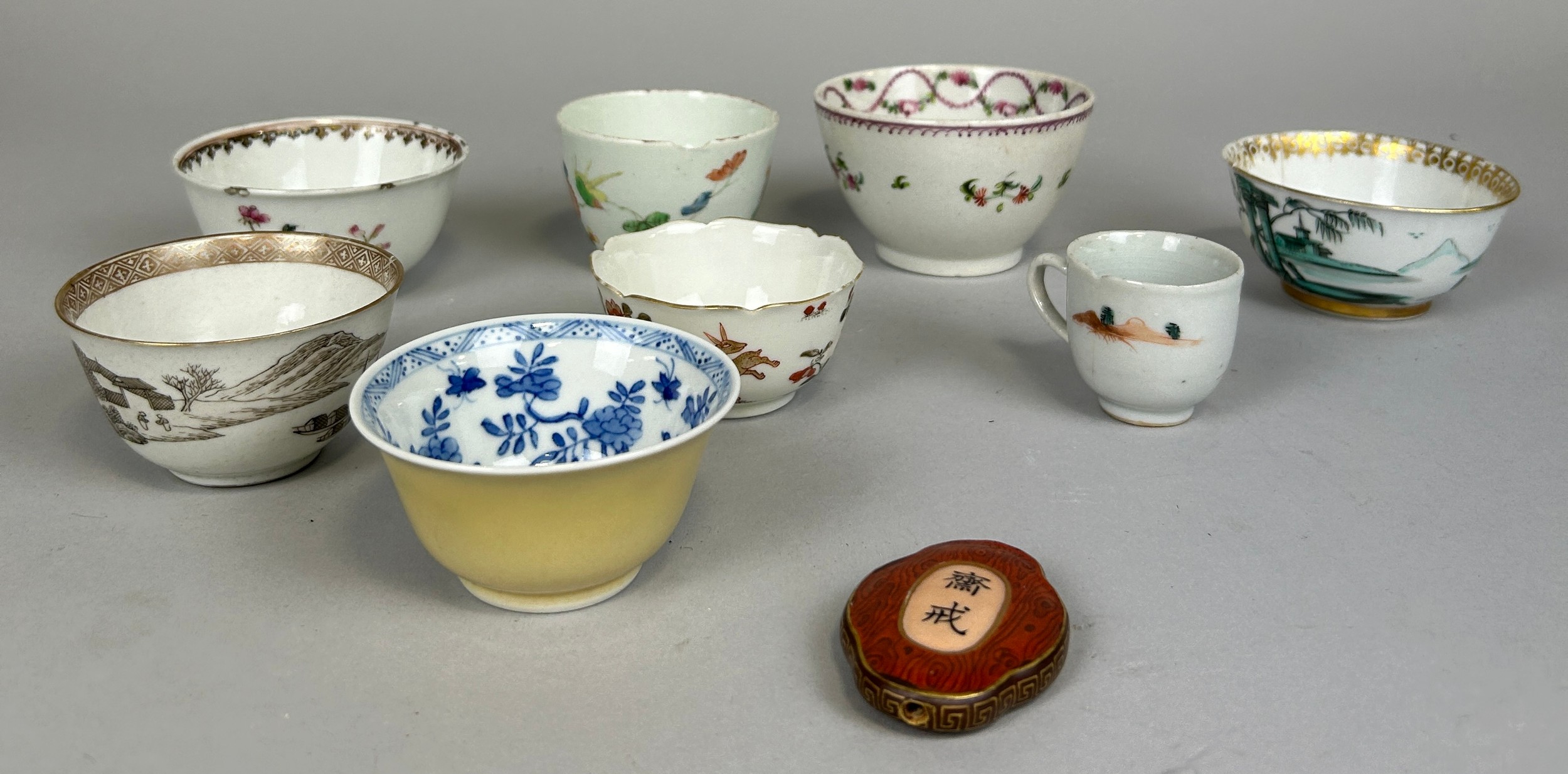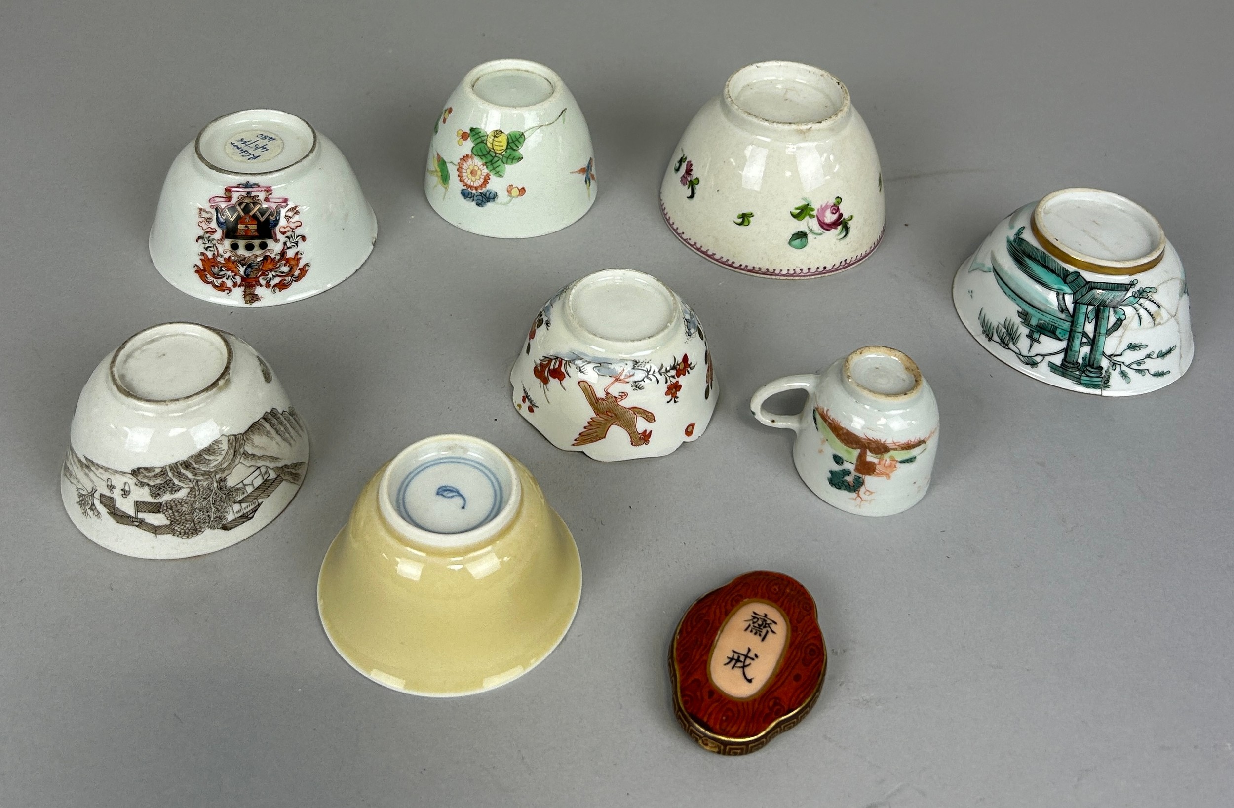 A COLLECTION OF CHINESE WINE CUPS INCLUDING ONE ARMORIAL ALONG WITH A SMALL PLAQUE,