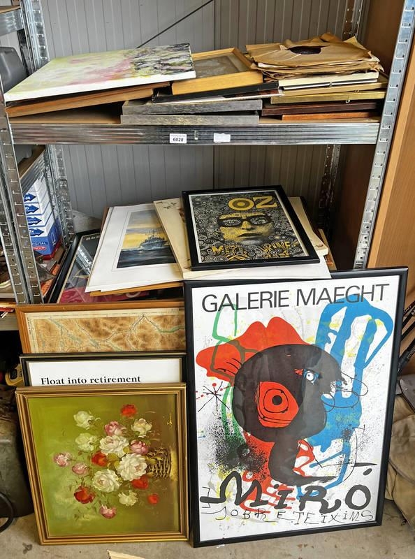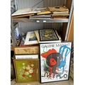 SELECTION OF FRAMED PRINTS, POSTERS ETC OVER ONE SHELVING UNIT