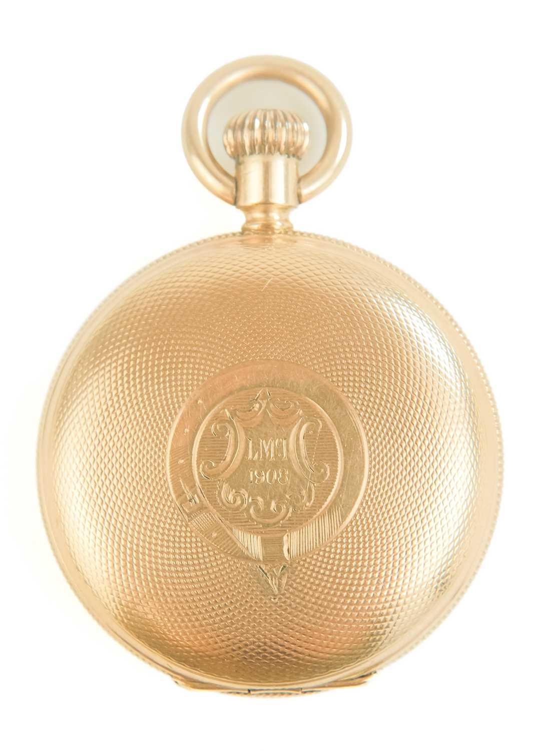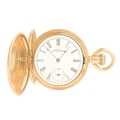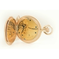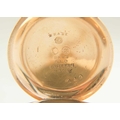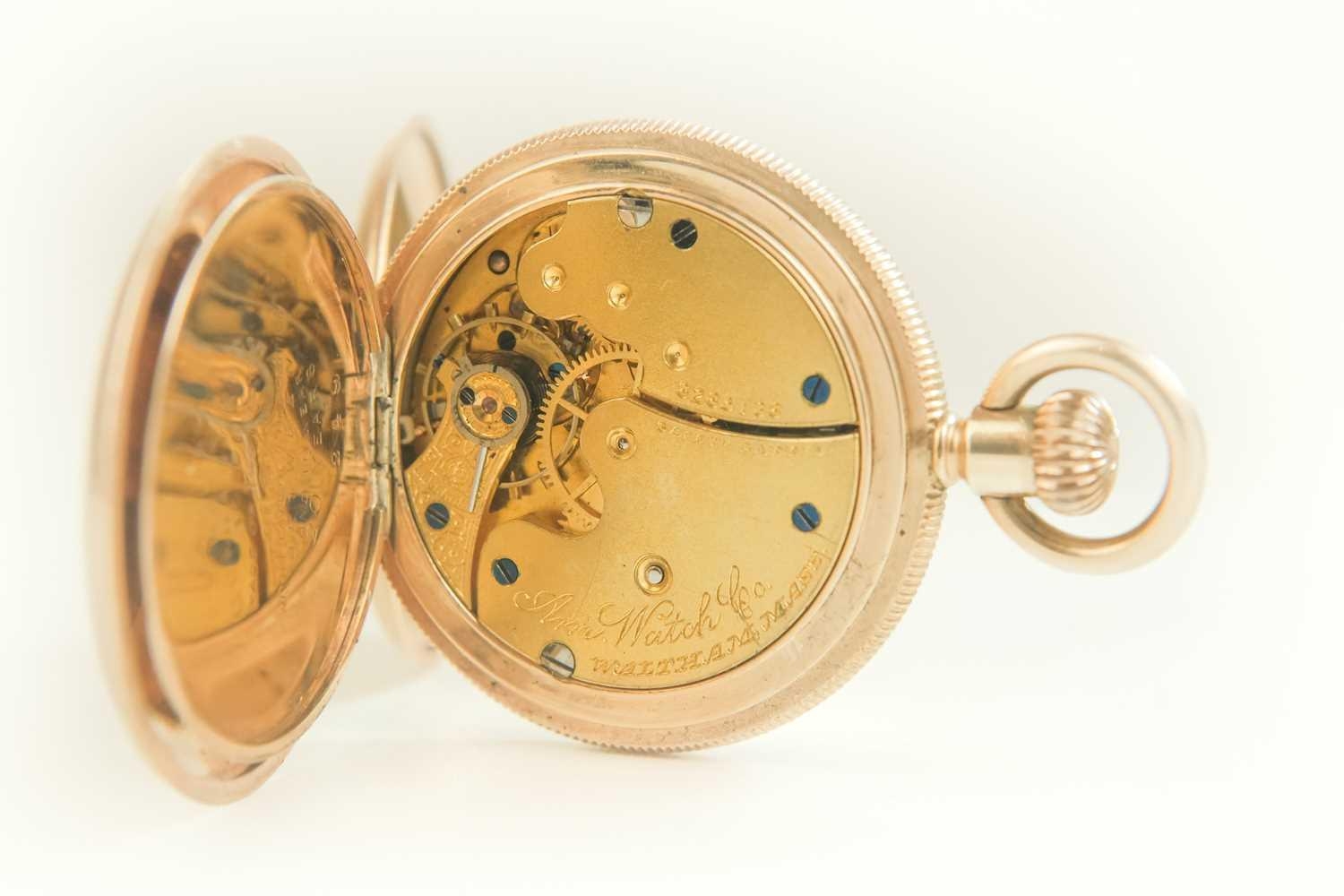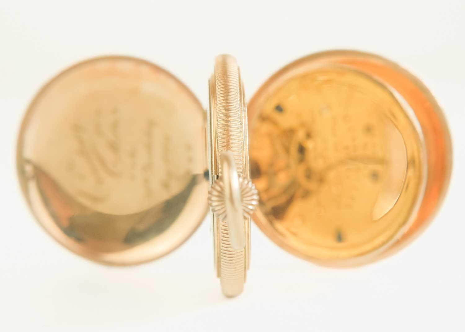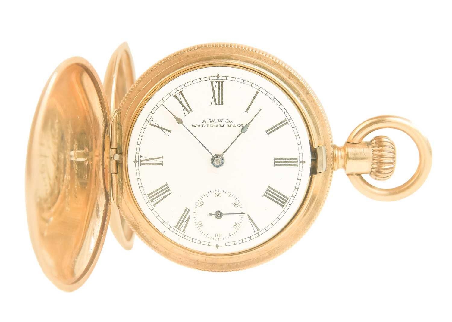 WALTHAM - A rose gold plated full hunter crown wind fob pocket watch. The signed 28mm dial with Roman numerals and subsidiary dial, signed three quarter plate movment no. 8285138, engine turned Dennison case, the cuvette with inscription, monogrammed and dated 1908 to the cartouche, 35mm. Winds and runs.