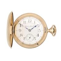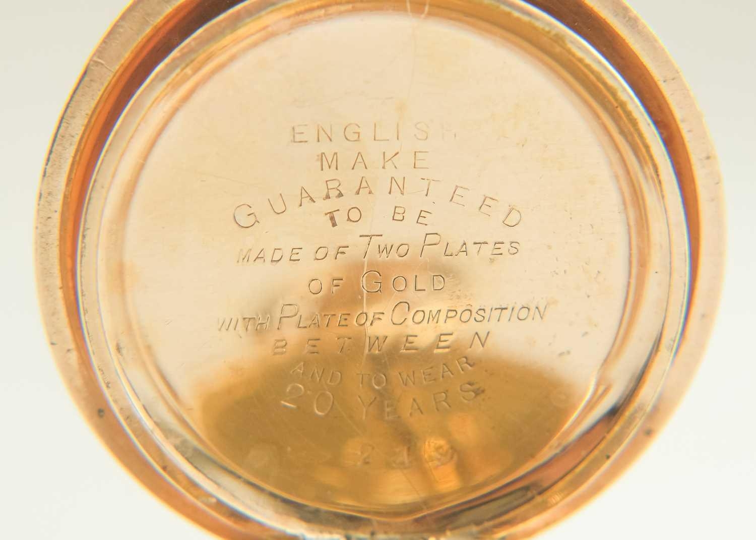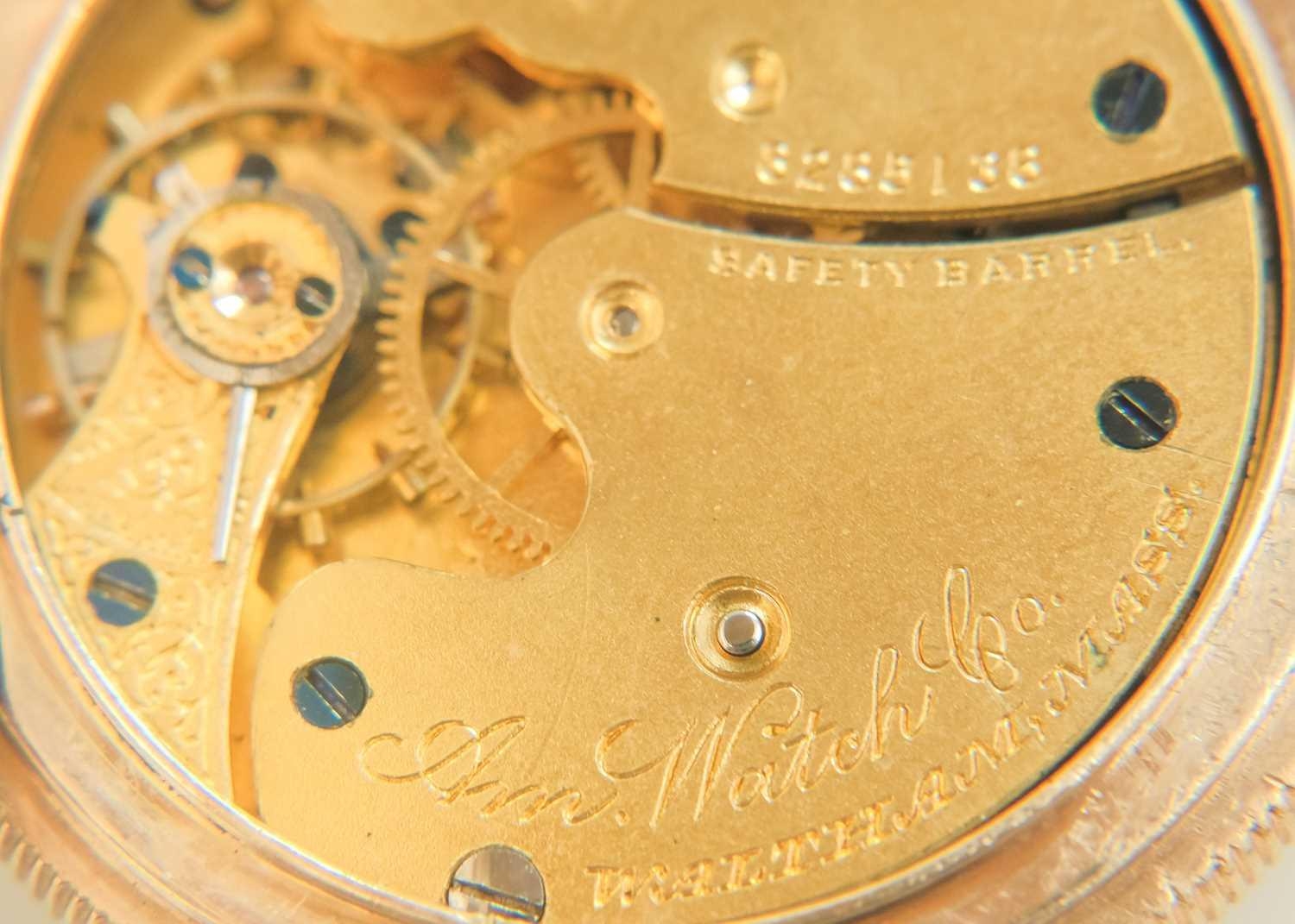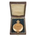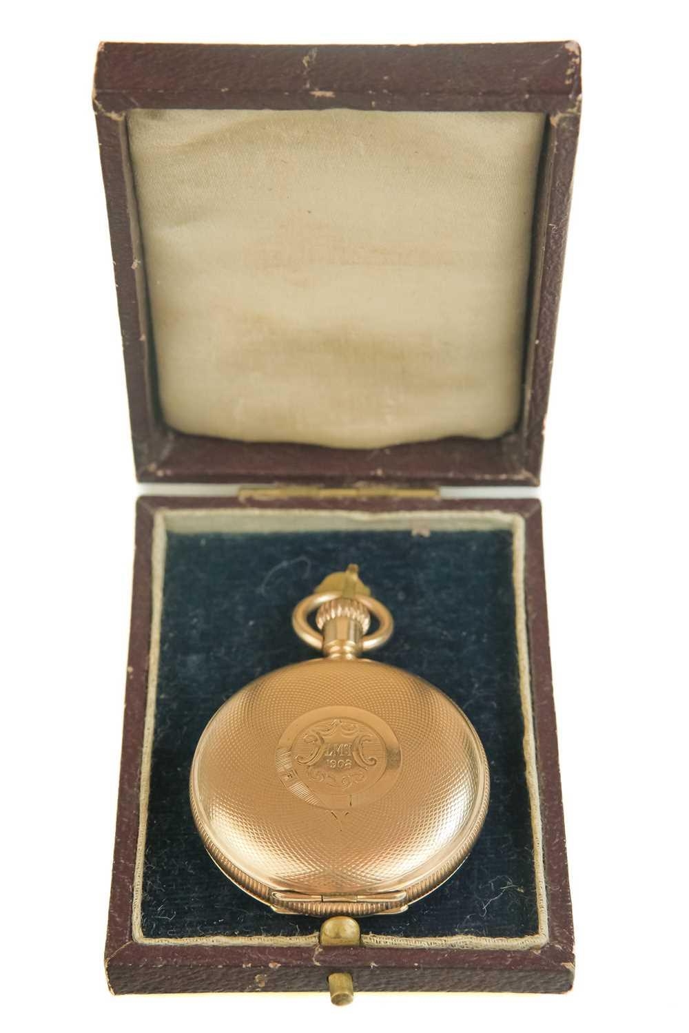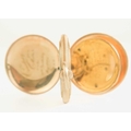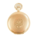 WALTHAM - A rose gold plated full hunter crown wind fob pocket watch. The signed 28mm dial with Roman numerals and subsidiary dial, signed three quarter plate movment no. 8285138, engine turned Dennison case, the cuvette with inscription, monogrammed and dated 1908 to the cartouche, 35mm. Winds and runs.