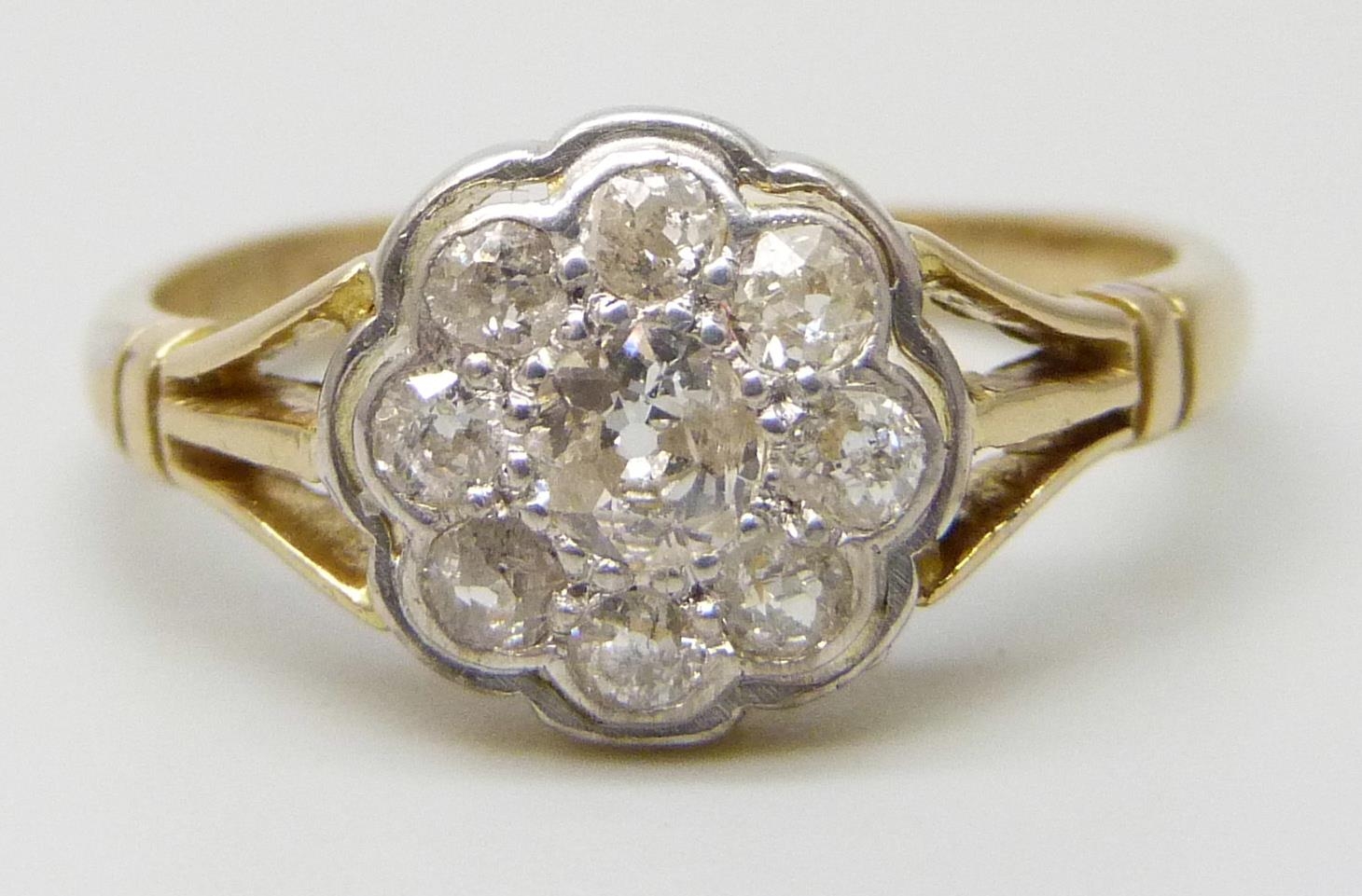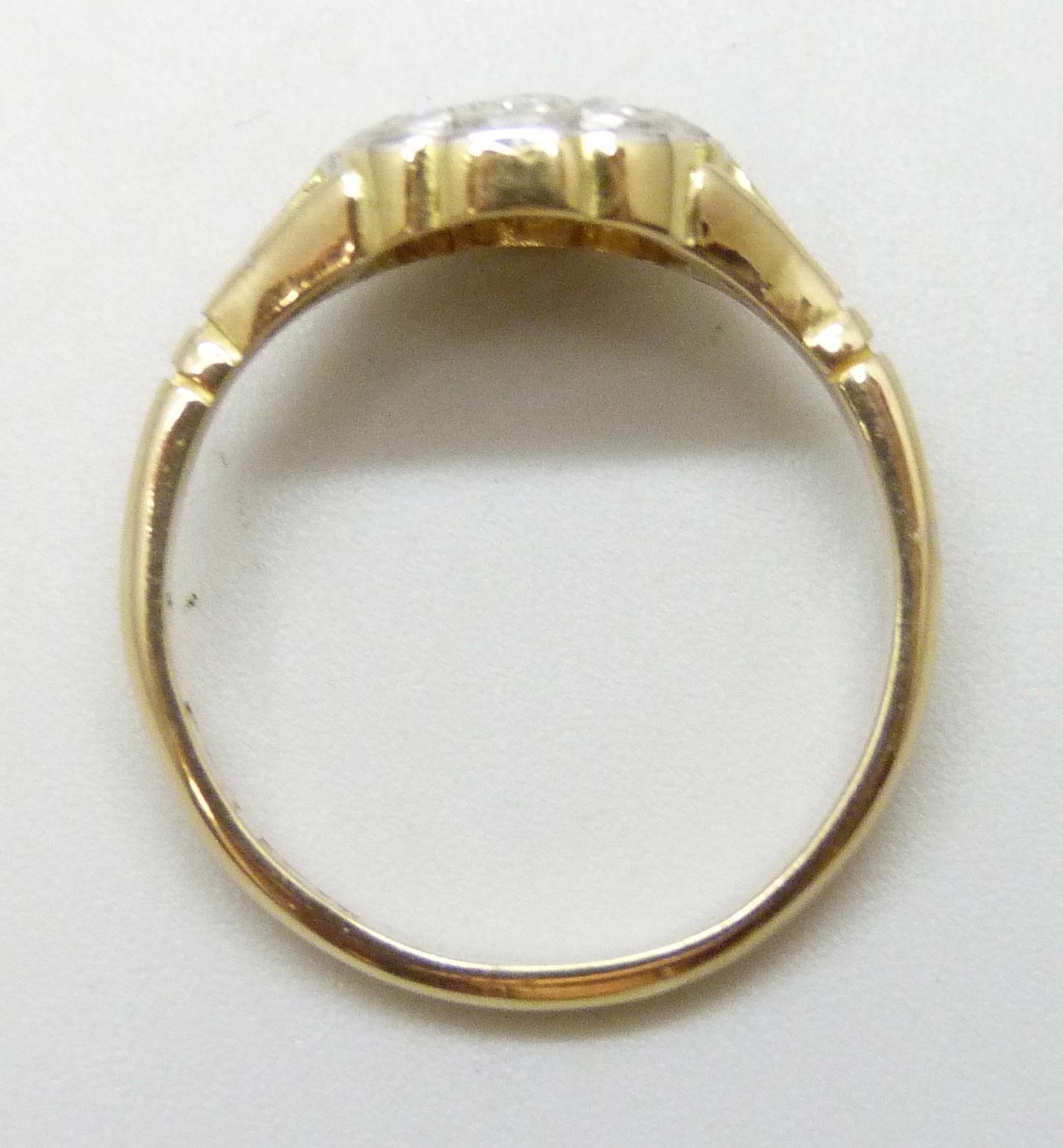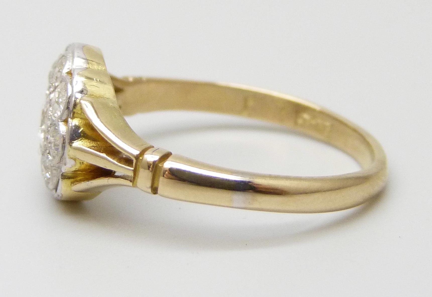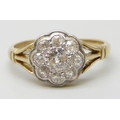 An Edwardian 18ct gold flat bed diamond set daisy cluster ring, 3g, N