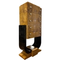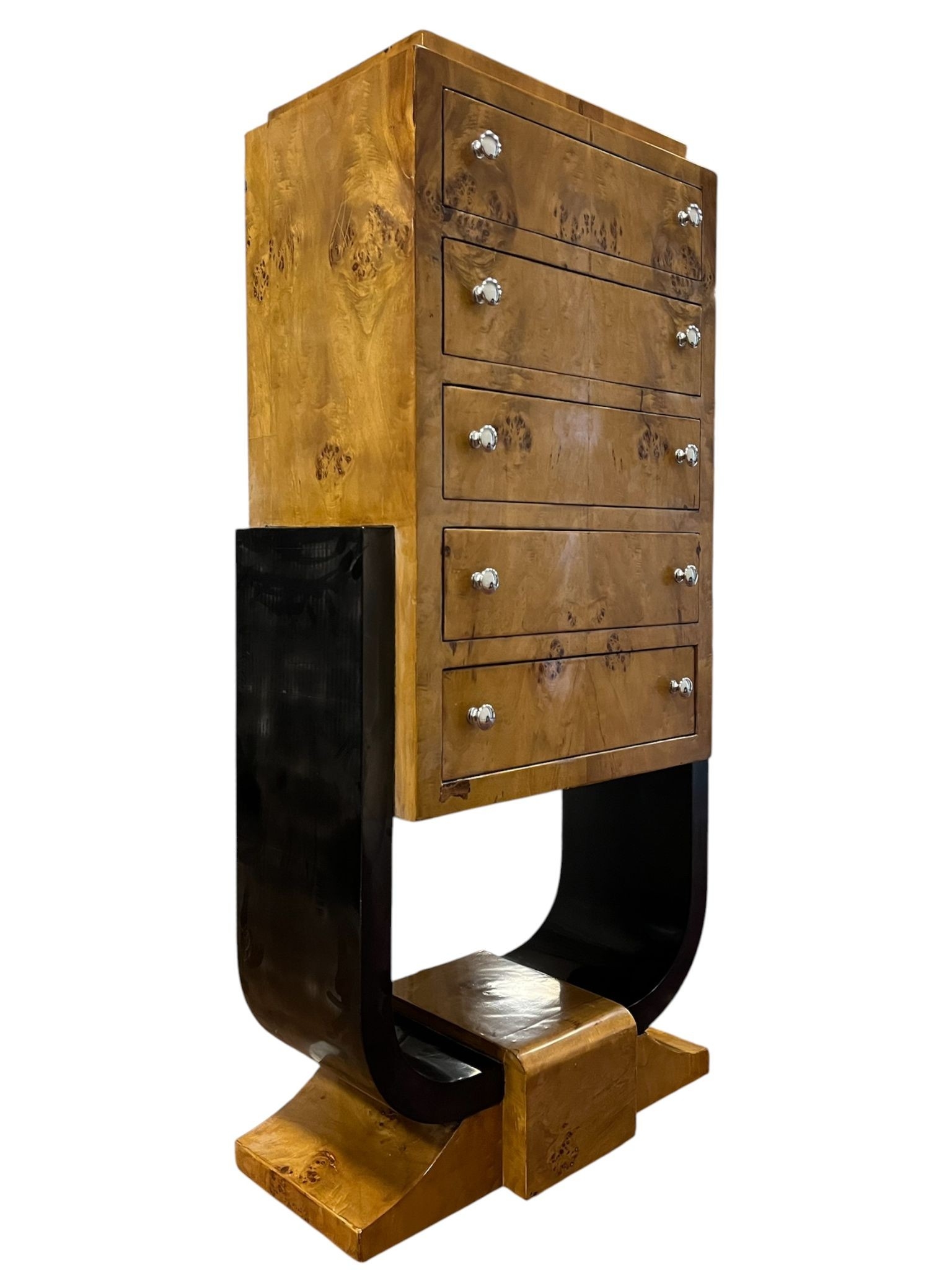 AN ART DECO STYLE BURR WALNUT AND EBONISED CHEST the stepped moulded top above four long drawers raised on a U-shaped support on spreading platform base 130cm (h) x 63cm (w) x 32cm (d)