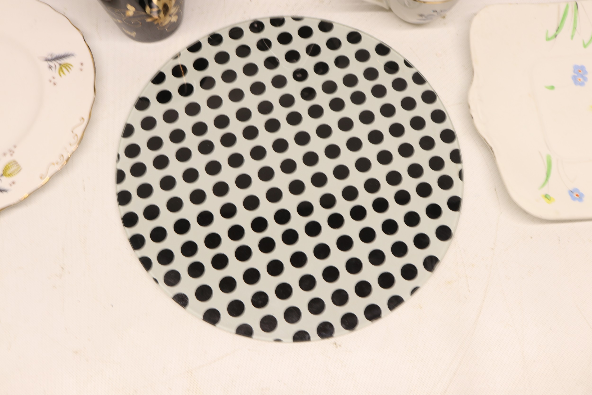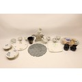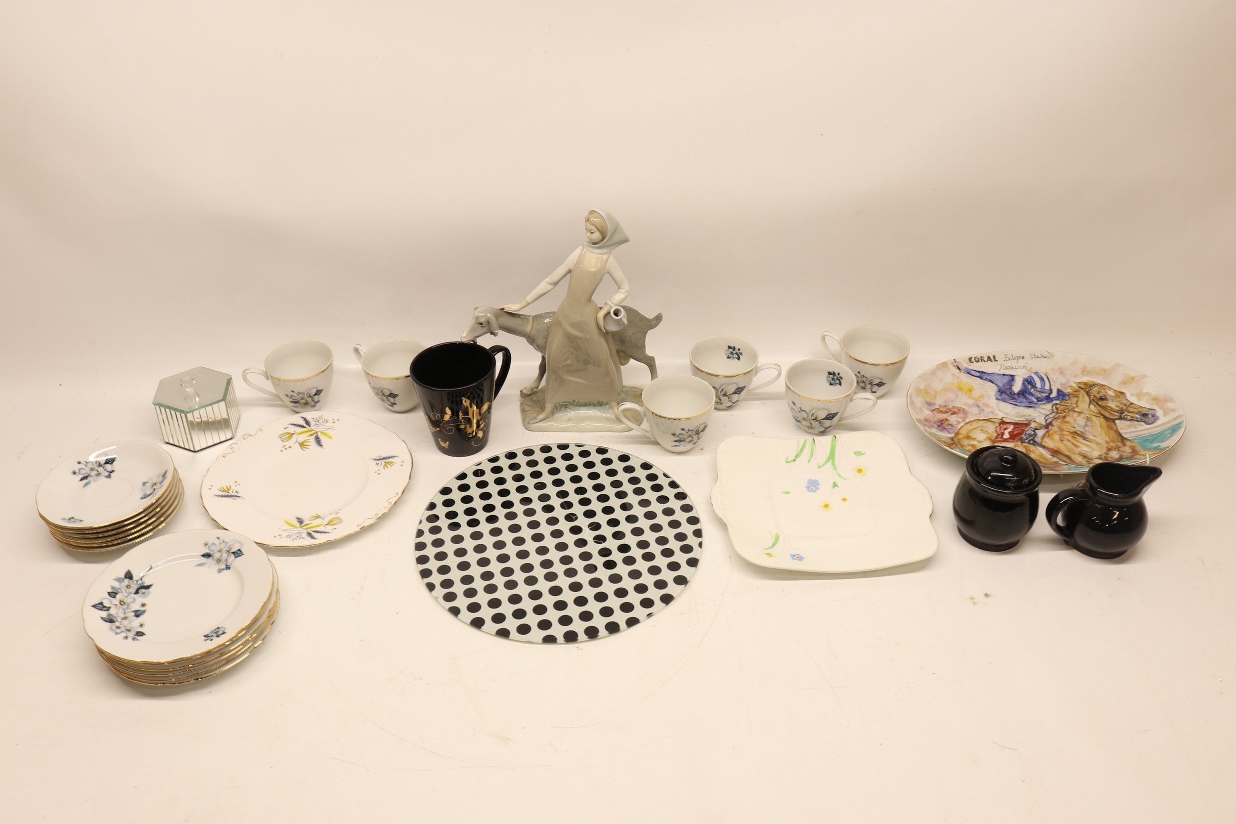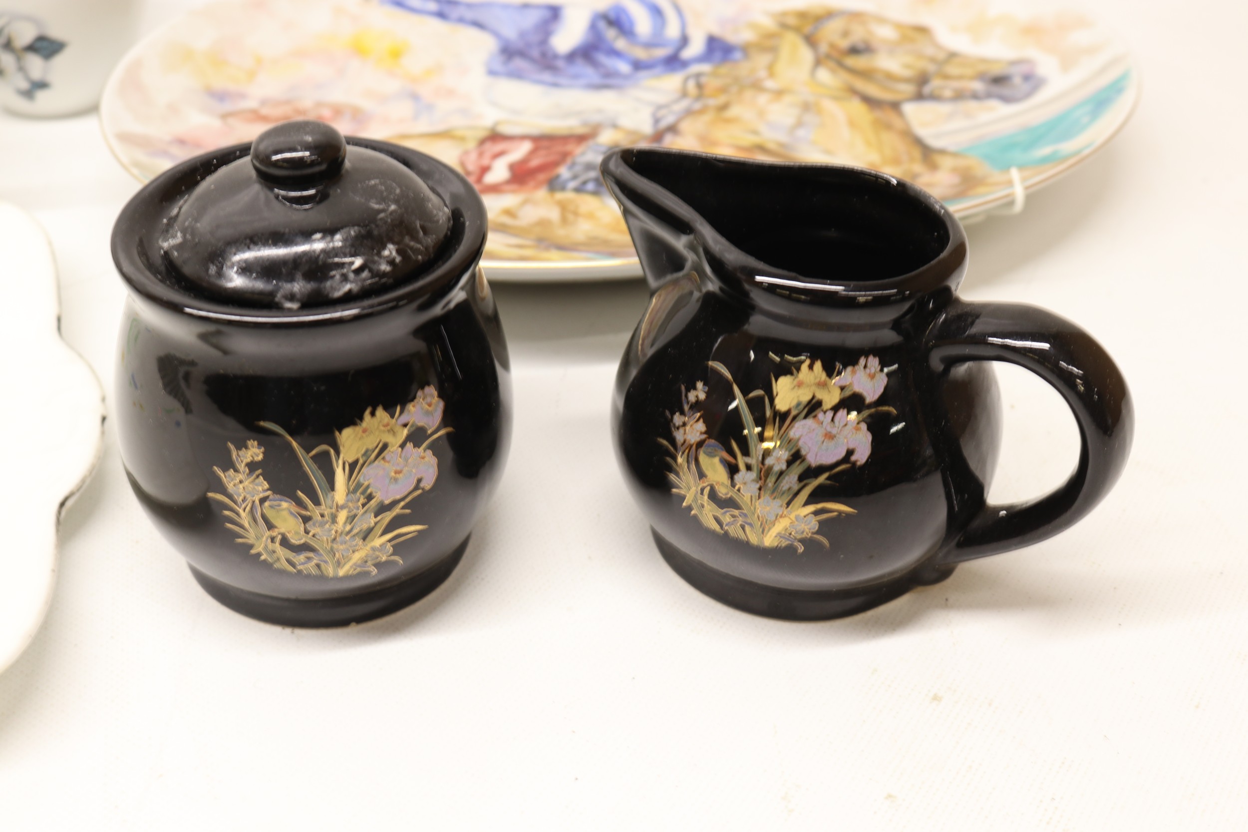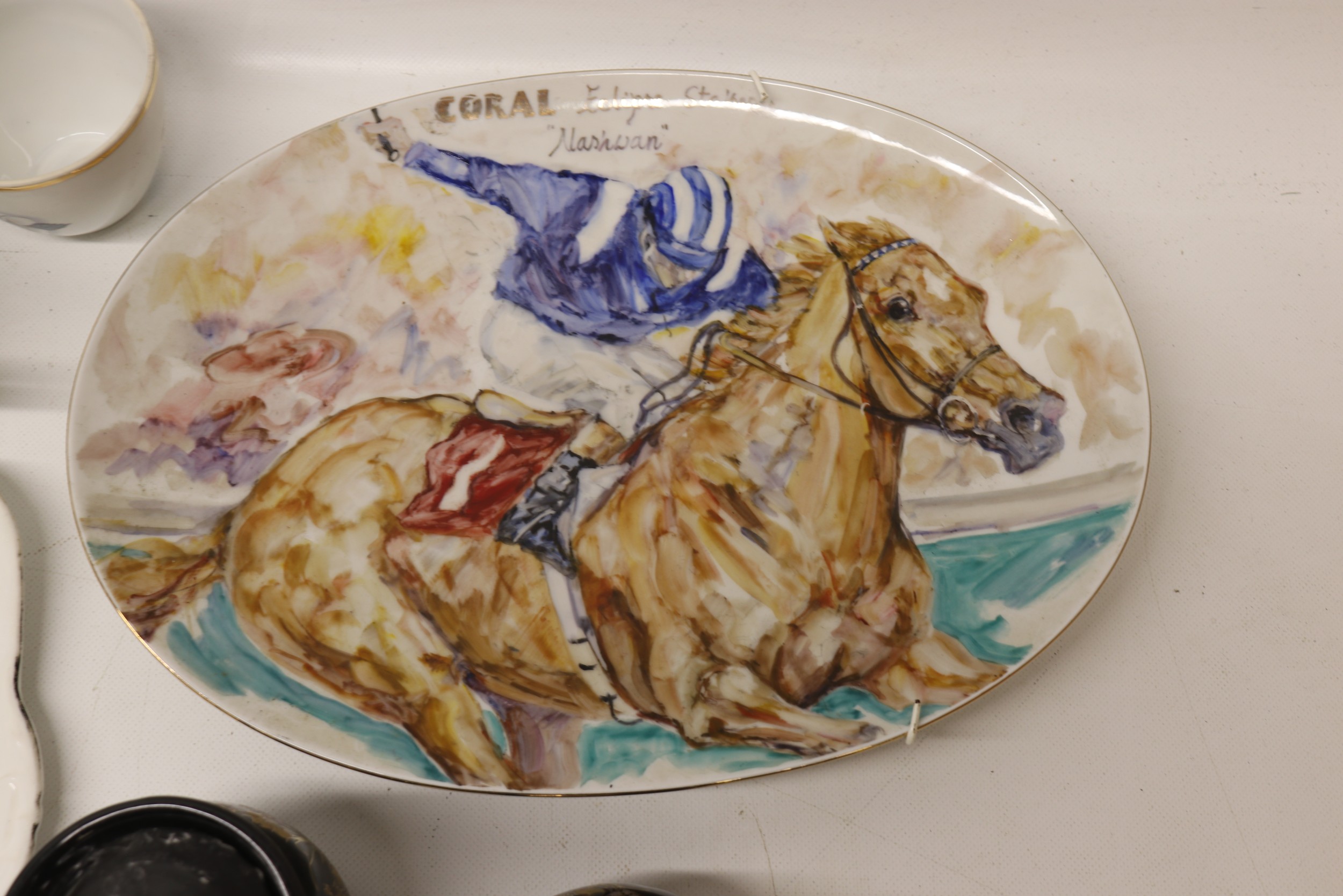 The Peter Shilton Collection: Assorted collection of ceramics/general ware incl. cups and saucers, serving plates, hand-painted horse-racing themed plate etc., Qty 1 box