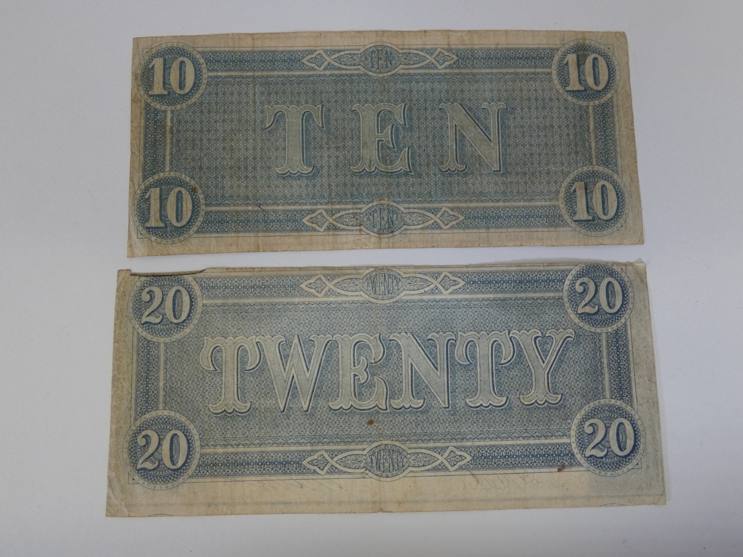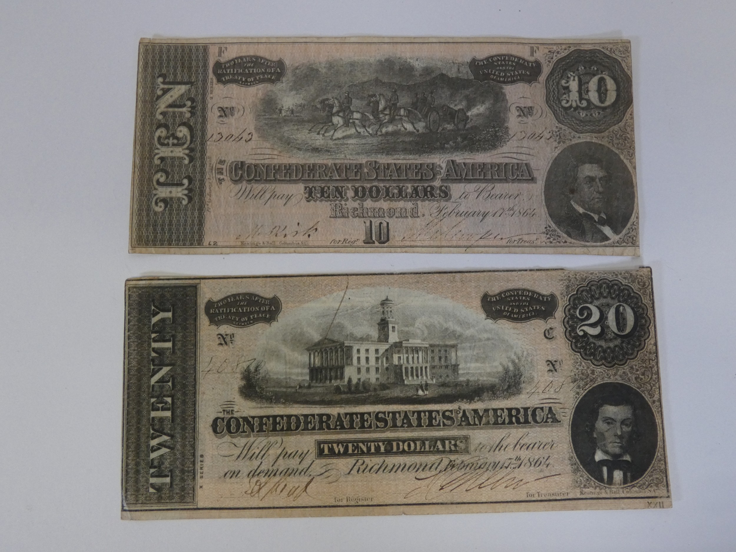 Confederate States America ten and twenty dollars banknotes, Richmond, February 1864. (2)