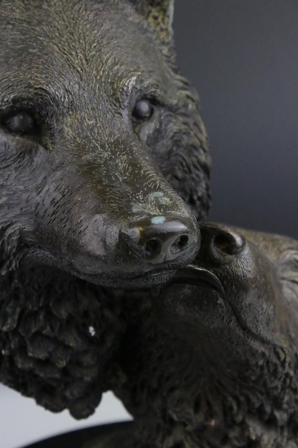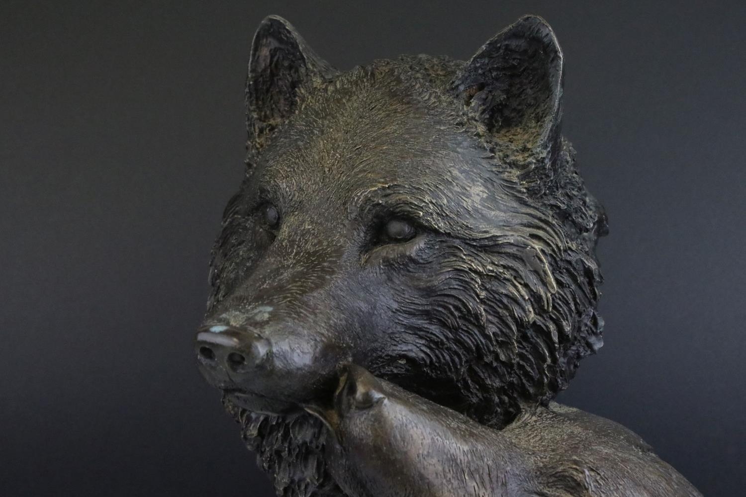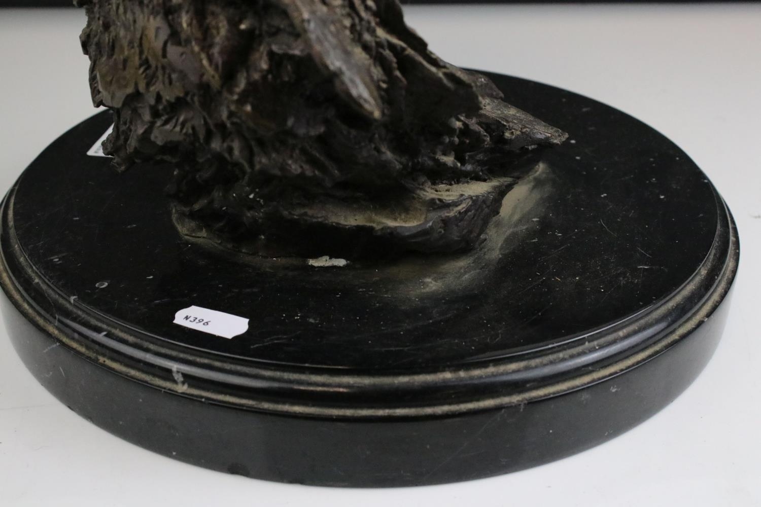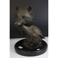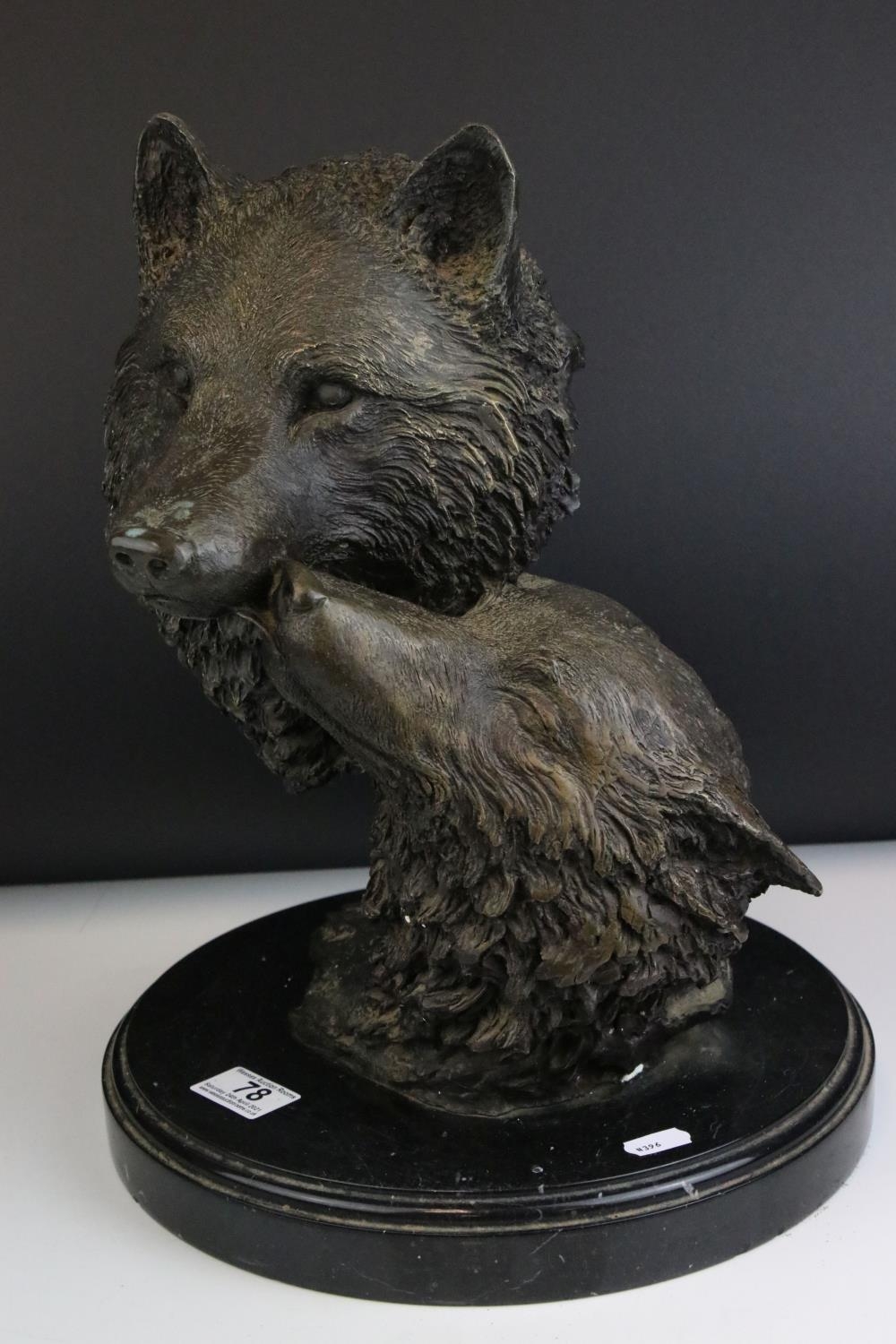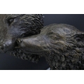 Contemporary Bronze Sculpture of Two Wolves Heads raised on a circular marble plinth, signed Bower ?, 41cms high