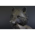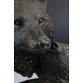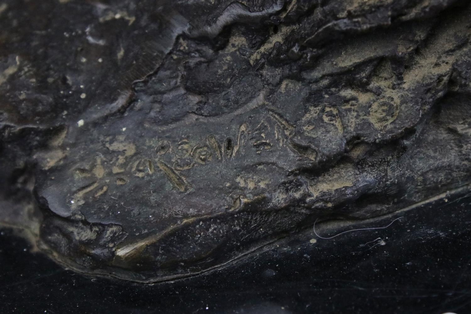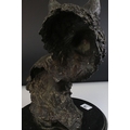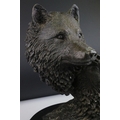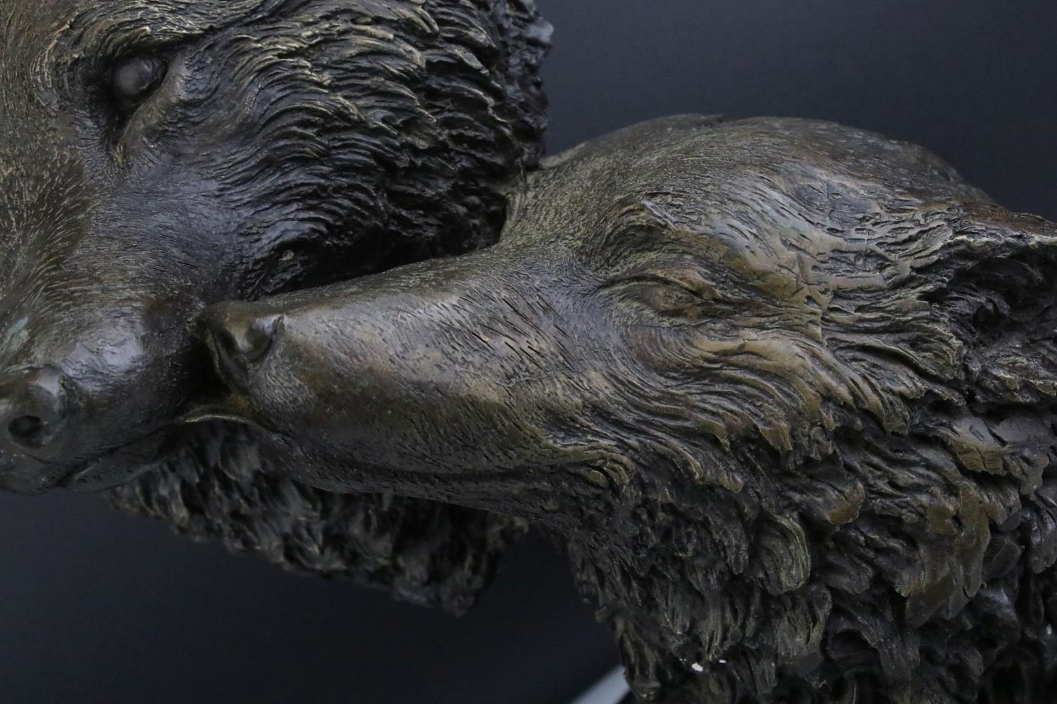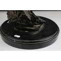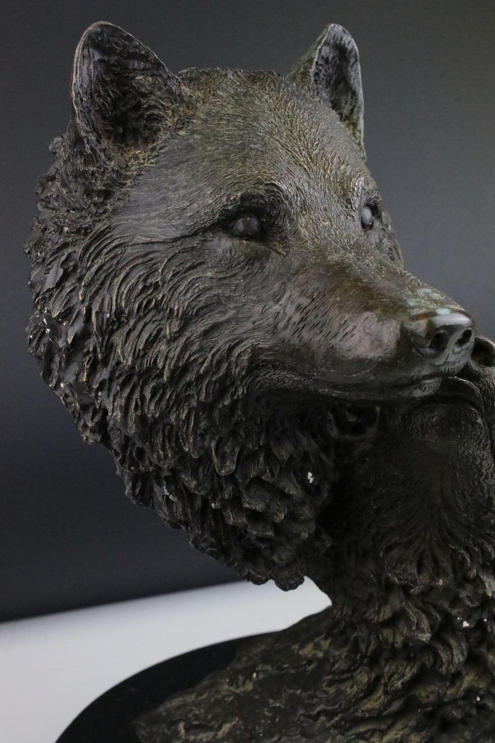 Contemporary Bronze Sculpture of Two Wolves Heads raised on a circular marble plinth, signed Bower ?, 41cms high