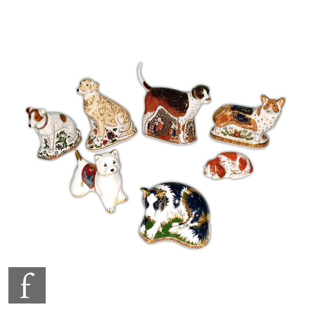 Eight Royal Crown Derby Dog paperweights to include Lurcher made exclusively for Sinclairs, numbered 525 of 750, Foxhound made exclusively for Sinclairs, West Highland Terrier, Labrador, Parson Jack Russel Terrier, Border Collie numbered 1106 of 2500, The Royal Windsor Corgi Commissioned by Peter Jones of Wakefield to commemorate the 80th Birthday of her Majesty the Queen II and Puppy made exclusively for the collectors guild, all with printed marks, all with gold stoppers, all boxed bar Puppy. (8)