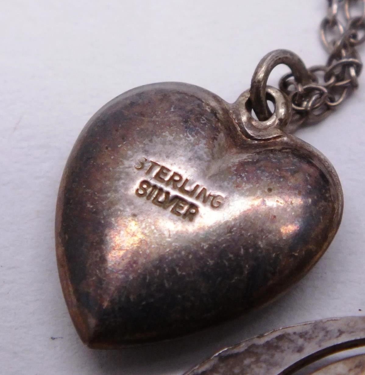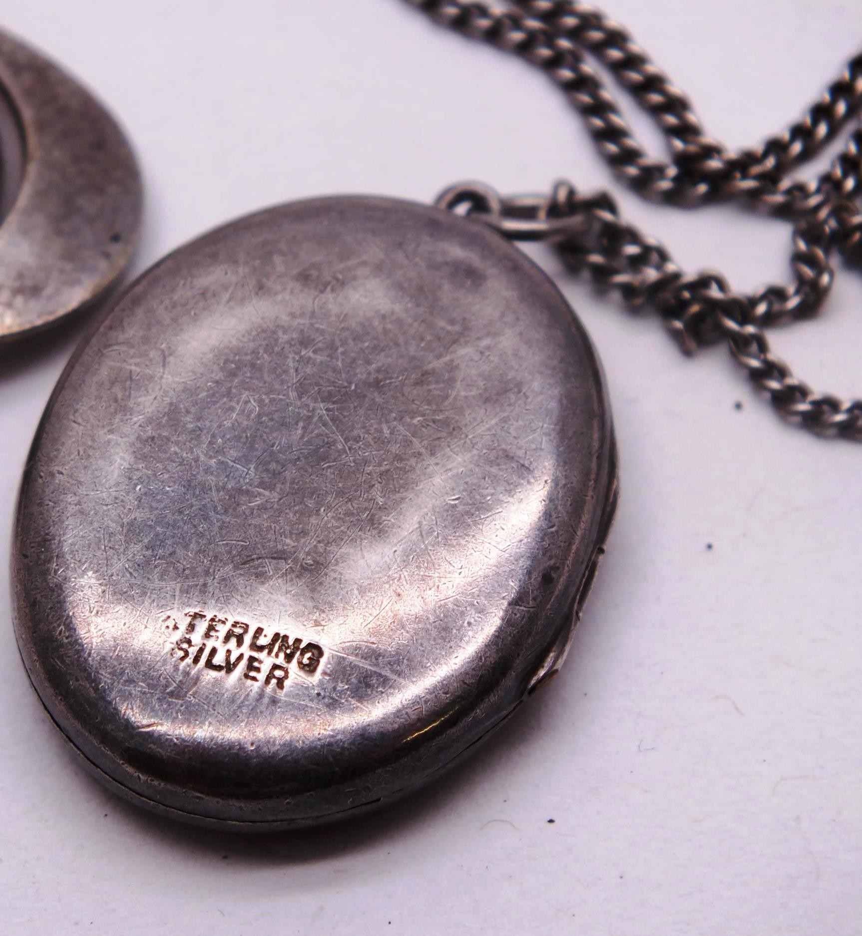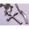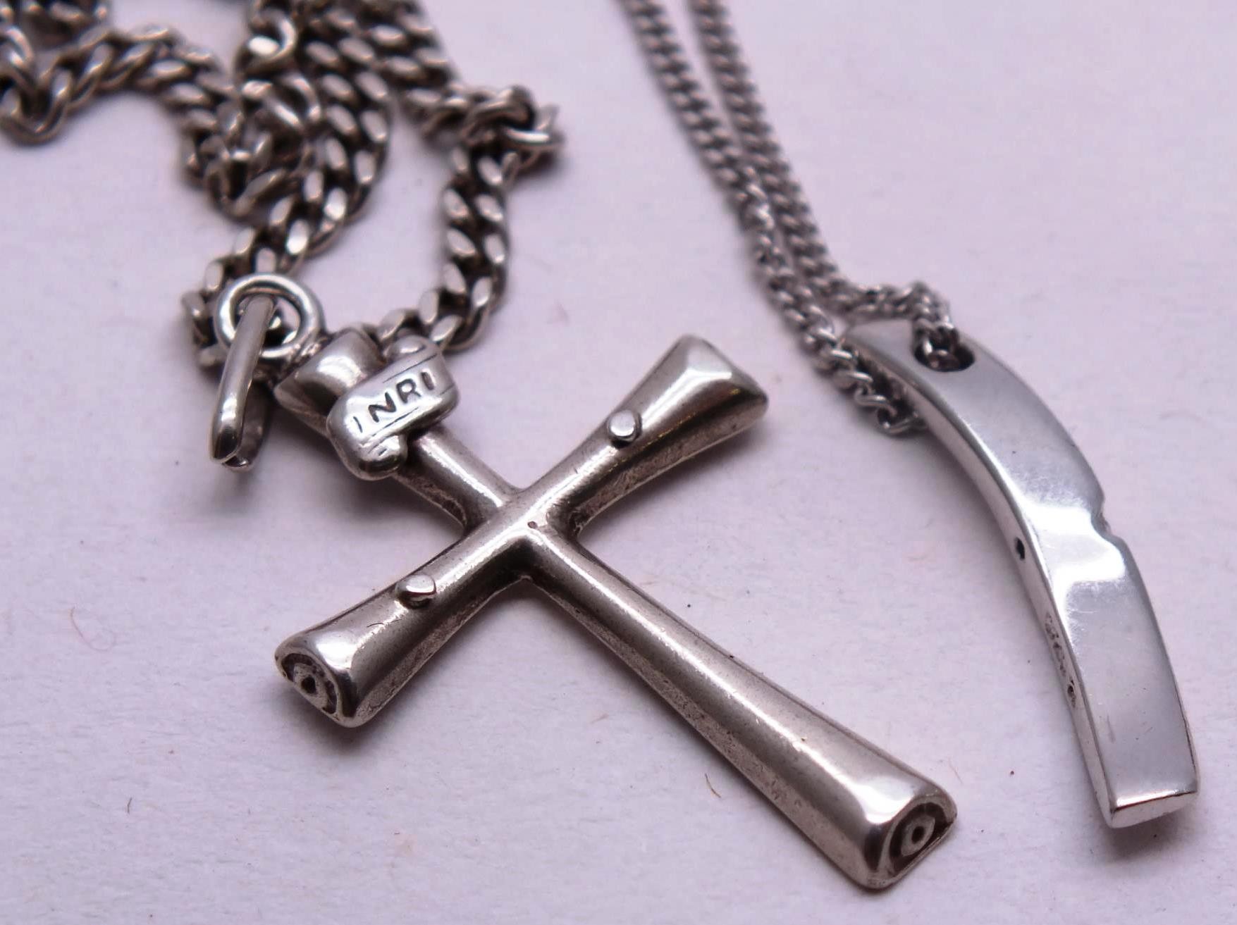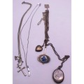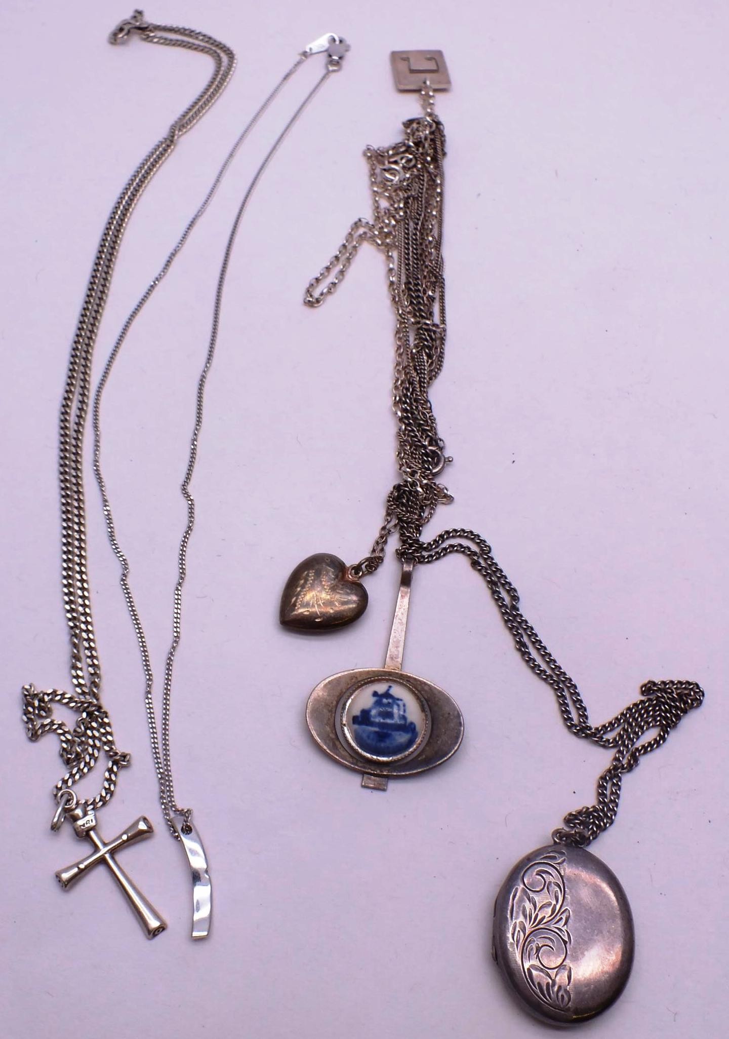 SIX STERLING SILVER NECKLACES, LOCKETS, CROSSES ETC.