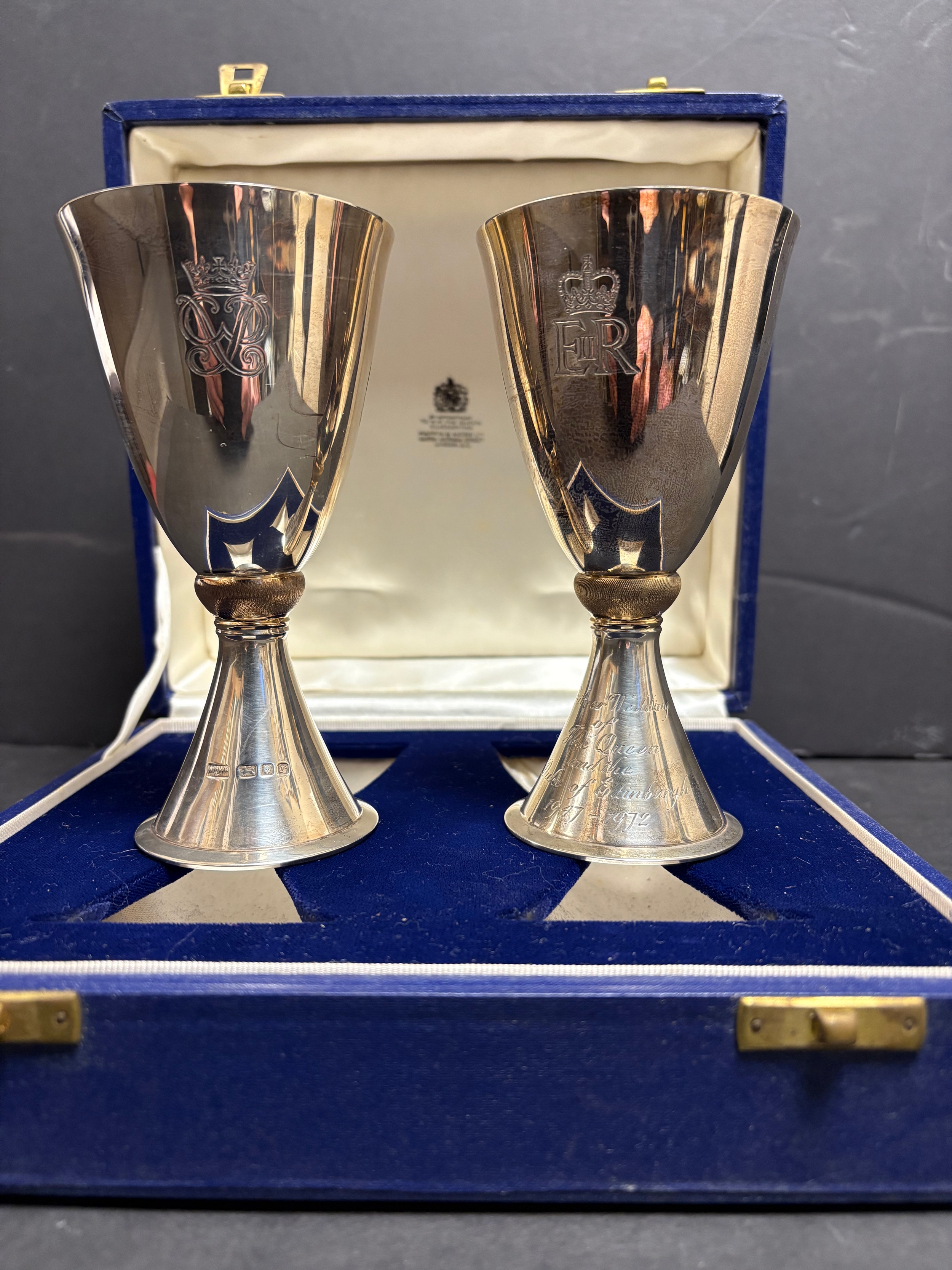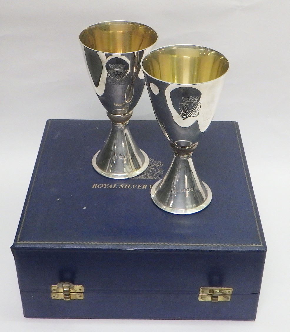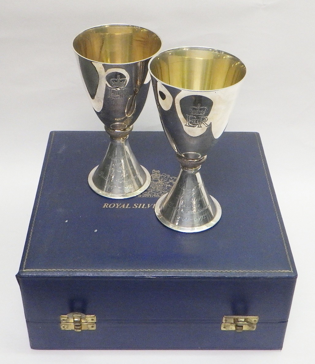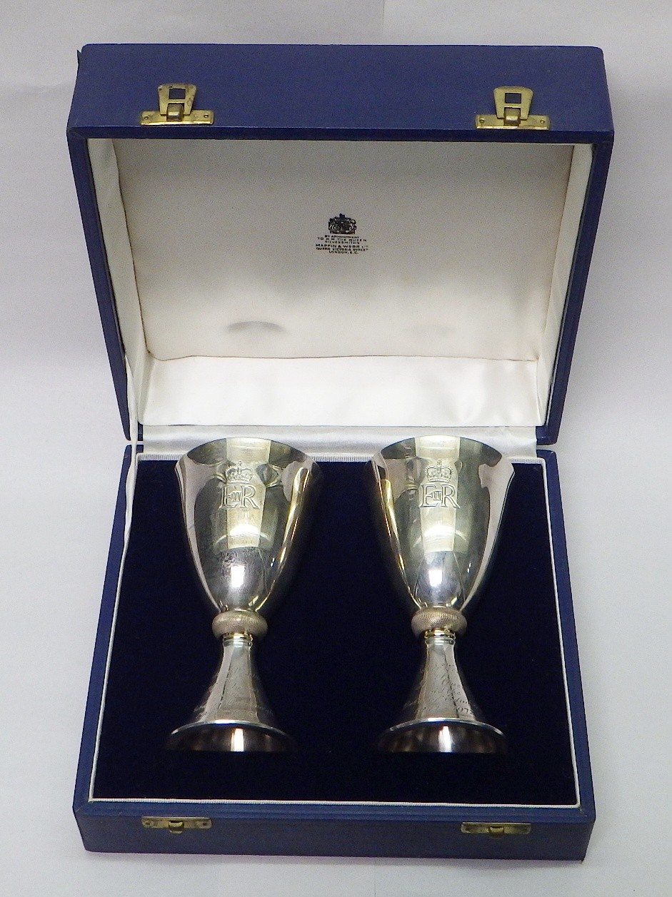 A pair of Mappin & Webb Elizabeth II Royal Silver Wedding silver goblets designed by Colin Hillier, no.551 & 552/1000, 440g