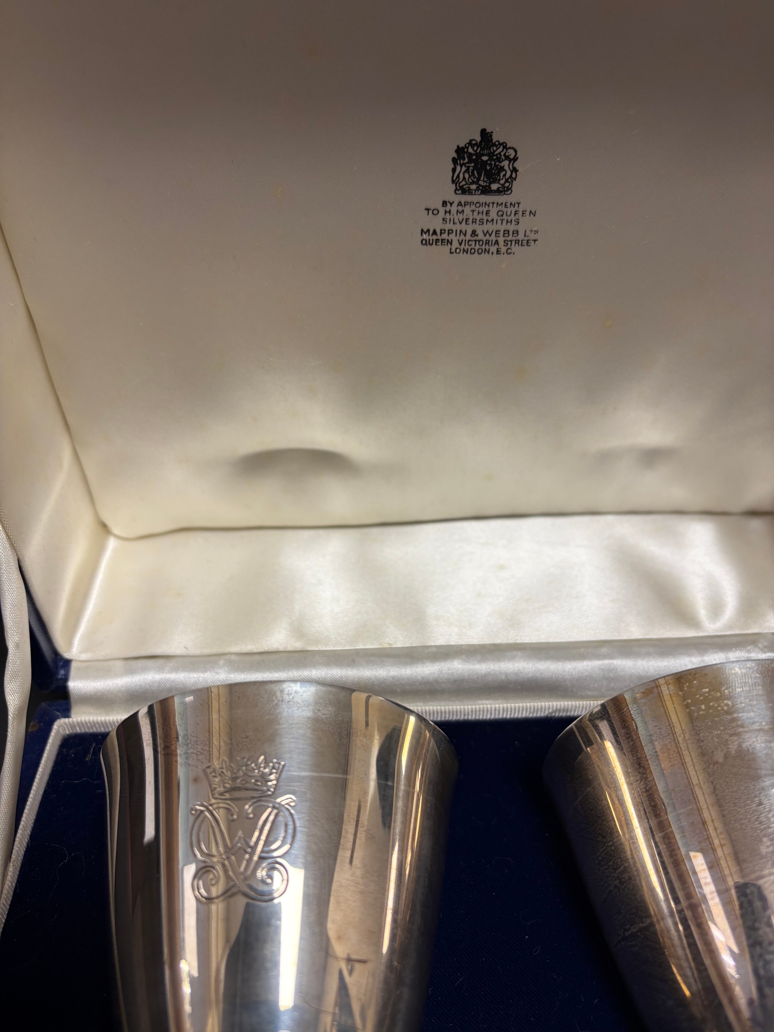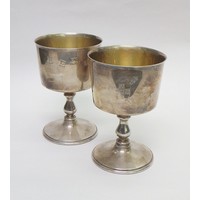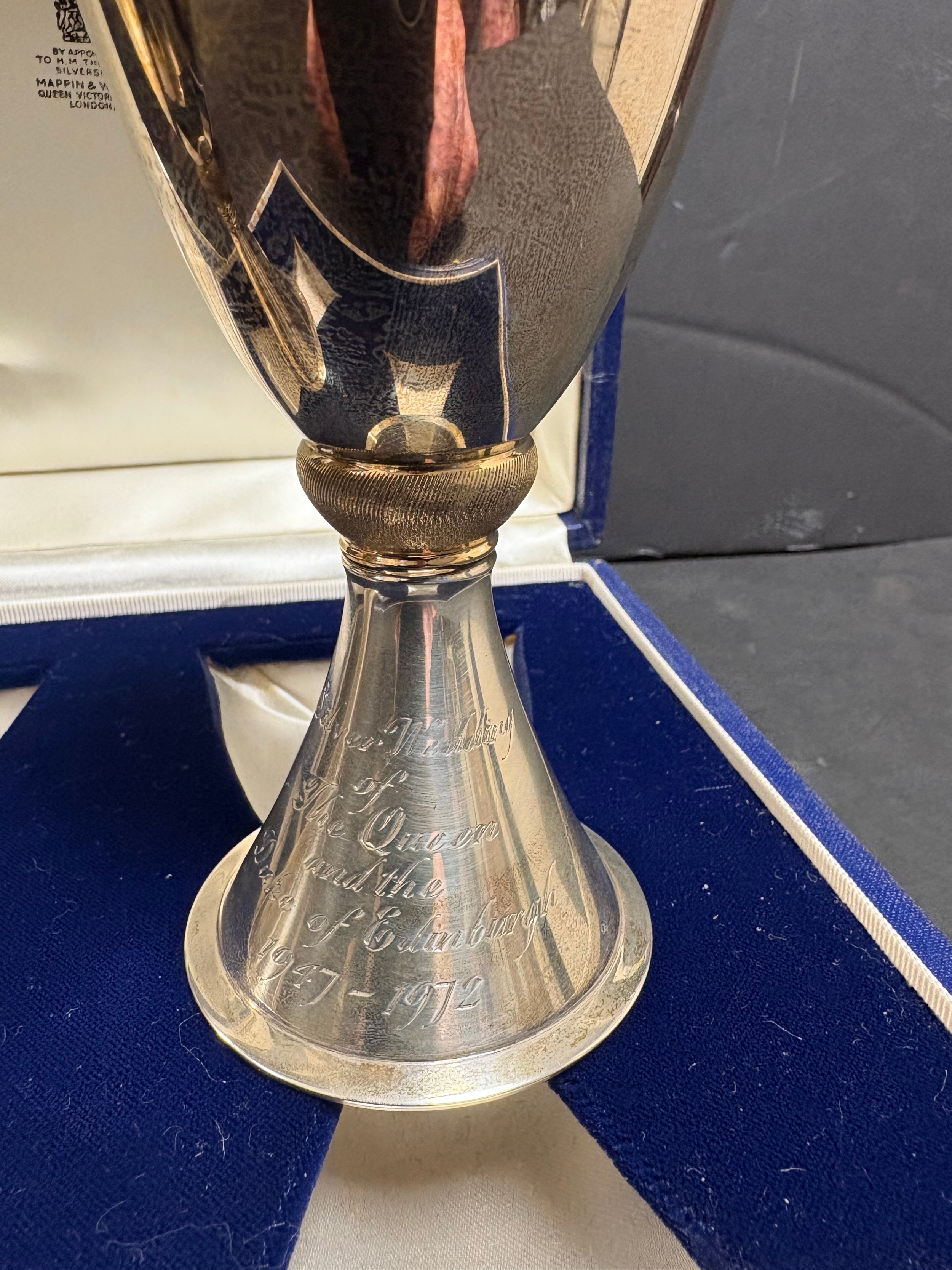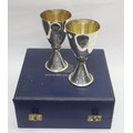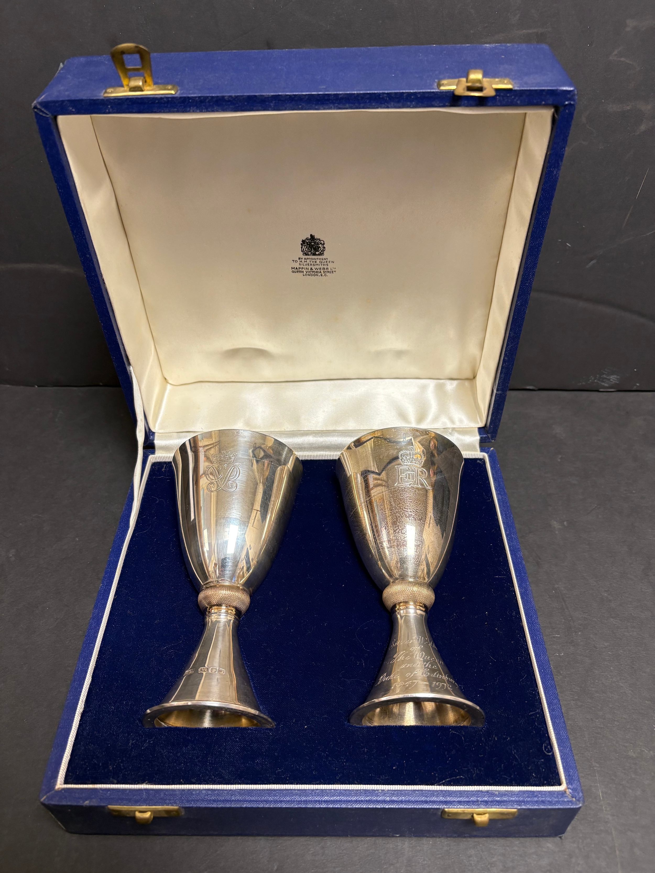 A pair of Mappin & Webb Elizabeth II Royal Silver Wedding silver goblets designed by Colin Hillier, no.551 & 552/1000, 440g