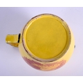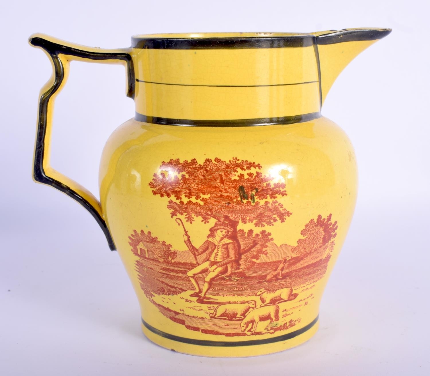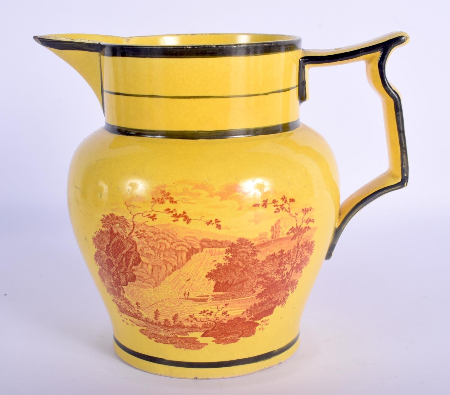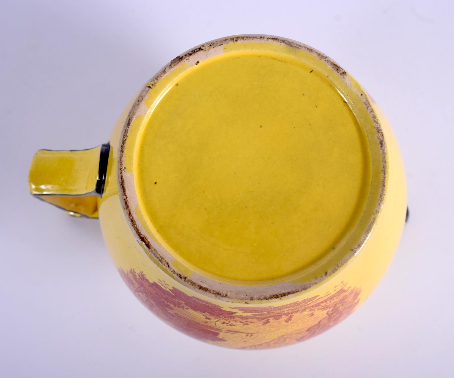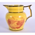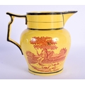 A RARE EARLY 19TH CENTURY CANARY YELLOW POTTERY JUG printed with red landscapes. 13 cm x 13 cm.