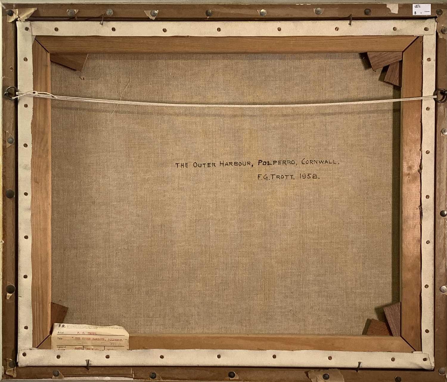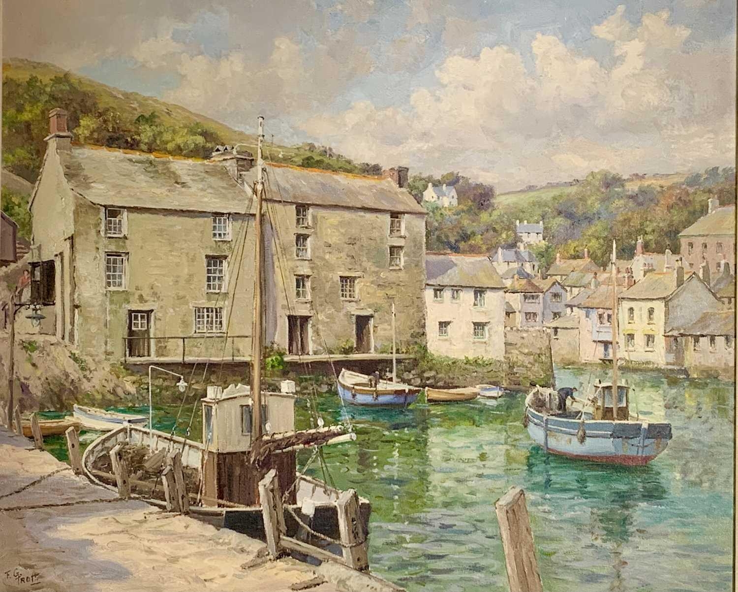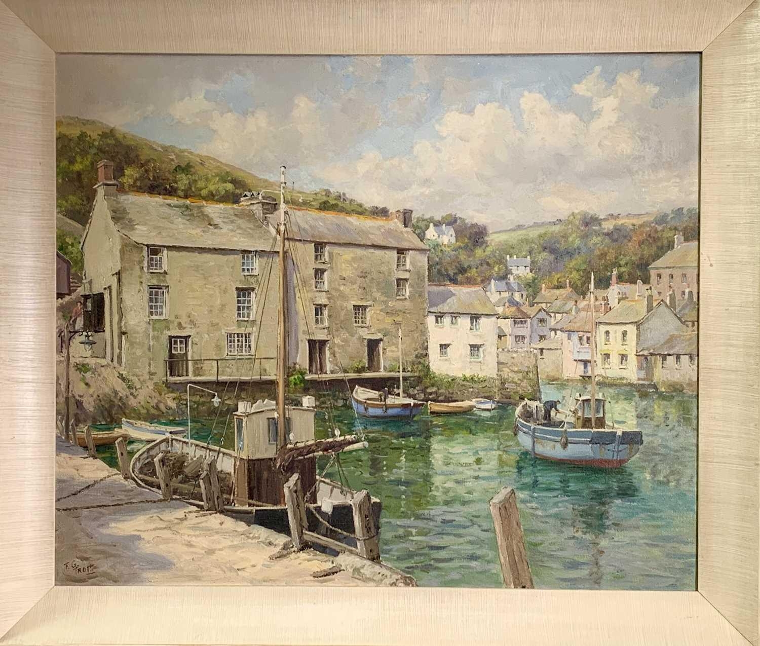 Frank George TROTT (1884-1957) The Outer Harbour, Polperro, Cornwall Oil on canvas Signed Further signed, inscribed and dated 1958 to verso 51 x 61cm