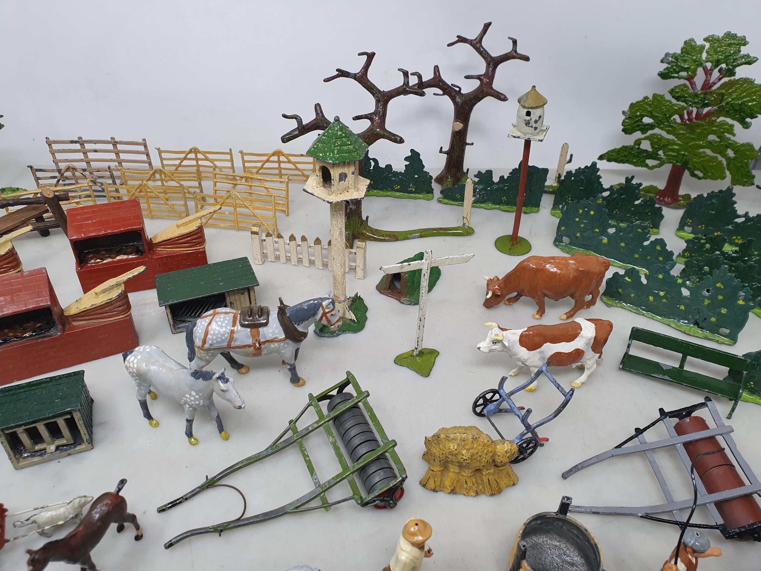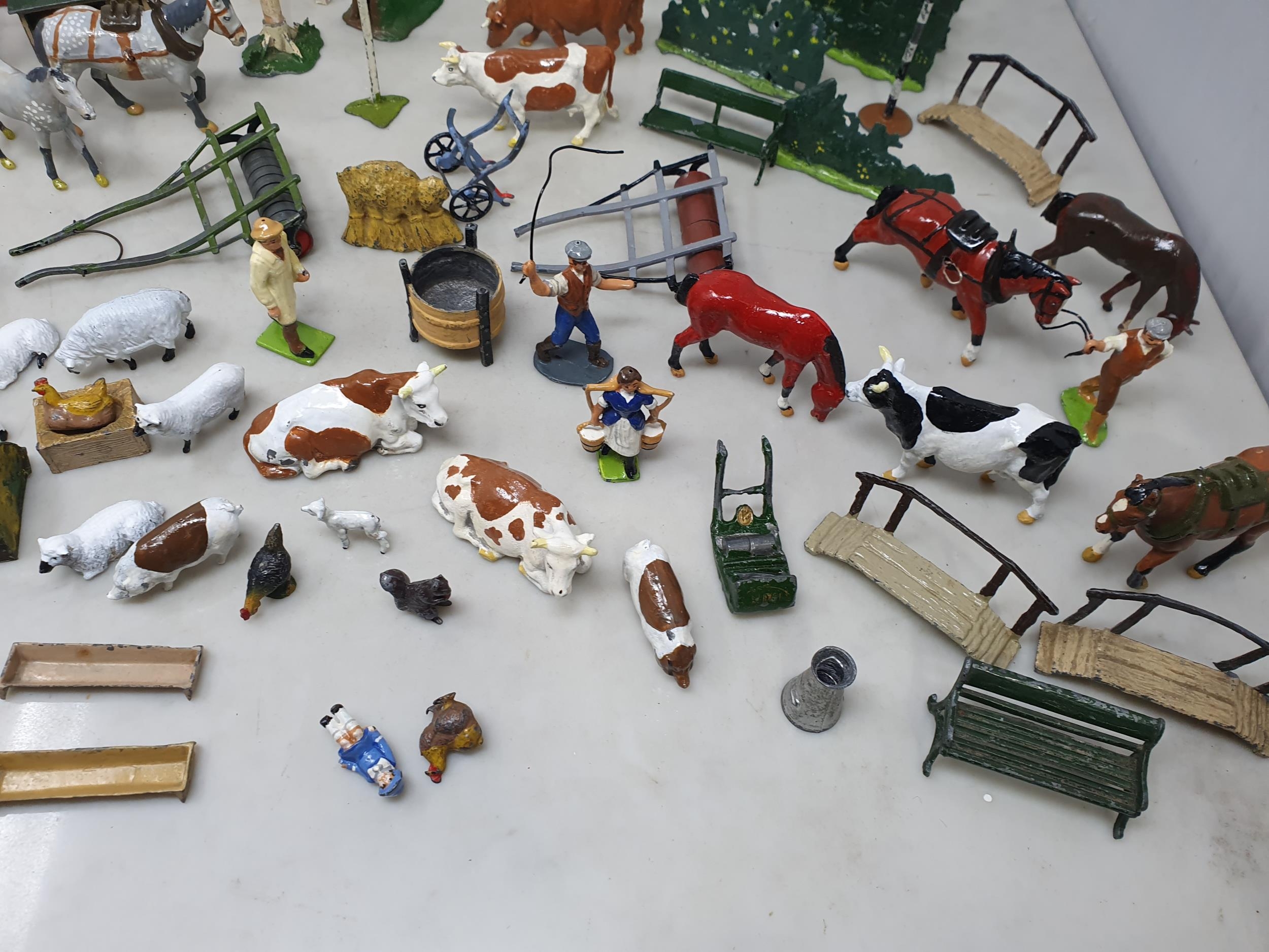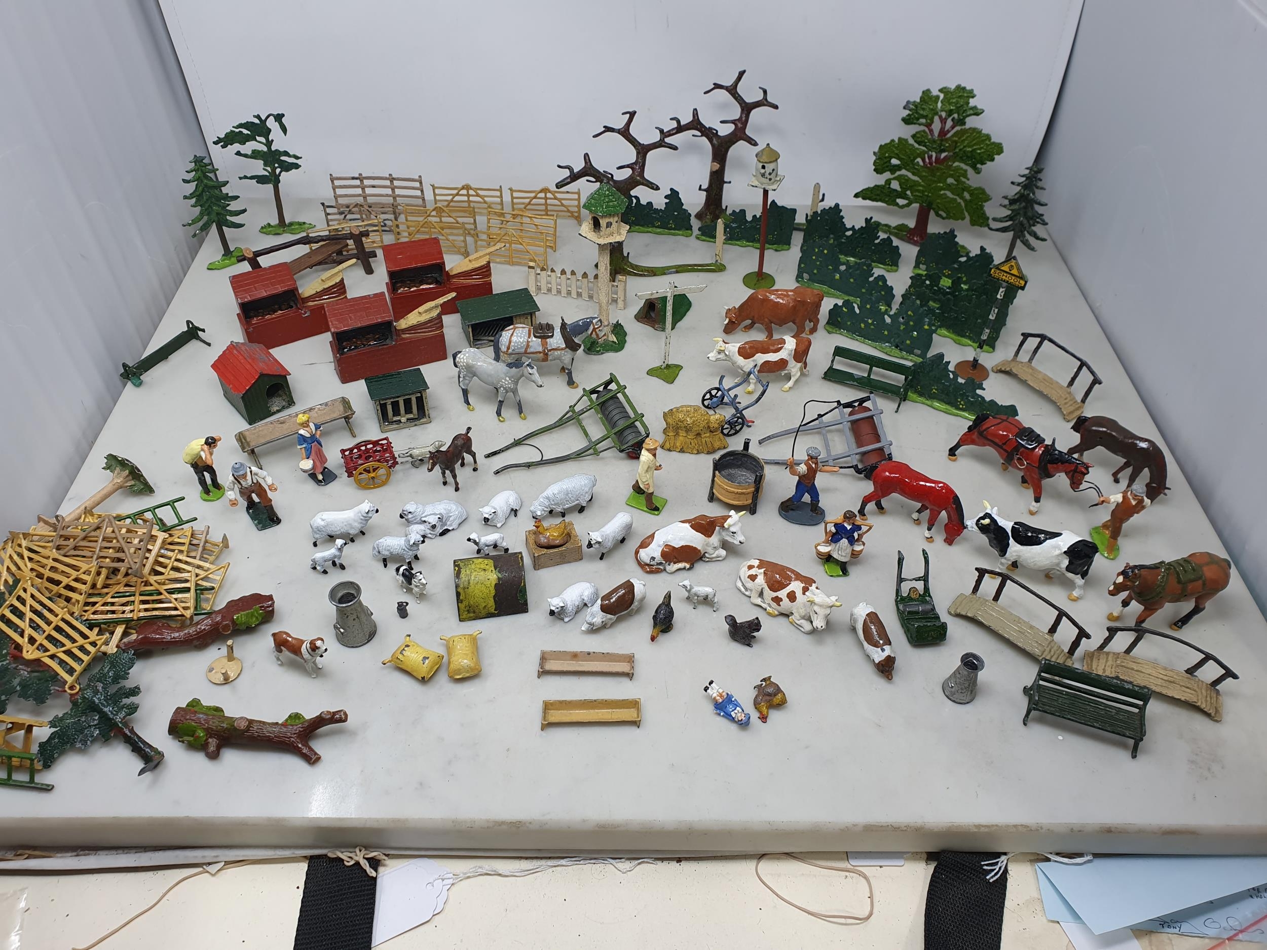 An extensive Collection of painted alloy Farmyard Figures including horses, implements, fences, bellows, trees, kennels, signs, cows, sheep, poultry, etc, some by Britains R4