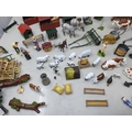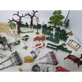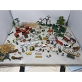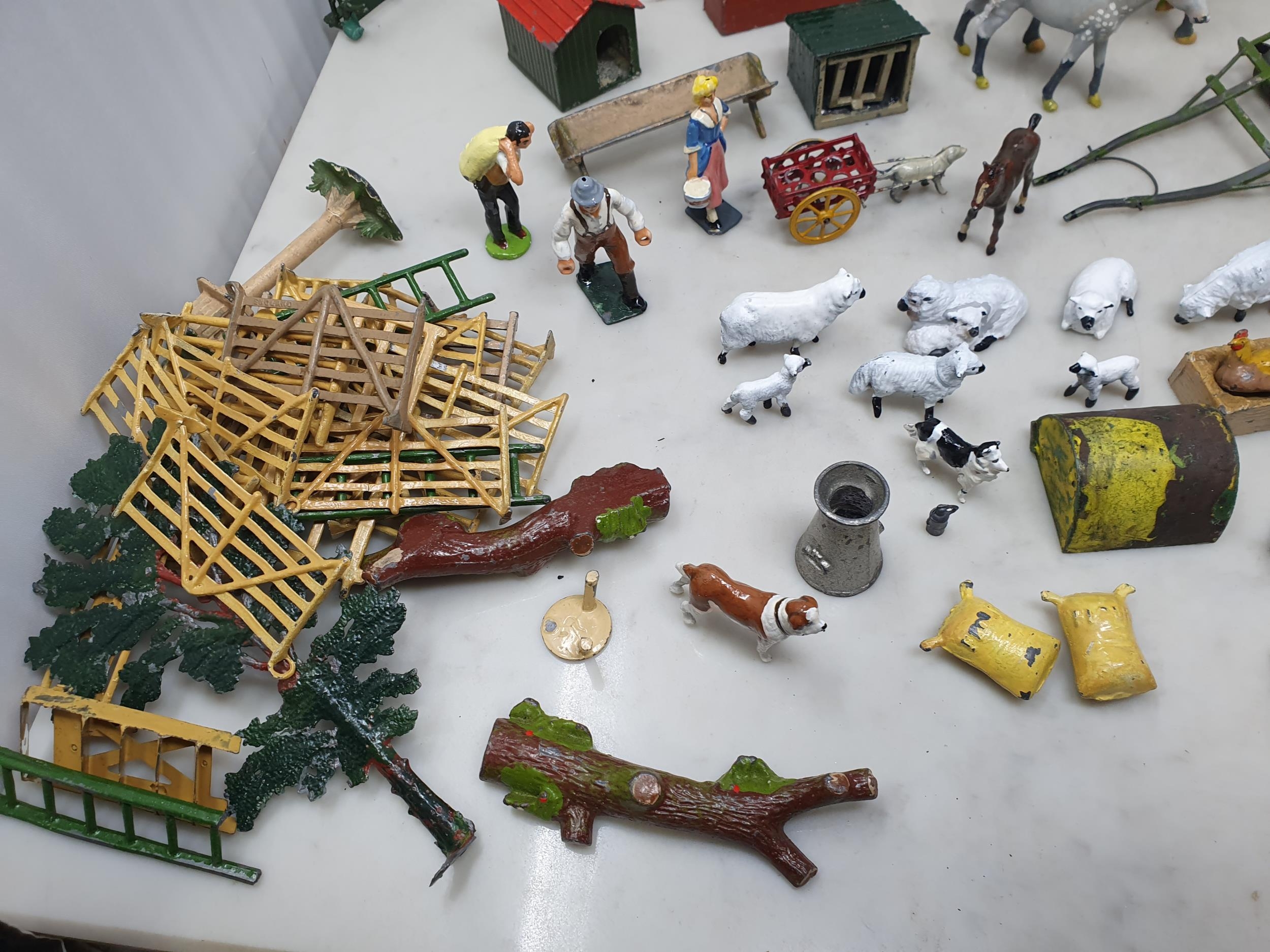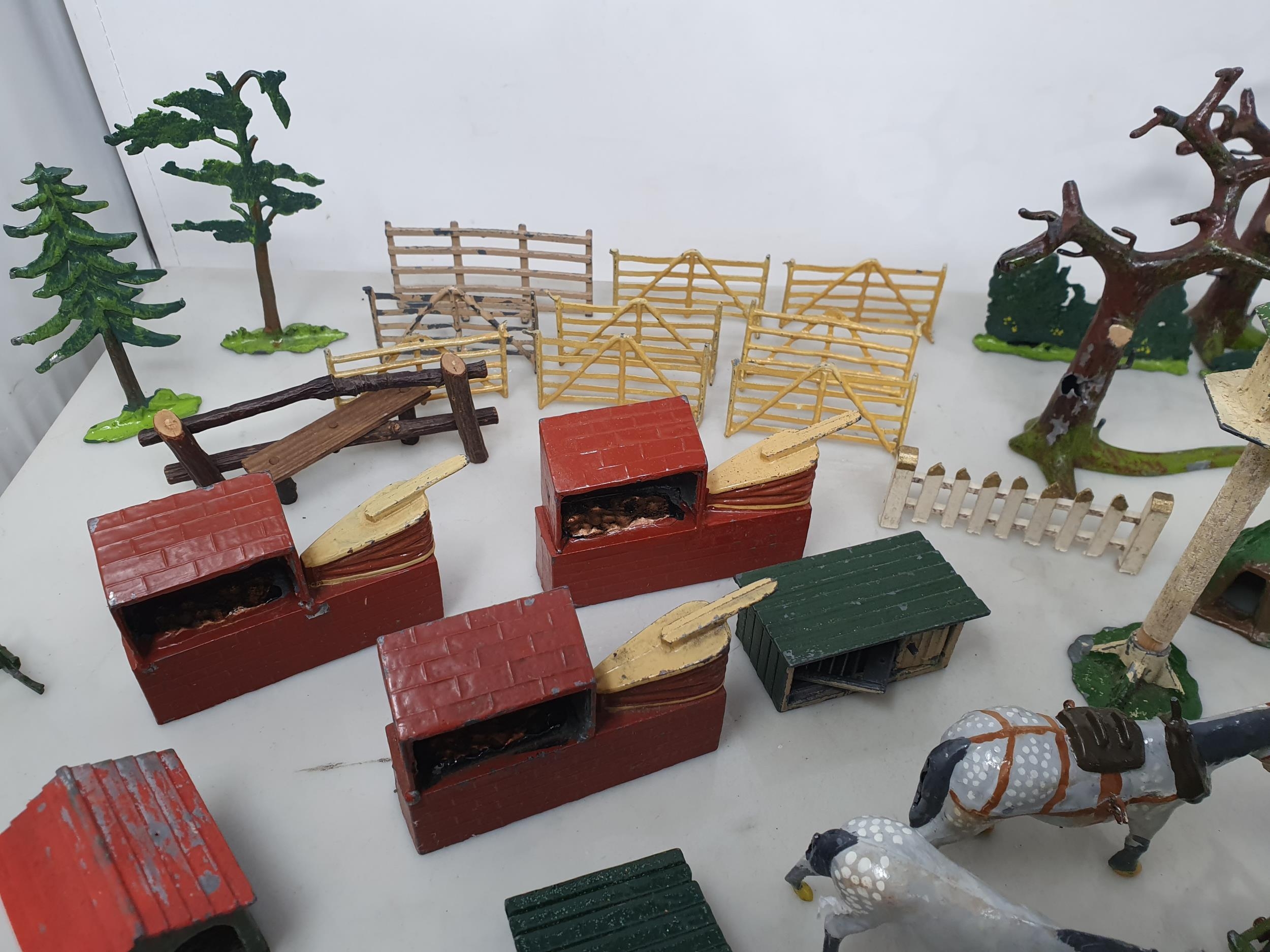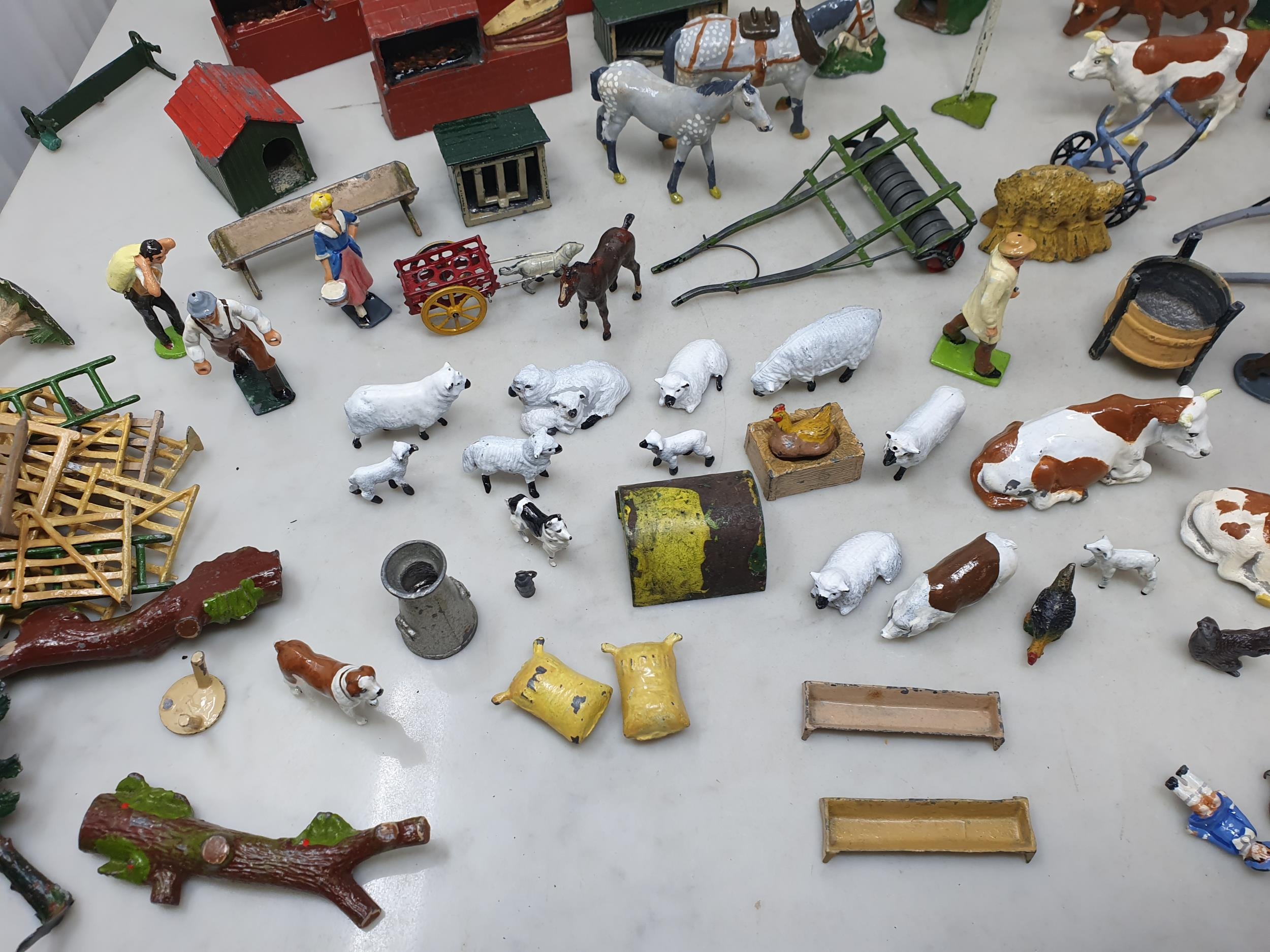 An extensive Collection of painted alloy Farmyard Figures including horses, implements, fences, bellows, trees, kennels, signs, cows, sheep, poultry, etc, some by Britains R4