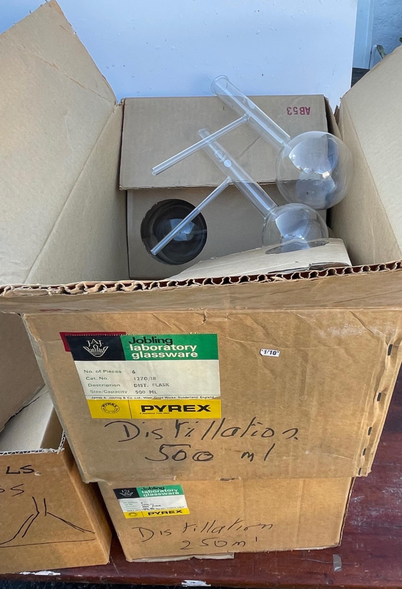 Peebles High School fund raising - A science dept laboratory two boxes of distillation flasks 500ml and 250ml - 6 in each box