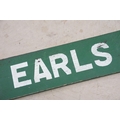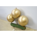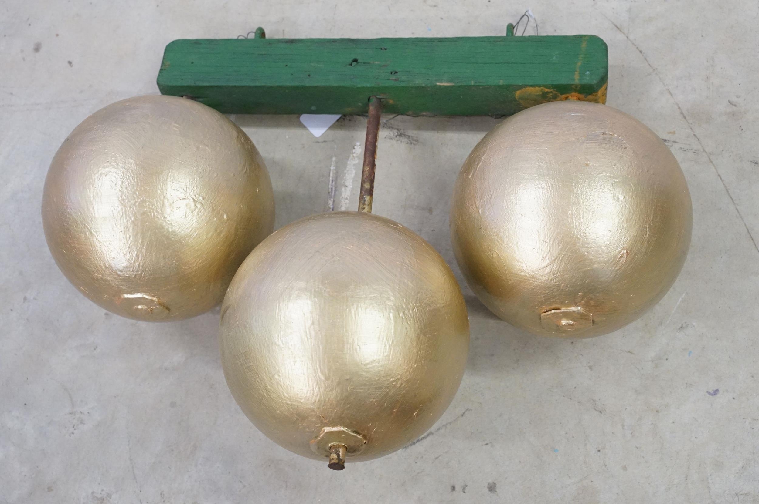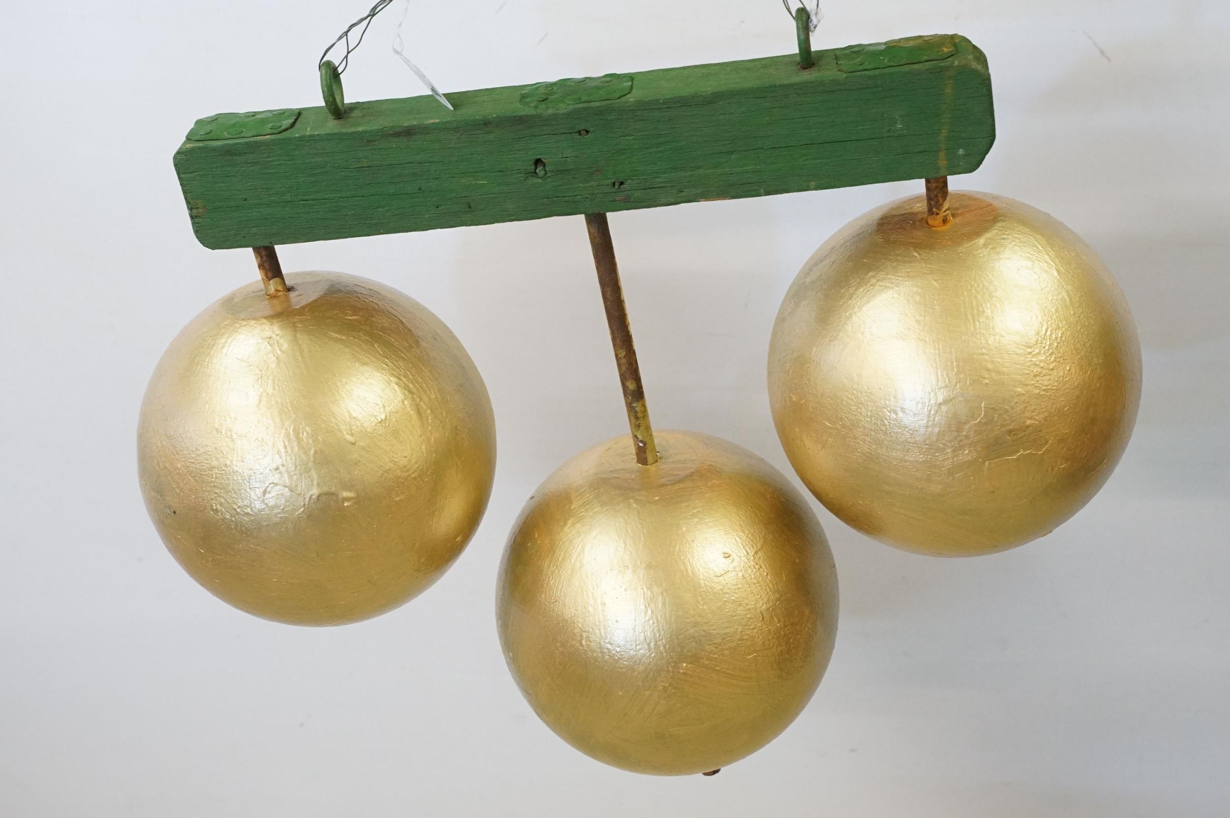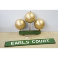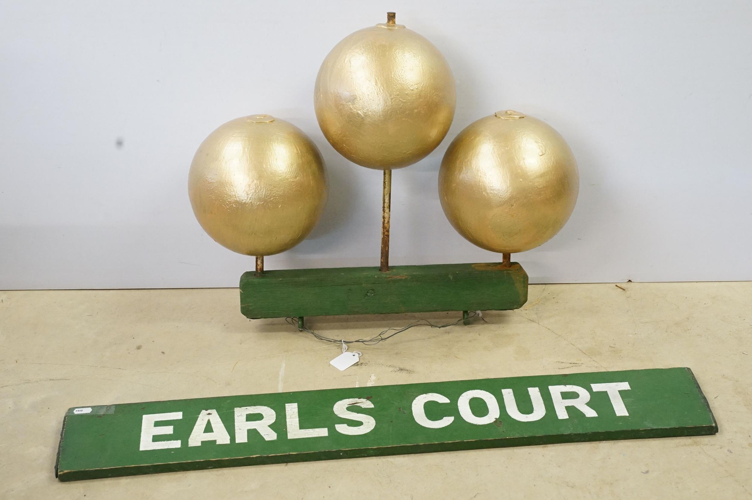 1950s pawn brokers painted glass golden balls on wooden hanger, together with a painted District Line Earls Court sign Circa 1920s