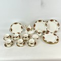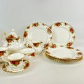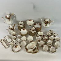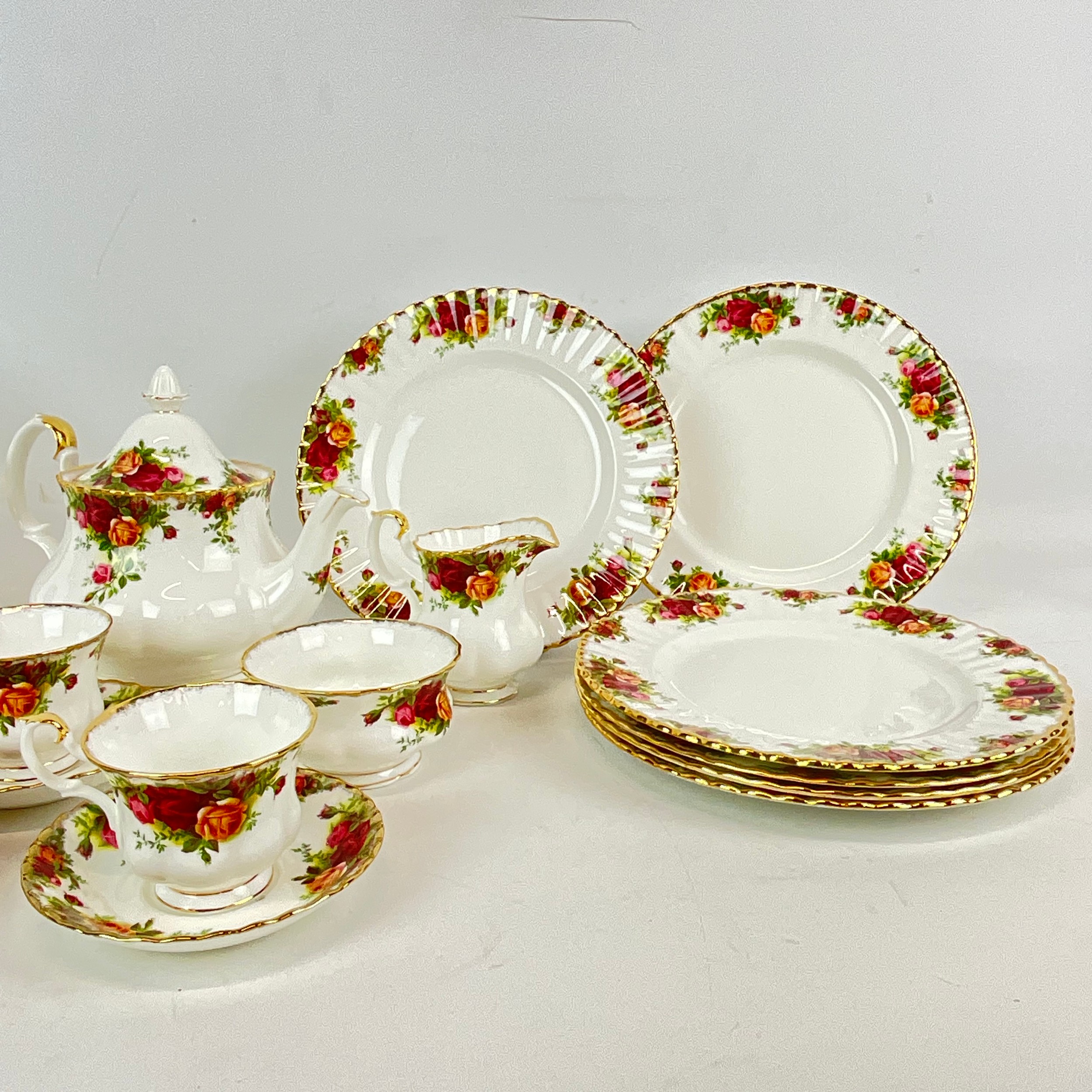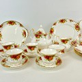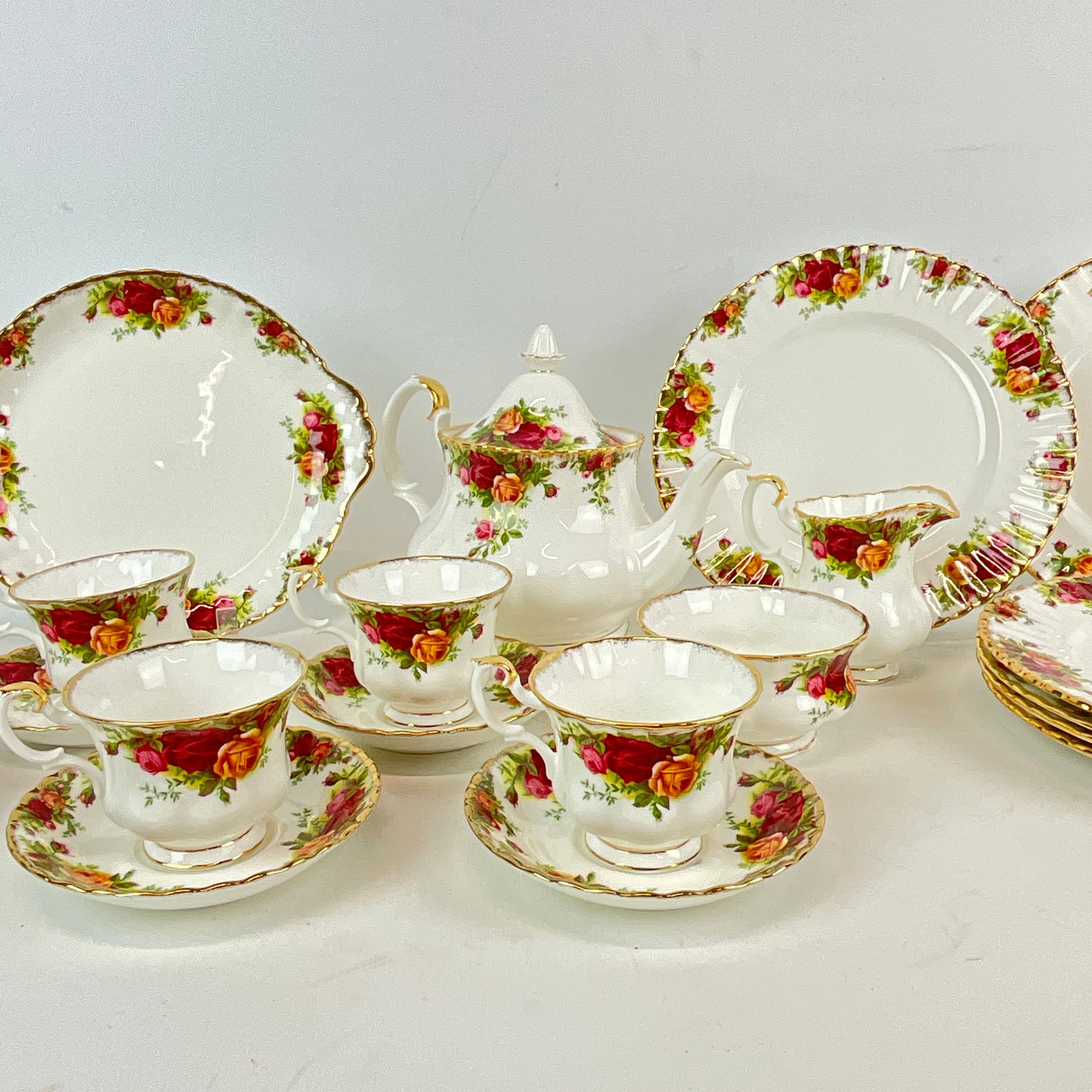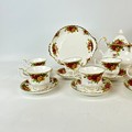 A six place setting of Royal Albert Old Country Roses to include six saucers, six bowls, six cake plates, six plates, a sandwich plate, a milk jug, a sugar bowl, a tea pot and six cups.