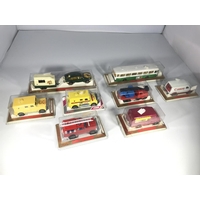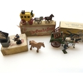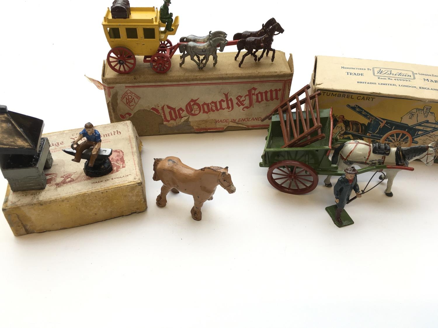 A Britains Tumble cart #4f, a Miniature Models Village Blacksmith and a P.M.C Coach Driver and four Horses, all boxed.