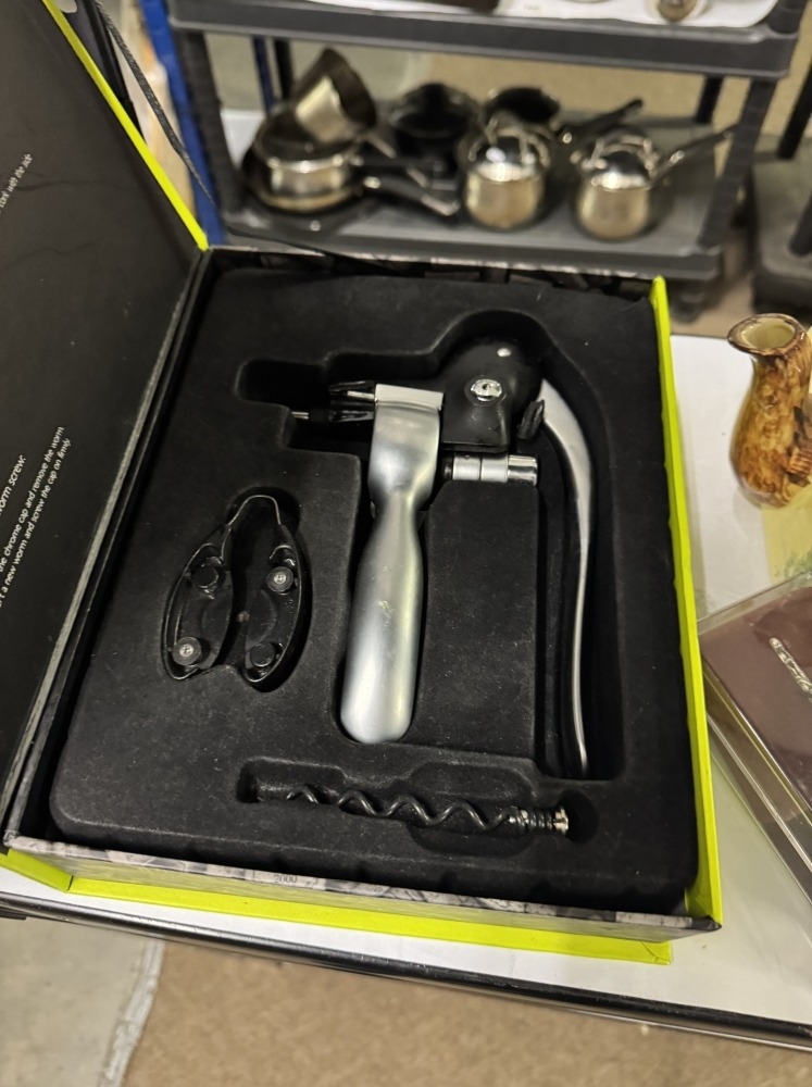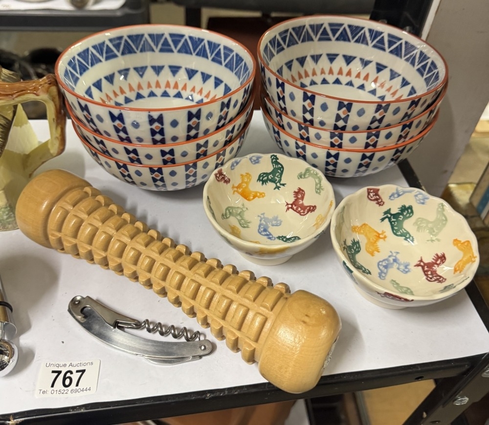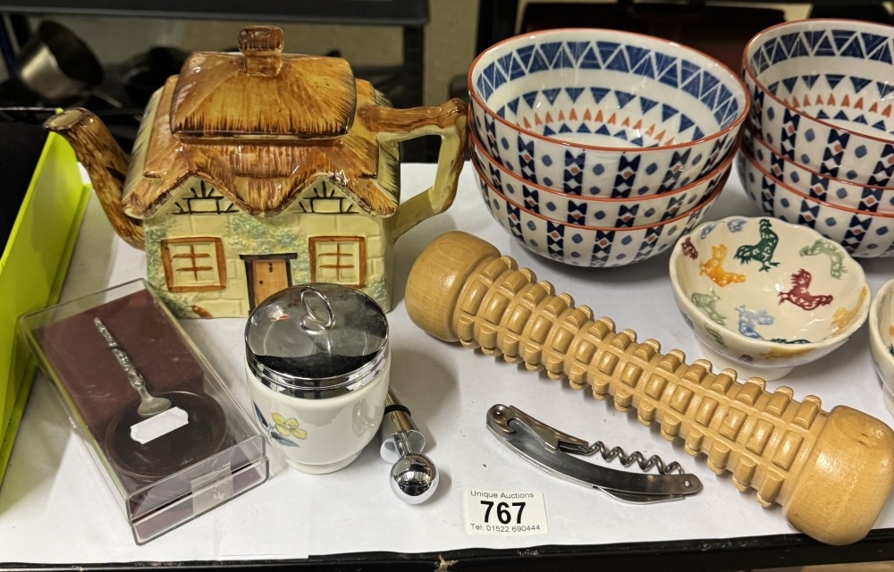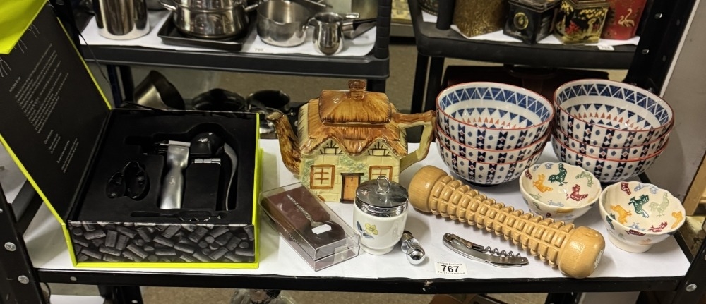 A boxed bar set, 2 Emma Bridgewater bowls, egg coddlers etc