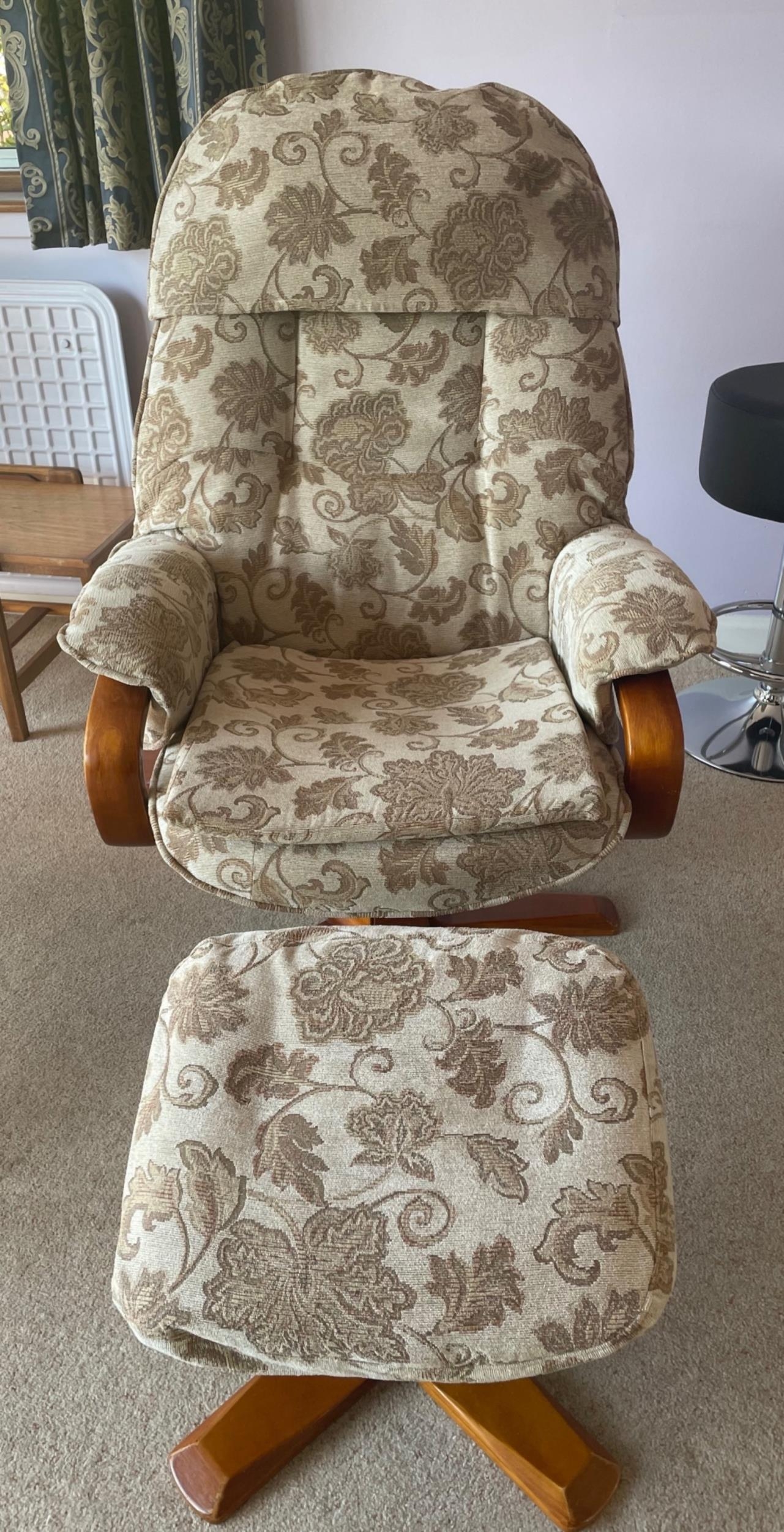 A reclining and swivel chair with foot stool and teak style legs and arms - extremely comfy!