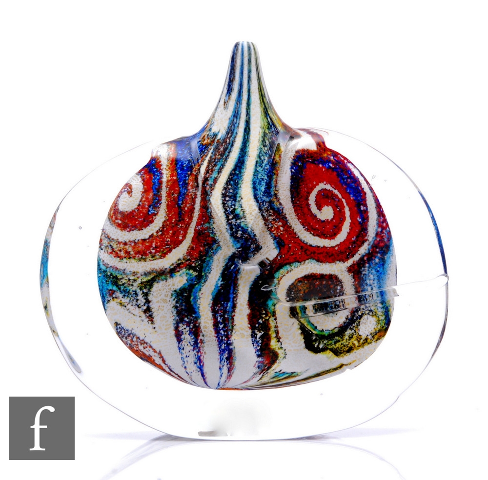 Timothy Harris - Isle of Wight - A contemporary studio cased glass fish head Jazz vase, opaque multicoloured abstract core, cased in clear, engraved signature, no.2/3 and dated 2016, height 22cm.