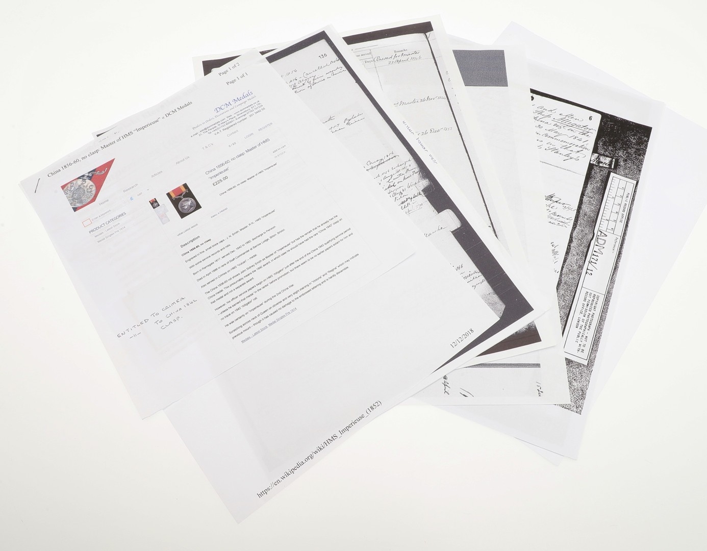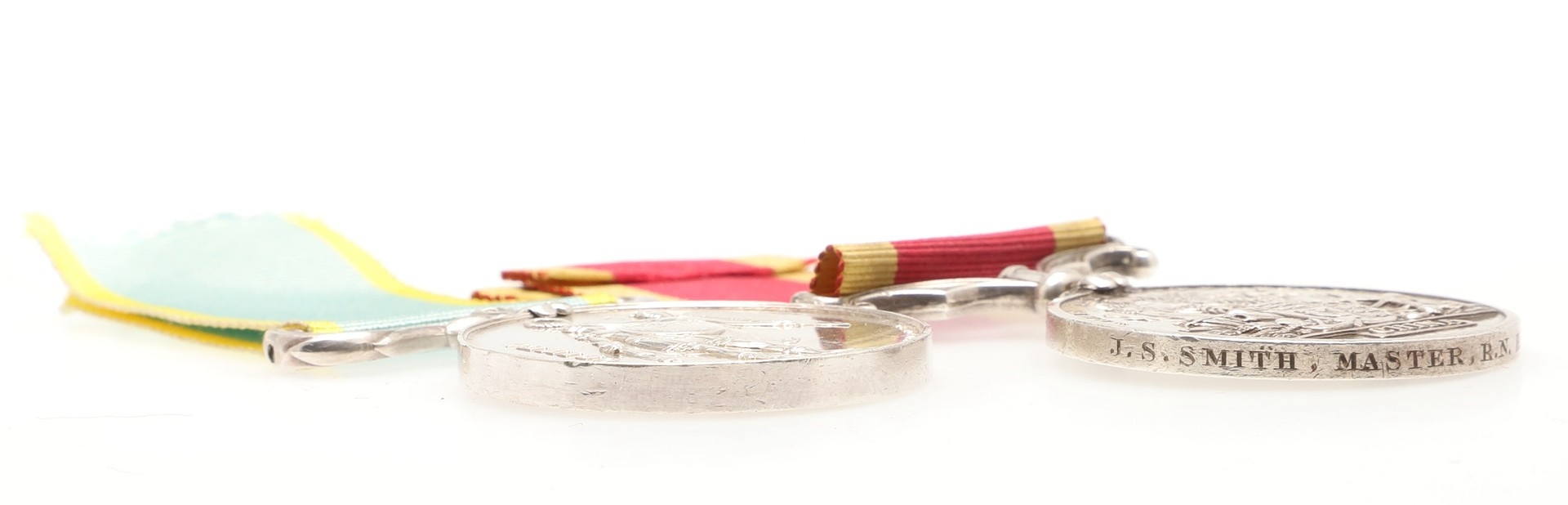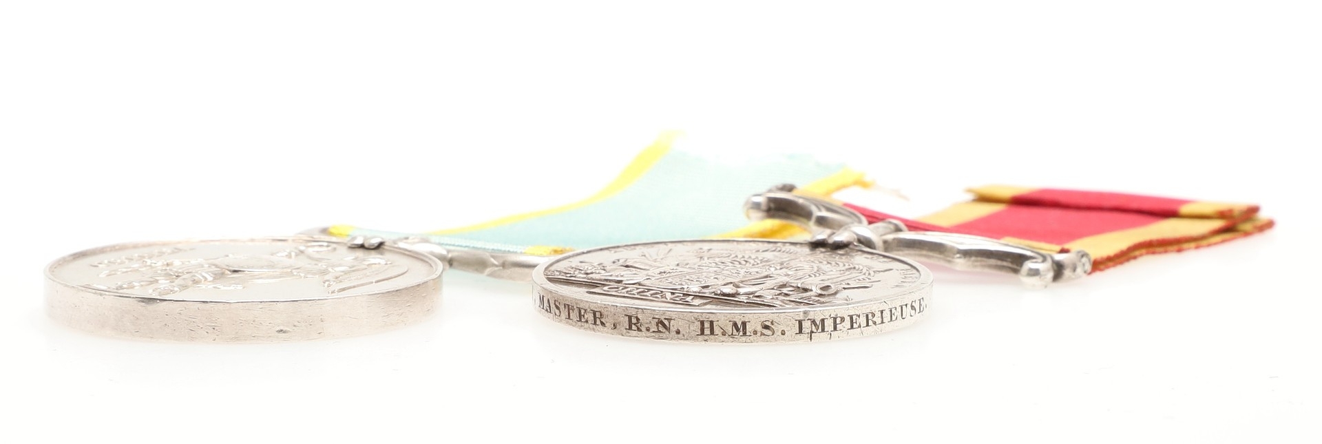 A CRIMEA AND CHINA PAIR TO HMS VULCAN AND HMS IMPERIEUSE. A pair comprising Crimea War Medal 1854-56, without clasp and unnamed as issued. With a Second China War Medal 1856-60 without clasp named to J.S. Smith Master R.N. H.M.S. Imperieuse. John Sidney Smith was born in Ramsgate in 1817, he passed as Master on the 22nd April 1846 serving in that role in H.M.S. Spiteful from 14th July 1854 until 14 March 1855 and H.M.S. Vulcan until 27th September 1856 for which service he was entitled to the Crimea Medal without clasp. Master aboard H.M.S. Imperieuse from the 28th June 1859 until the 3rd February 1861, He died on the 10th April 1886. With copied record and roll extracts. Provenance: the first Noonans July 2017.