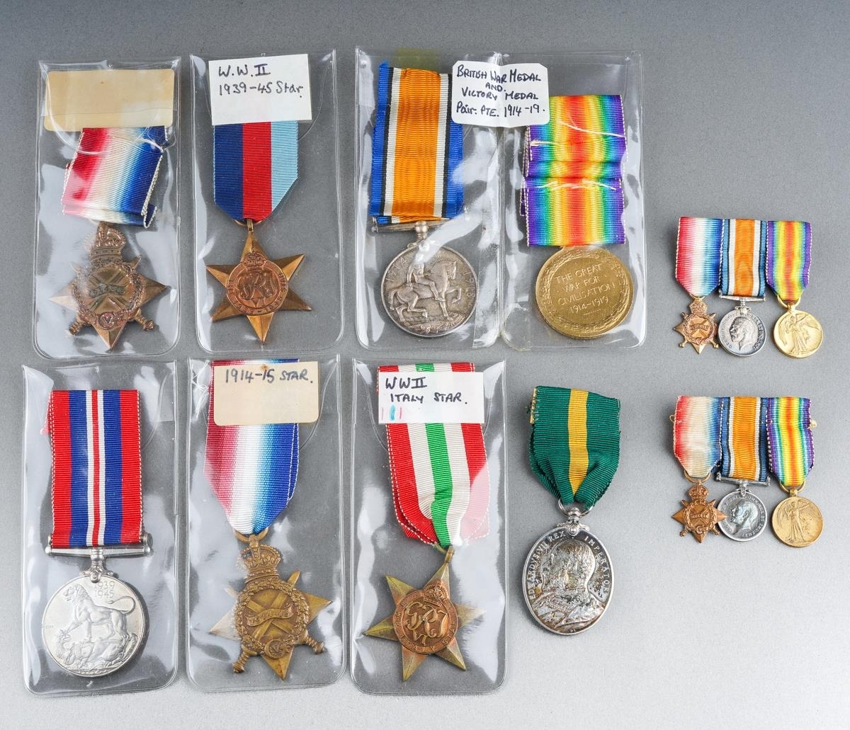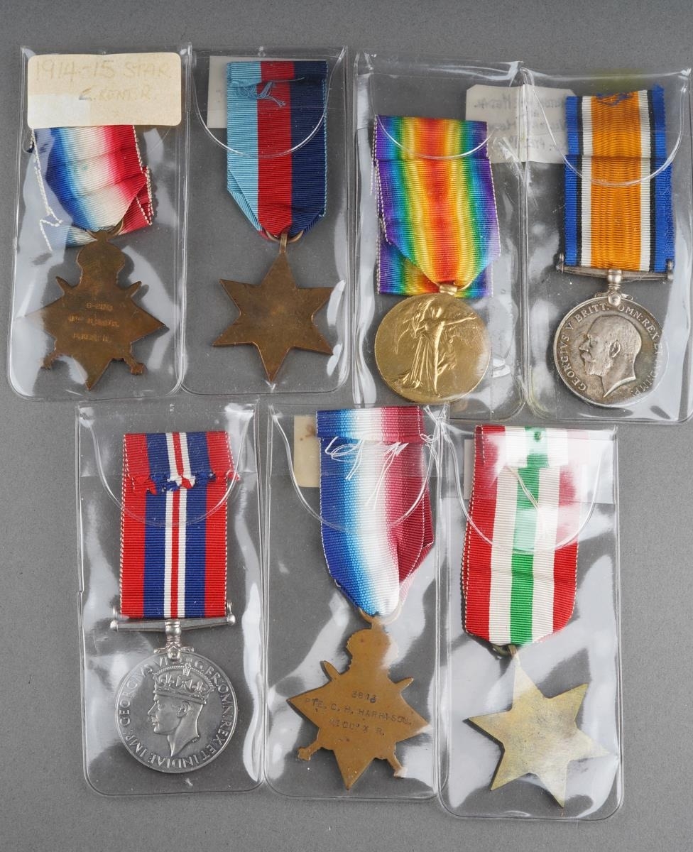 A collection of WWI and WWII medals to include: WWI Great War and 1914-18 medals awarded to G-20067 PTE.A.INVERARITY.R.SUSS.R; 1914-15 Star awarded to G-2071 PTE R SMITH E.KENT.R; 1914-15 Star awarded to 3313 PTE C.H.HARRISON MIDD'X.R; 2 x trio of WWI miniatures together with WWII 1939-45 Star, Italy Star 1939-45 medal and a Edward VII Territorial Force Efficiency Medal awarded SJT. W.H MARSON. 4/NORFOLK REG [1 bag]