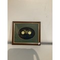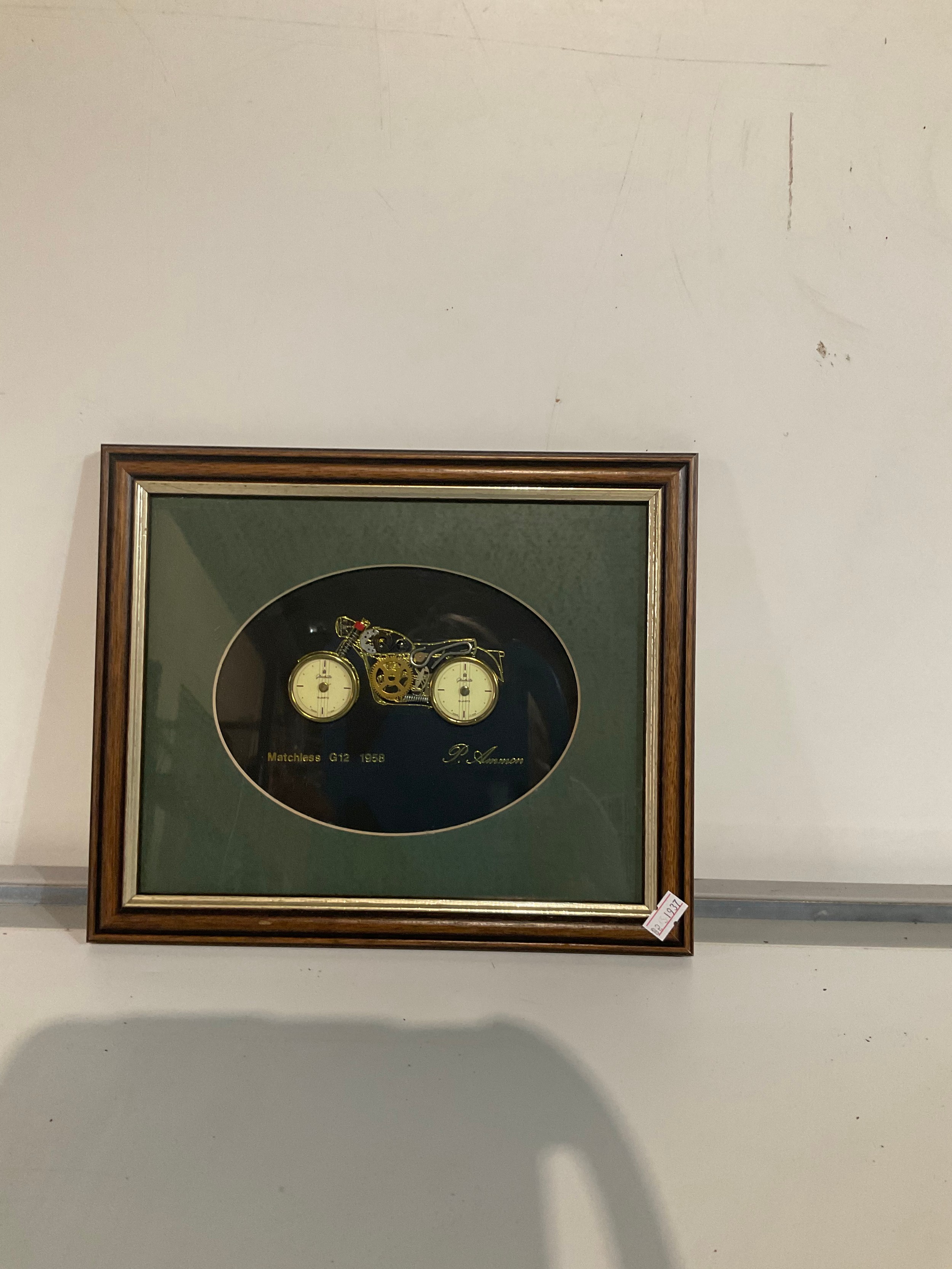 framed and glazed motorbike made of clock faces, cogs and springs