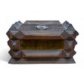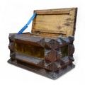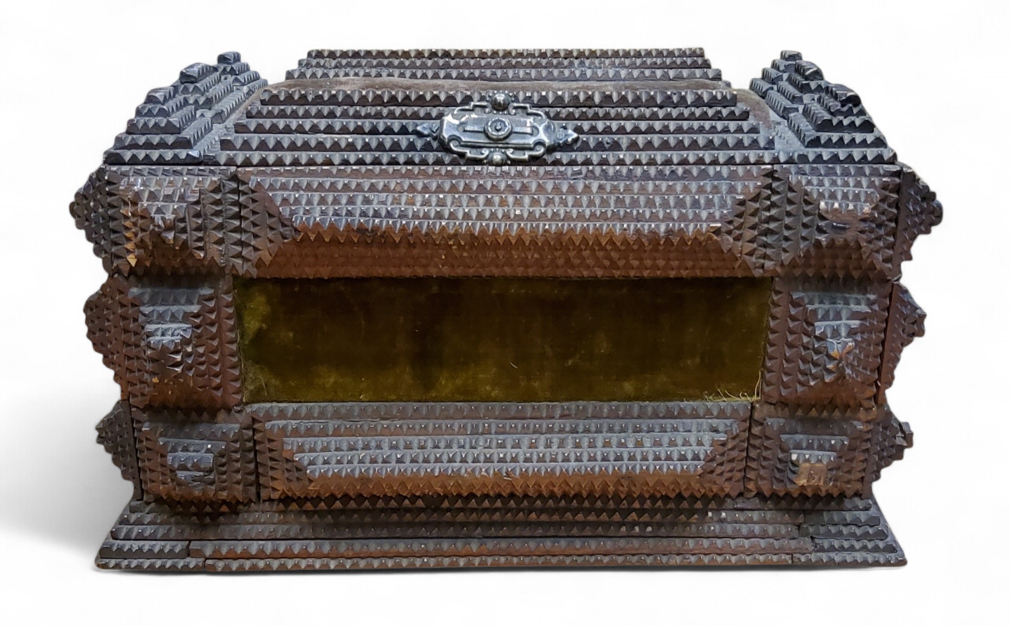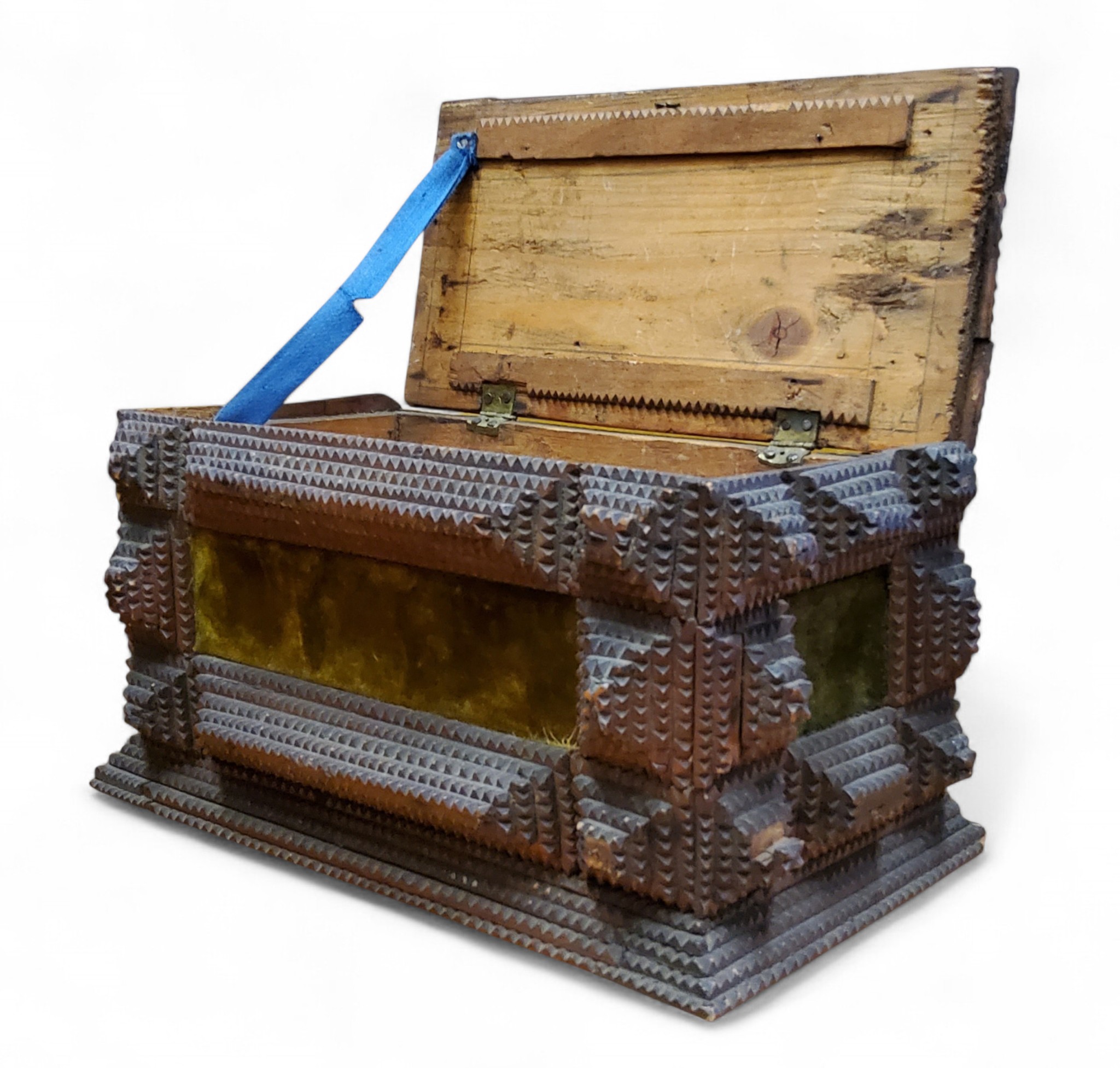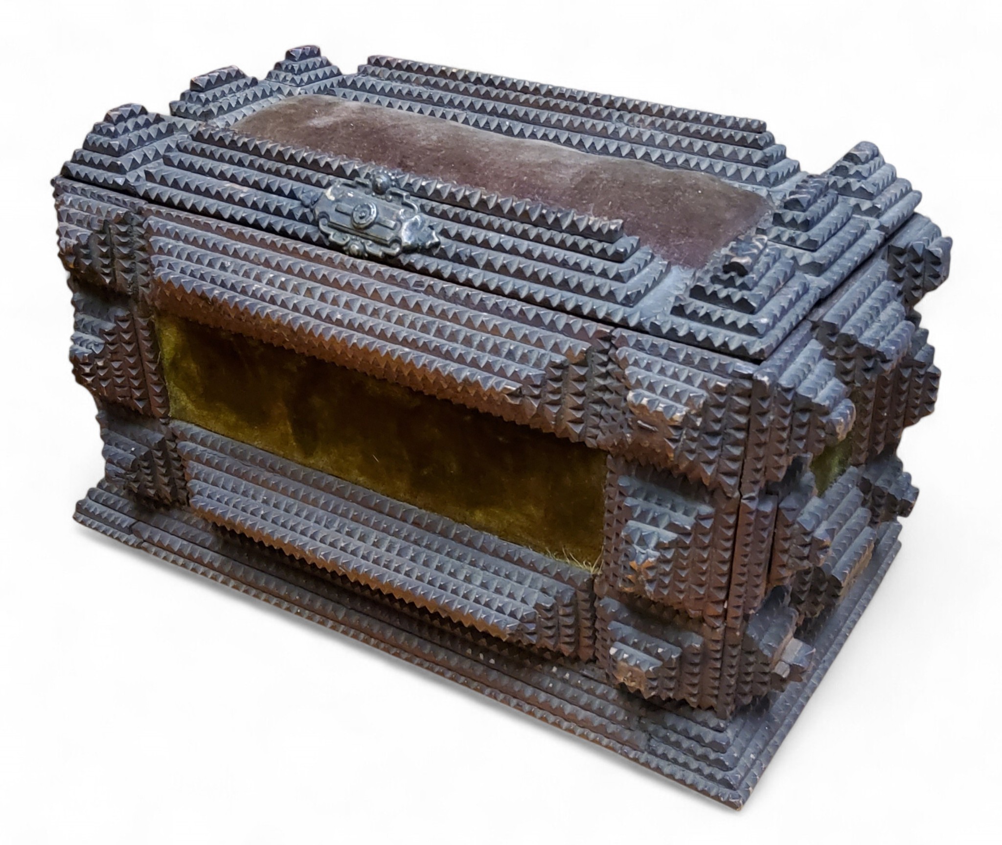 Folk Art - a late 19th century tramp art rectangular box, velvet panels and pin cushion, typical geometric borders, 16cm high, 27cm wide, c.1900