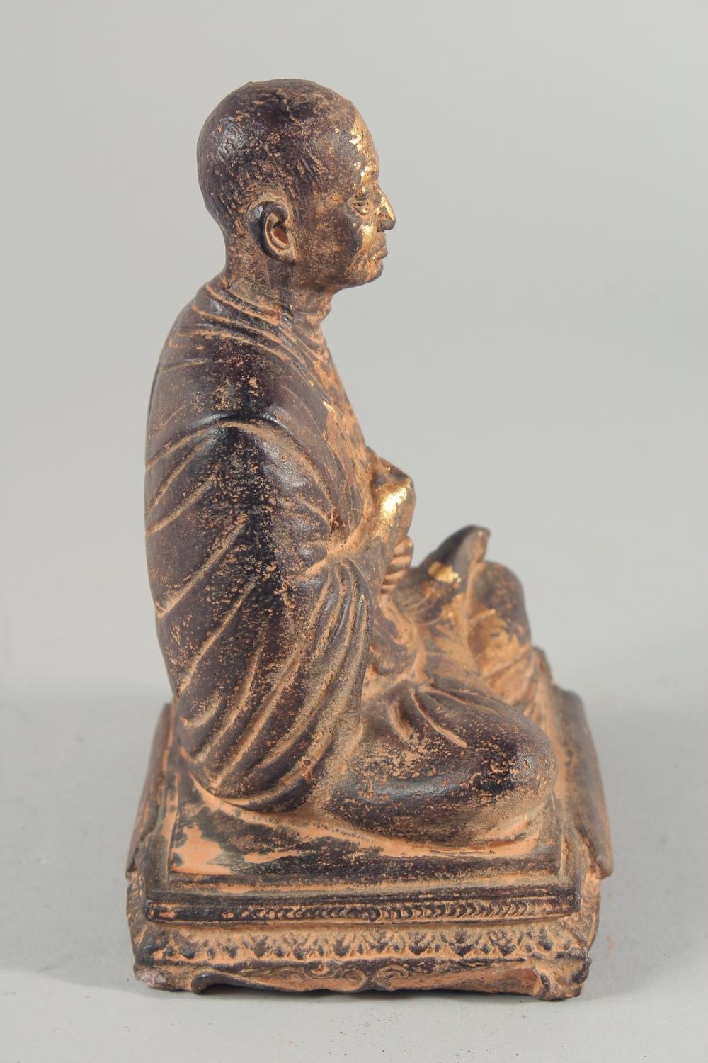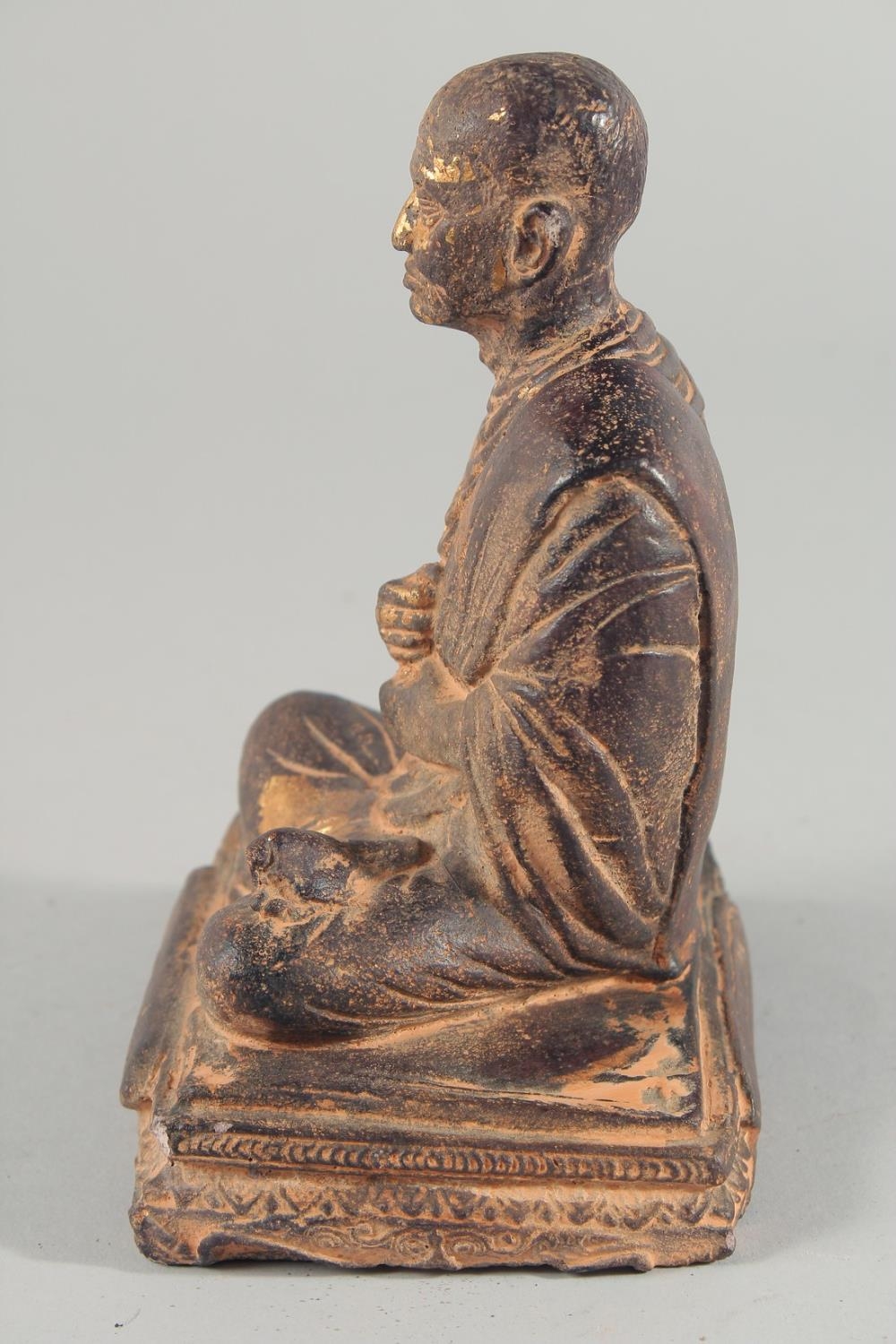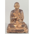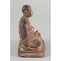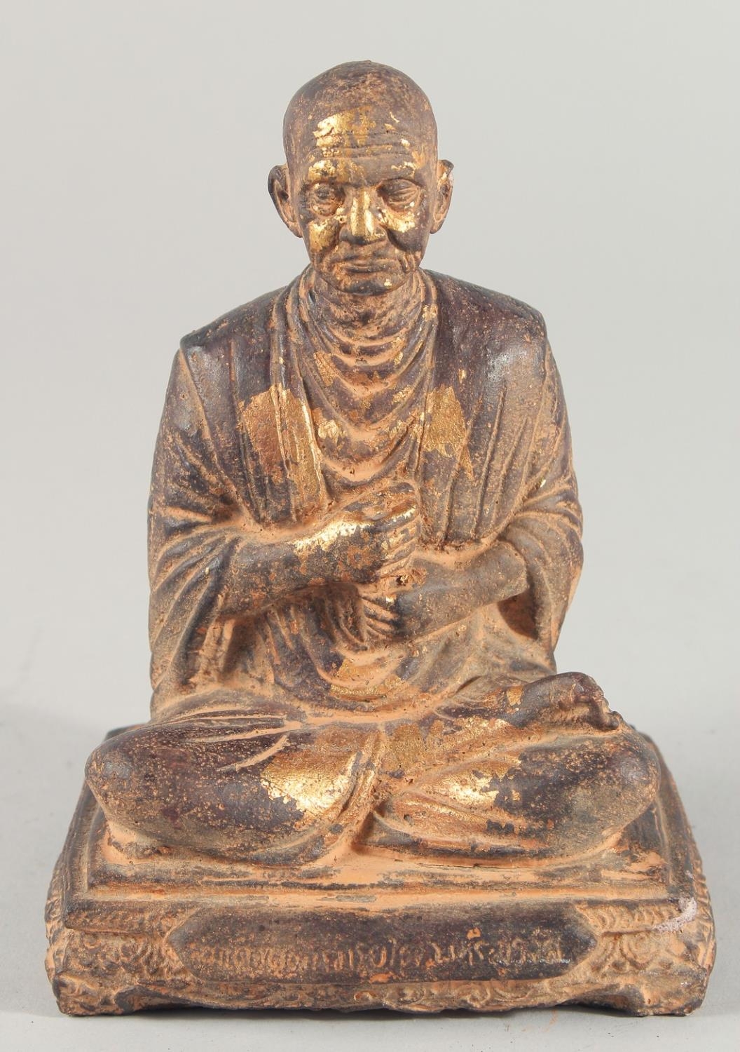 A TIBETAN CARVED STONE SEATED FIGURE, with traces of gold paint, inscribed to the base, 18.5cm high.