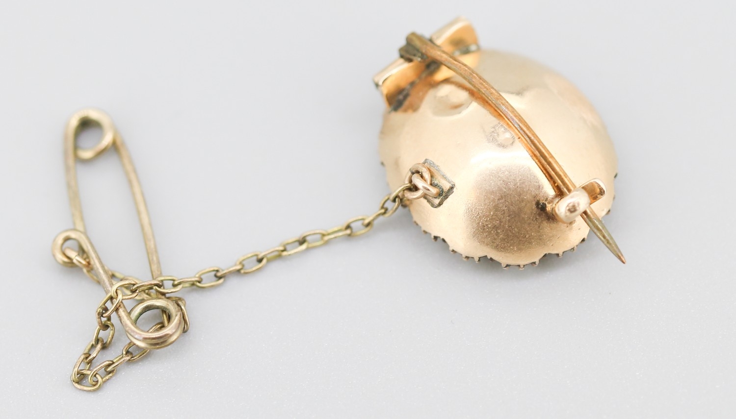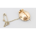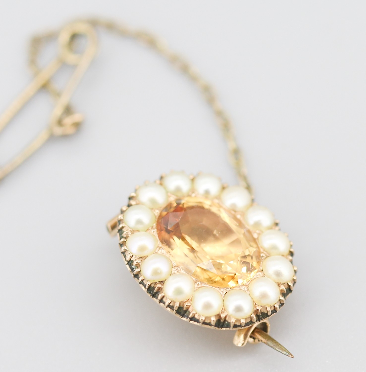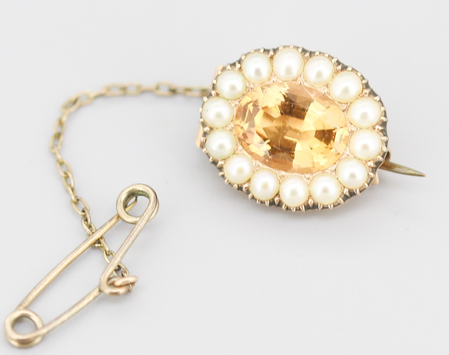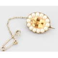 Attractively Detailed Citrine and Pearl Set Brooch Mounted in 9 Carat Rose Gold with Safety Chain 2cm