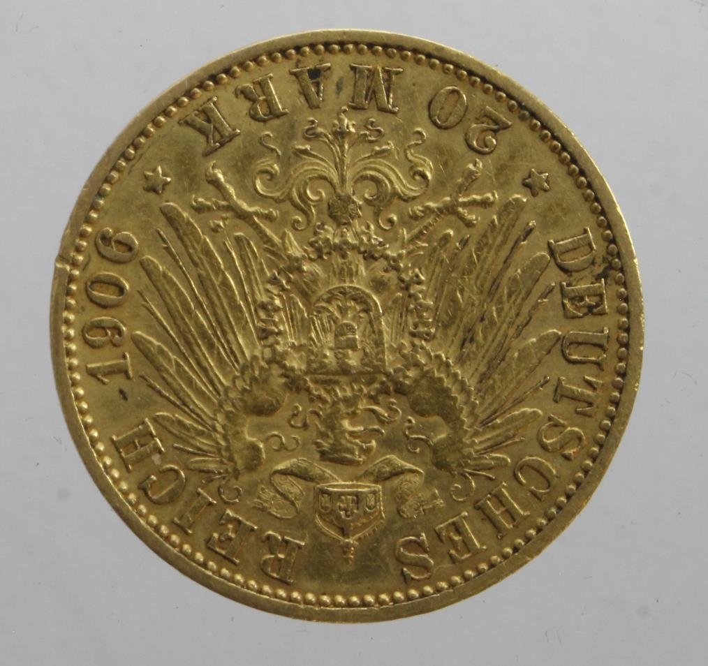 German States, Prussia gold 20 Mark 1906A, VF/GVF (0.2305 troy oz AGW)