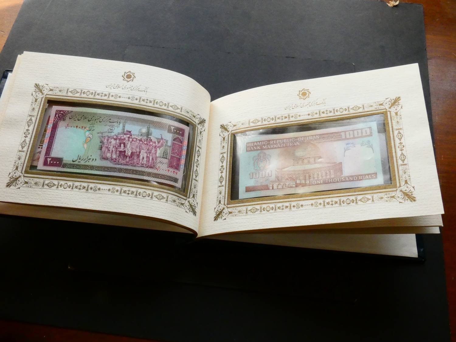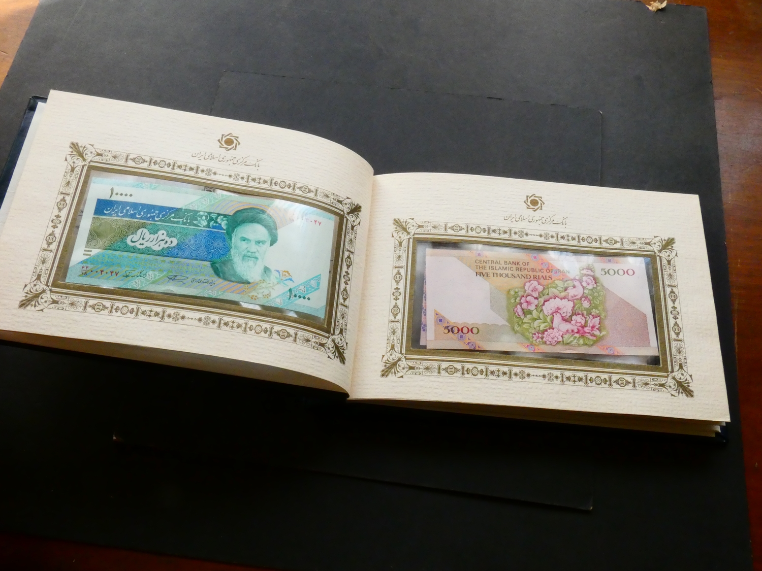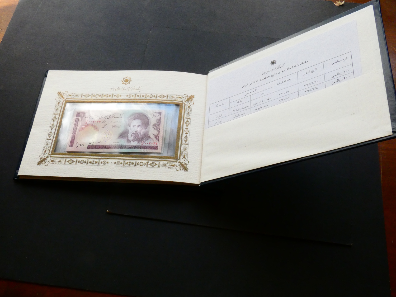 BANKNOTES. Iran, set of "Current Banknotes of the Islamic Republic of Iran", including 100 Rials (P-140a), 200 Rials (P-136a), 500 Rials (P-137i), 1000 Rials (P-143b), 2000 Rials (P-141j), 5000 Rials (P-145b), and 10 000 Rials (P-146d), UNCs in a gilt-decorated leatherette presentation folder from the Banknote Issue and Treasury Department.