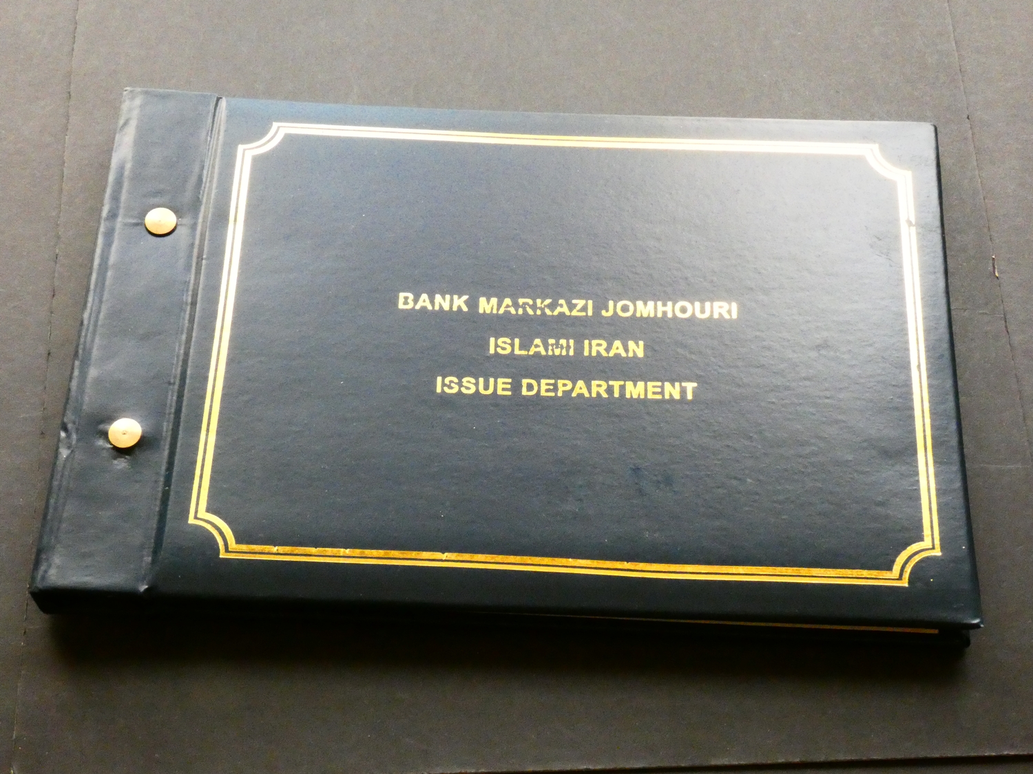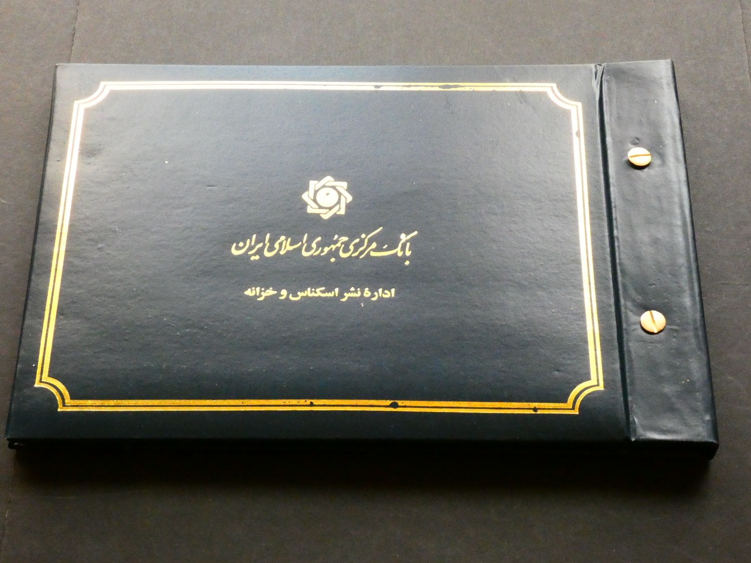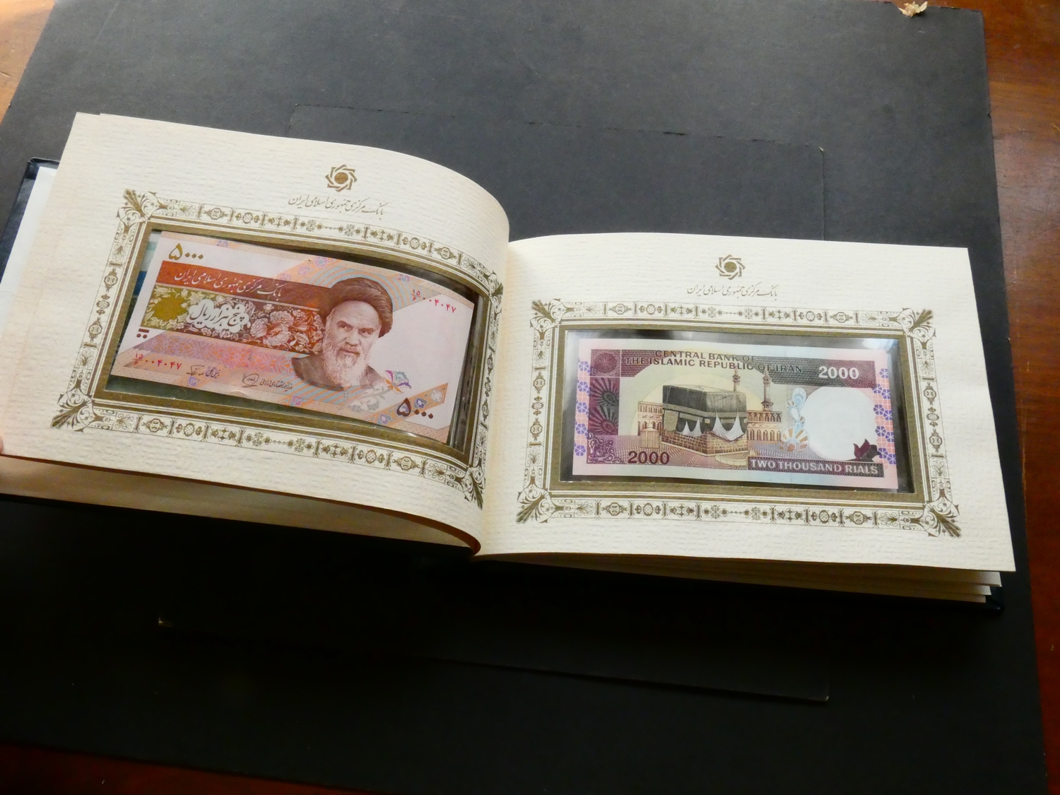 BANKNOTES. Iran, set of "Current Banknotes of the Islamic Republic of Iran", including 100 Rials (P-140a), 200 Rials (P-136a), 500 Rials (P-137i), 1000 Rials (P-143b), 2000 Rials (P-141j), 5000 Rials (P-145b), and 10 000 Rials (P-146d), UNCs in a gilt-decorated leatherette presentation folder from the Banknote Issue and Treasury Department.