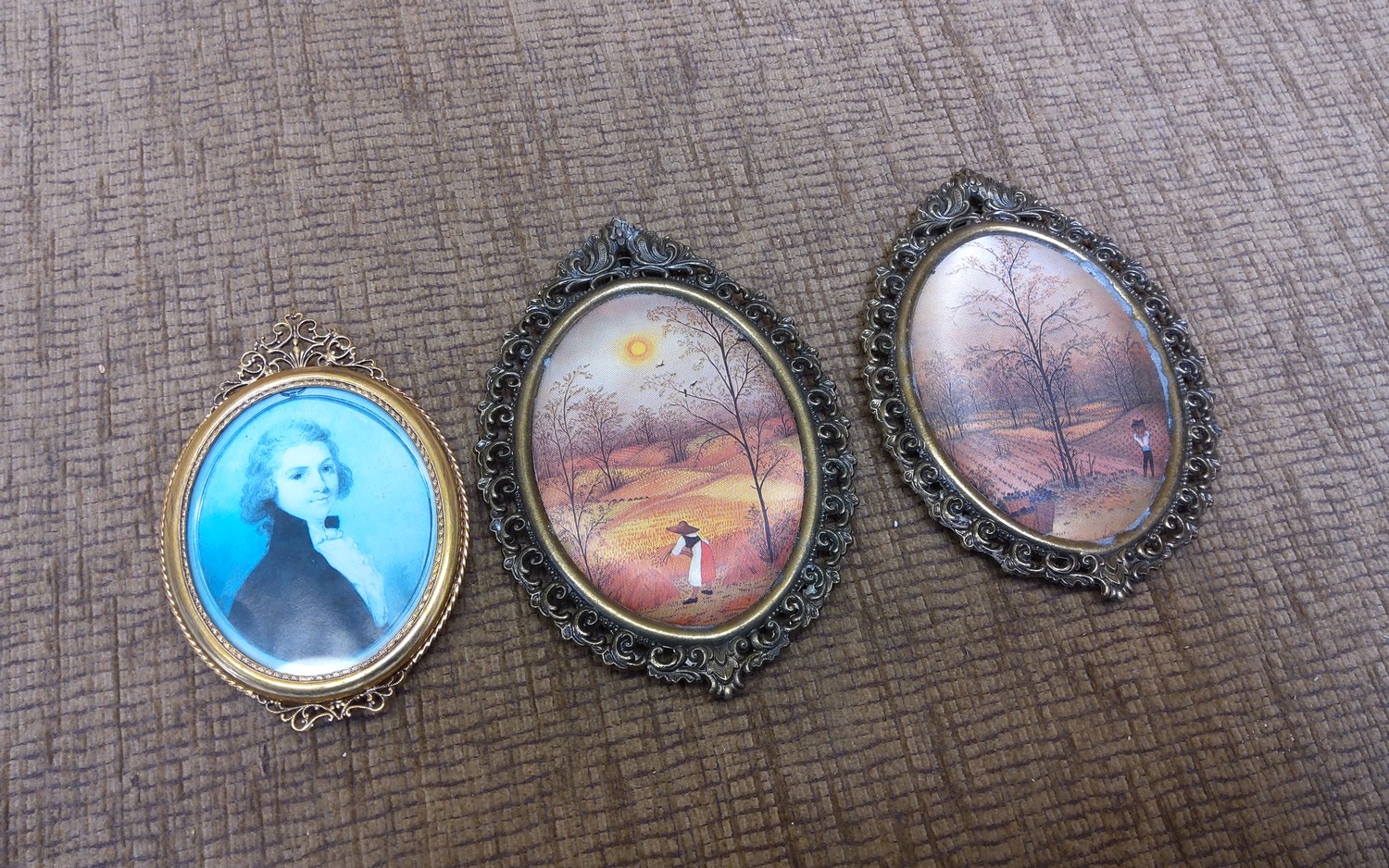 Three ornate brass picture frames ( blue boy - 13 x 9 cm )