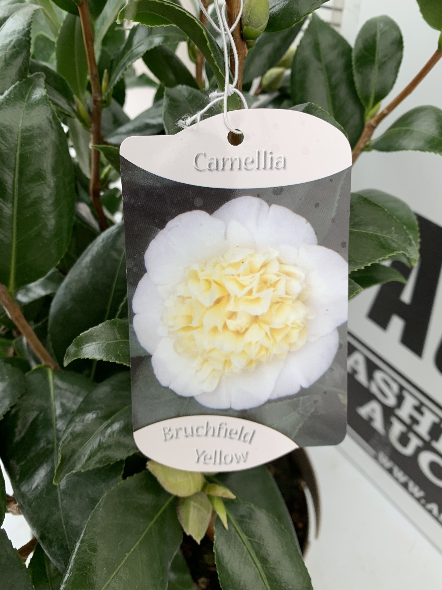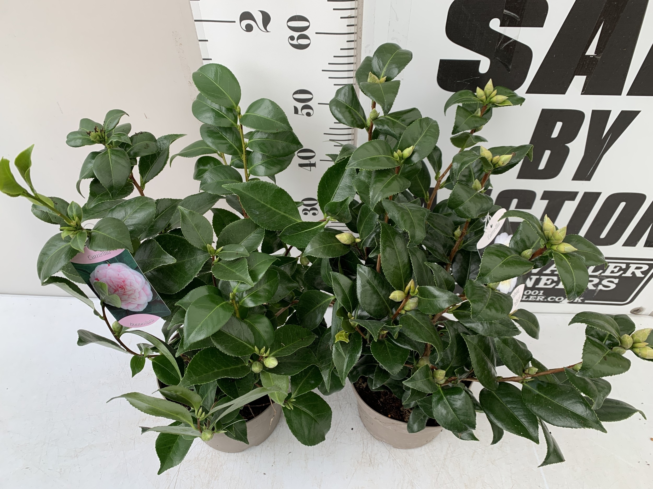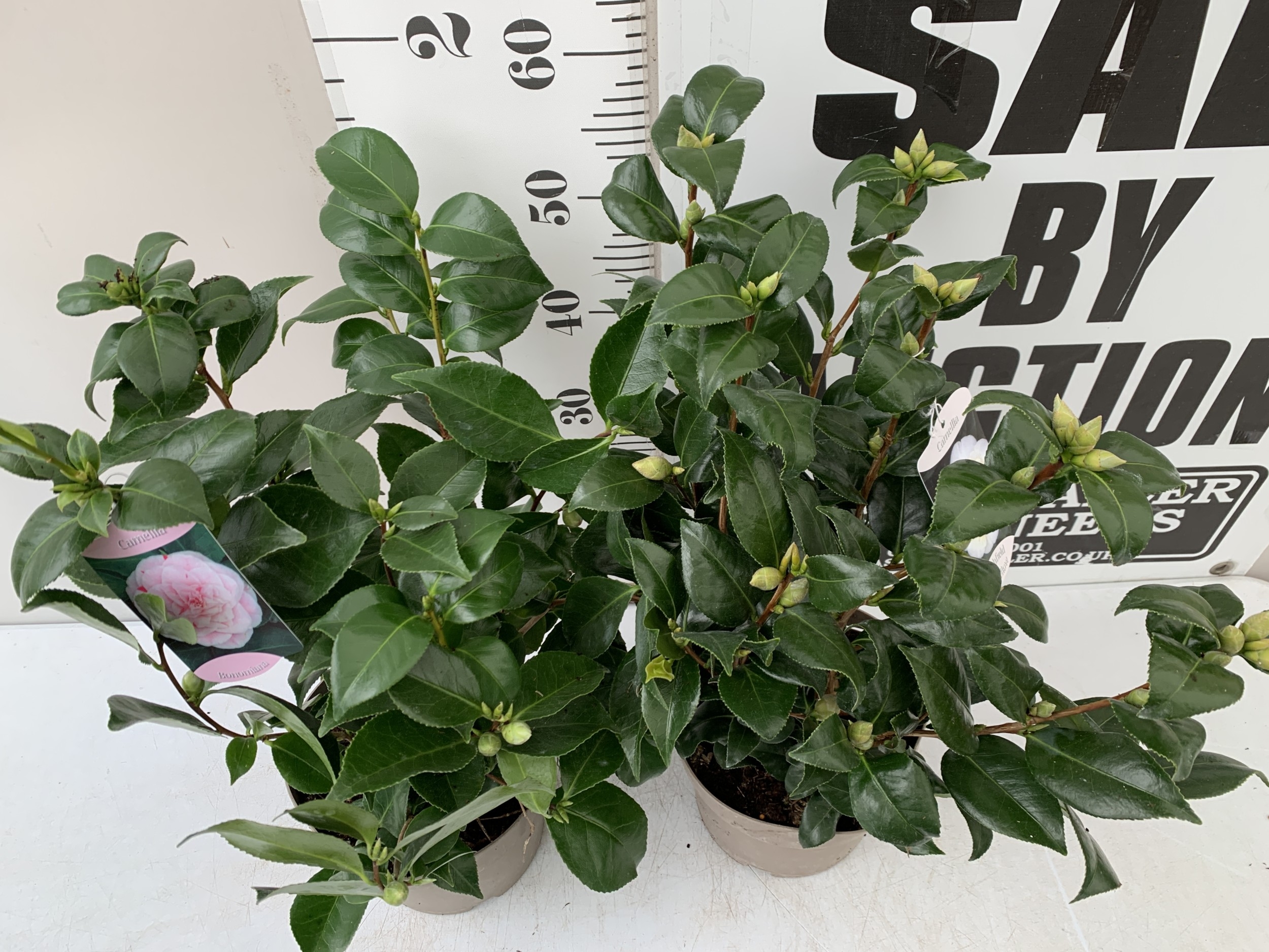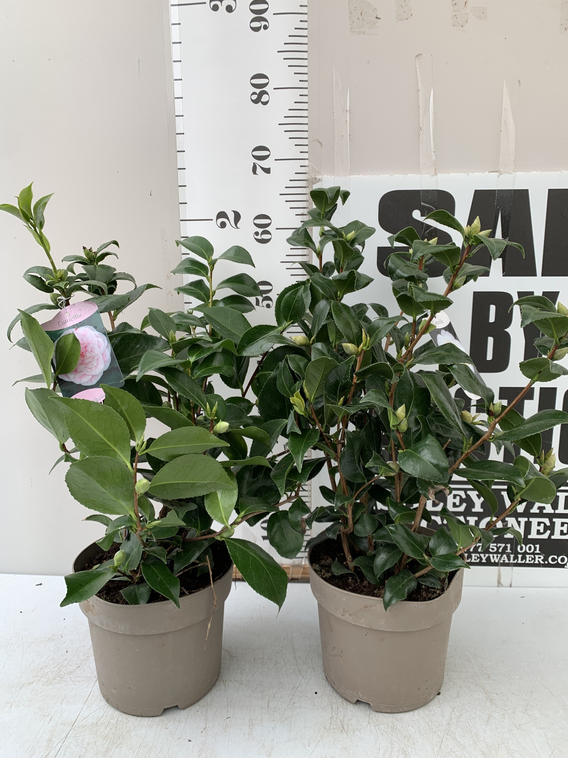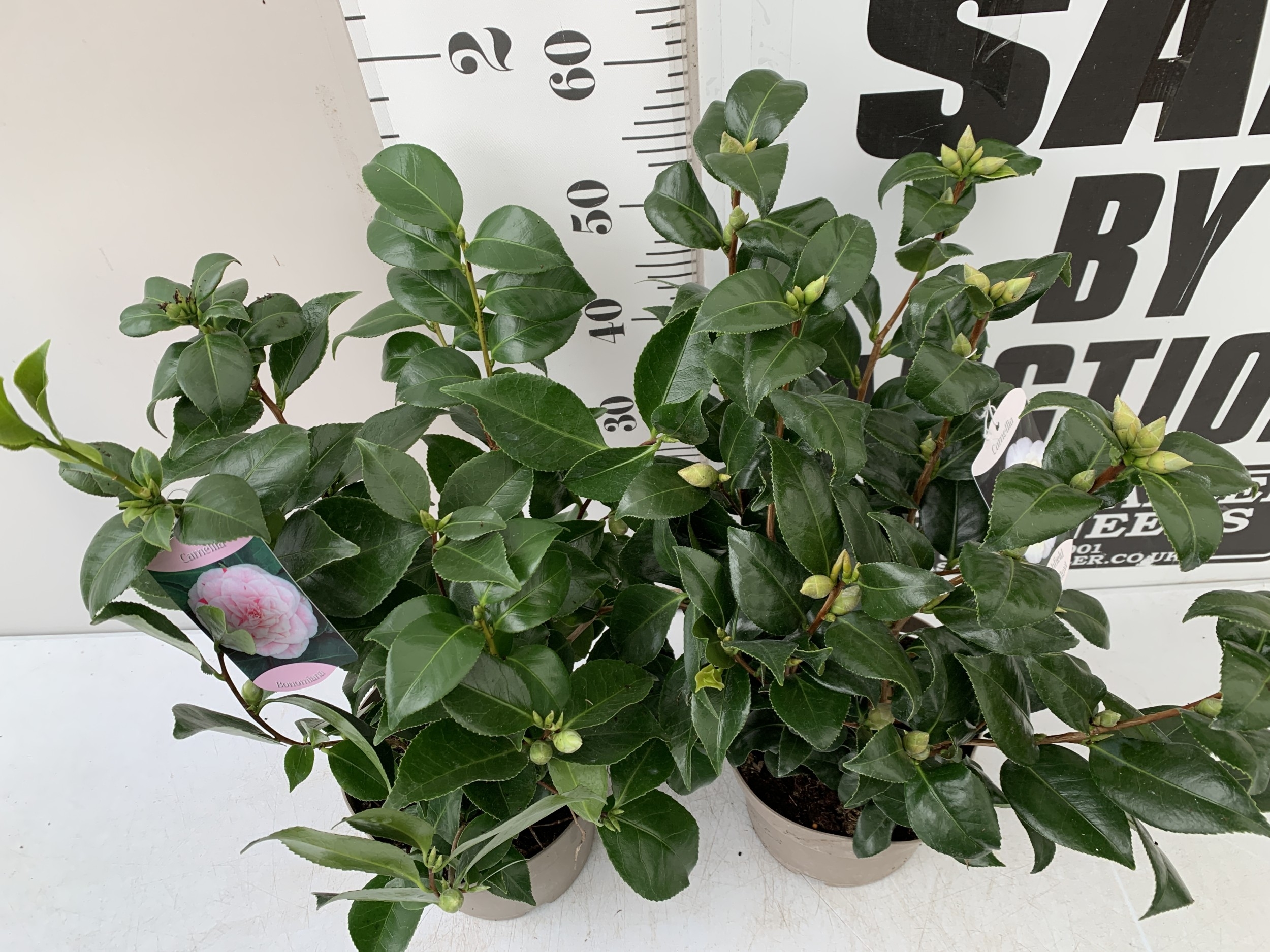 TWO LARGE CAMELLIA JAPONICAS - ONE WHITE 'BRUCHFIELD YELLOW' AND ONE PINK 'BONOMIANA'. FULL OF BUDS IN 4 LTR POTS, APPROX 70CM TALL. TO BE SOLD FOR THE TWO