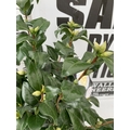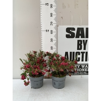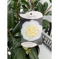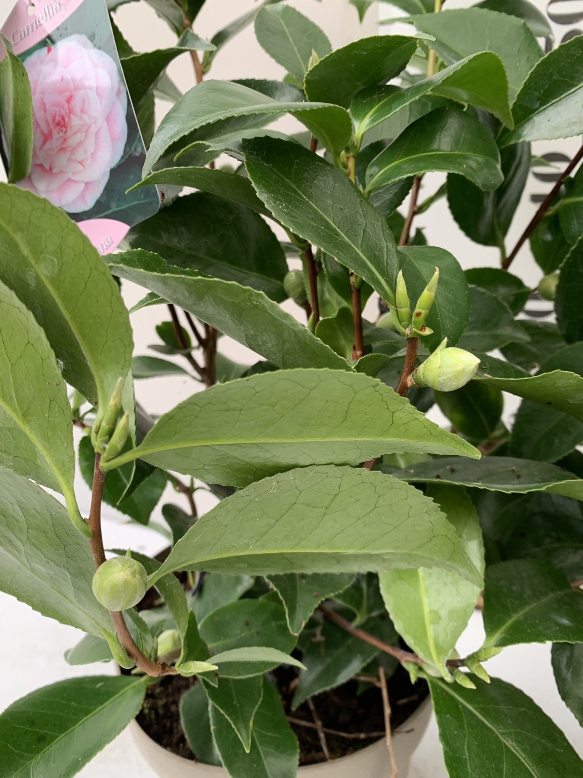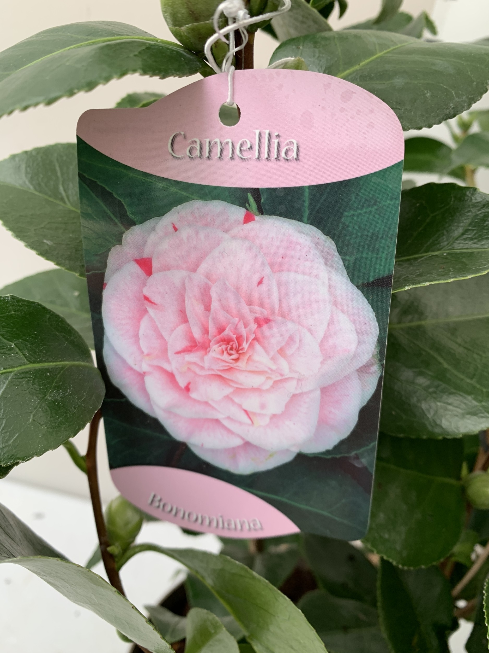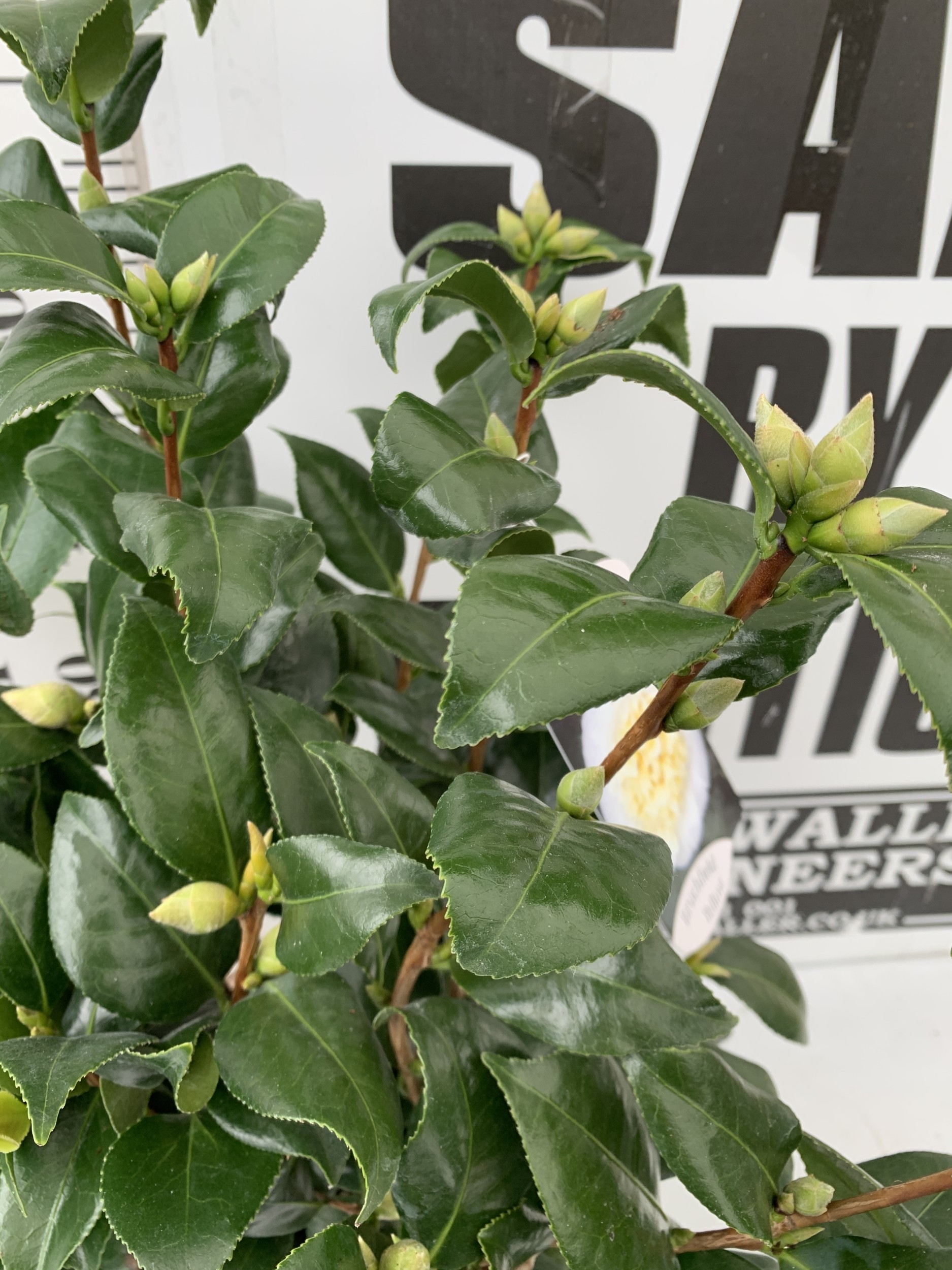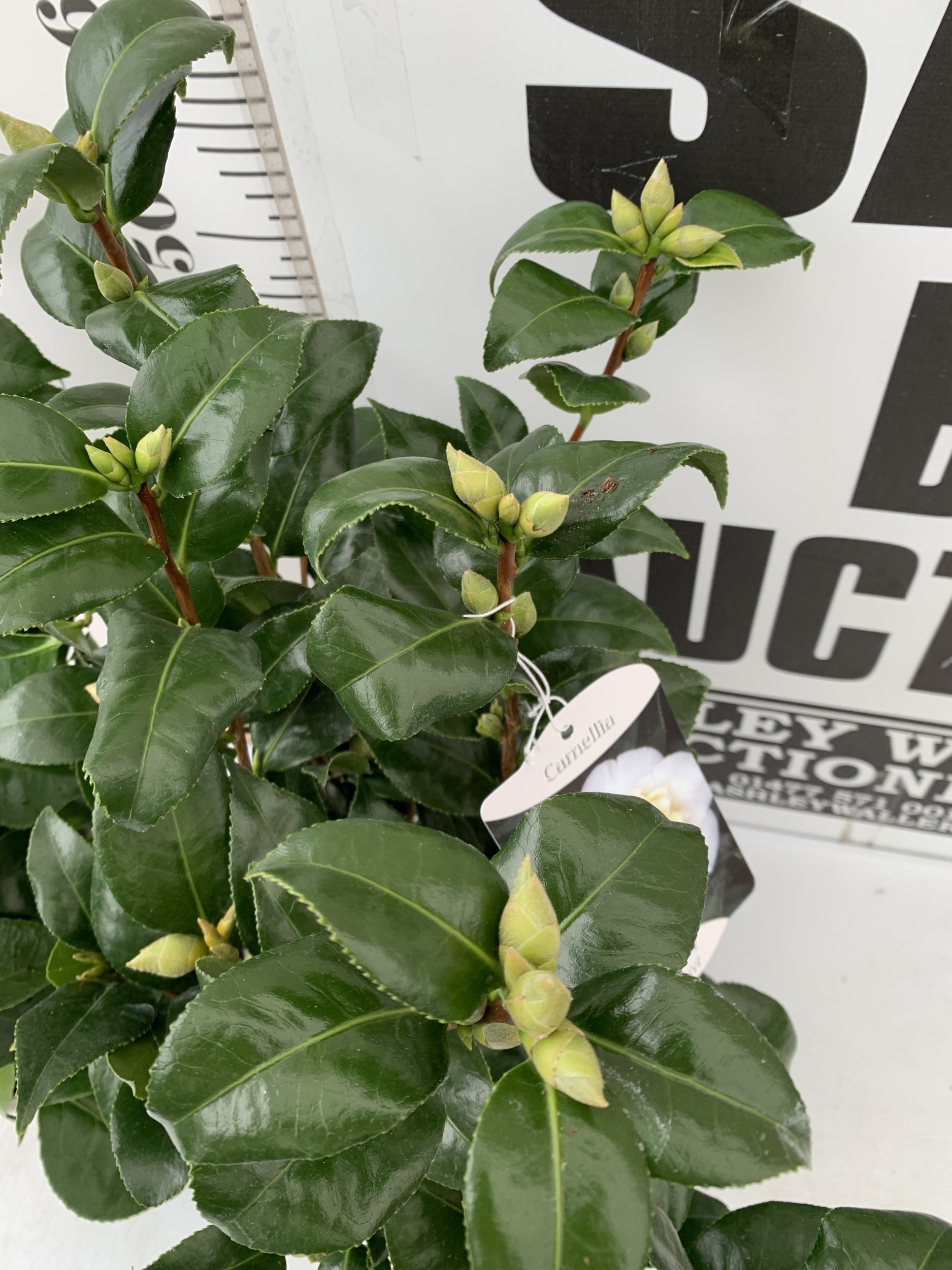 TWO LARGE CAMELLIA JAPONICAS - ONE WHITE 'BRUCHFIELD YELLOW' AND ONE PINK 'BONOMIANA'. FULL OF BUDS IN 4 LTR POTS, APPROX 70CM TALL. TO BE SOLD FOR THE TWO