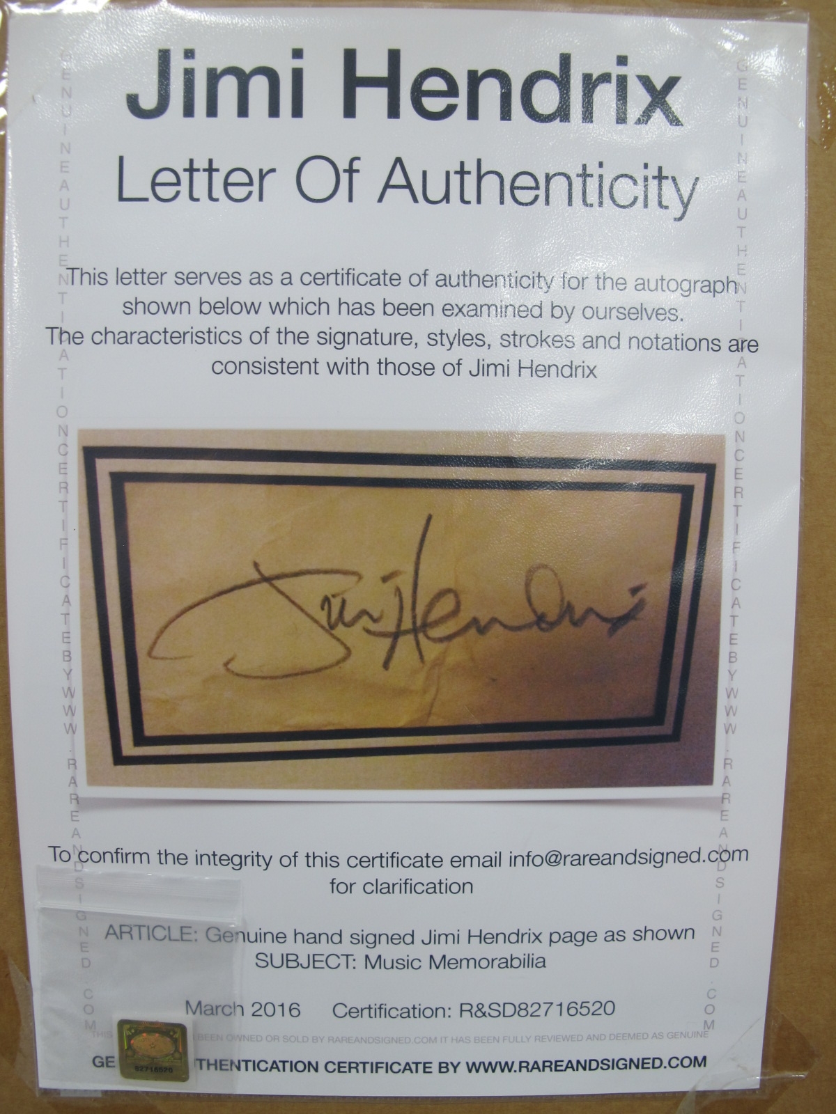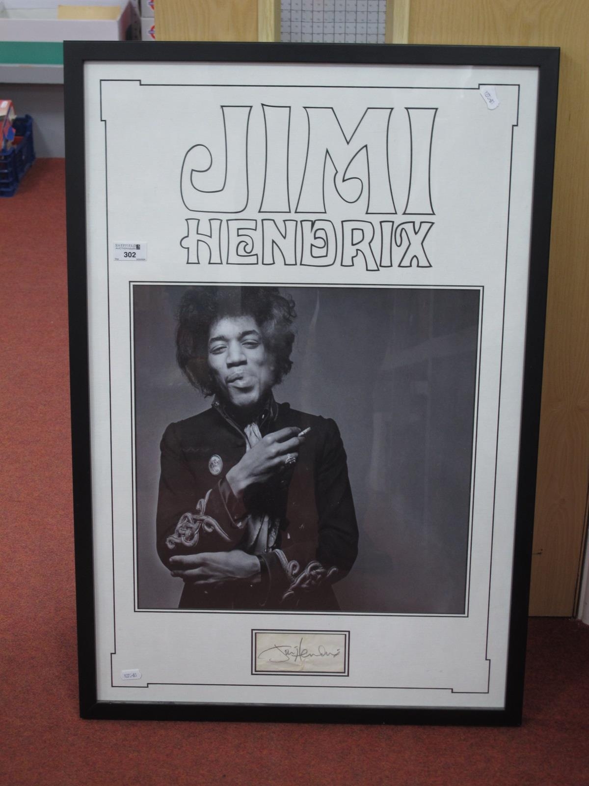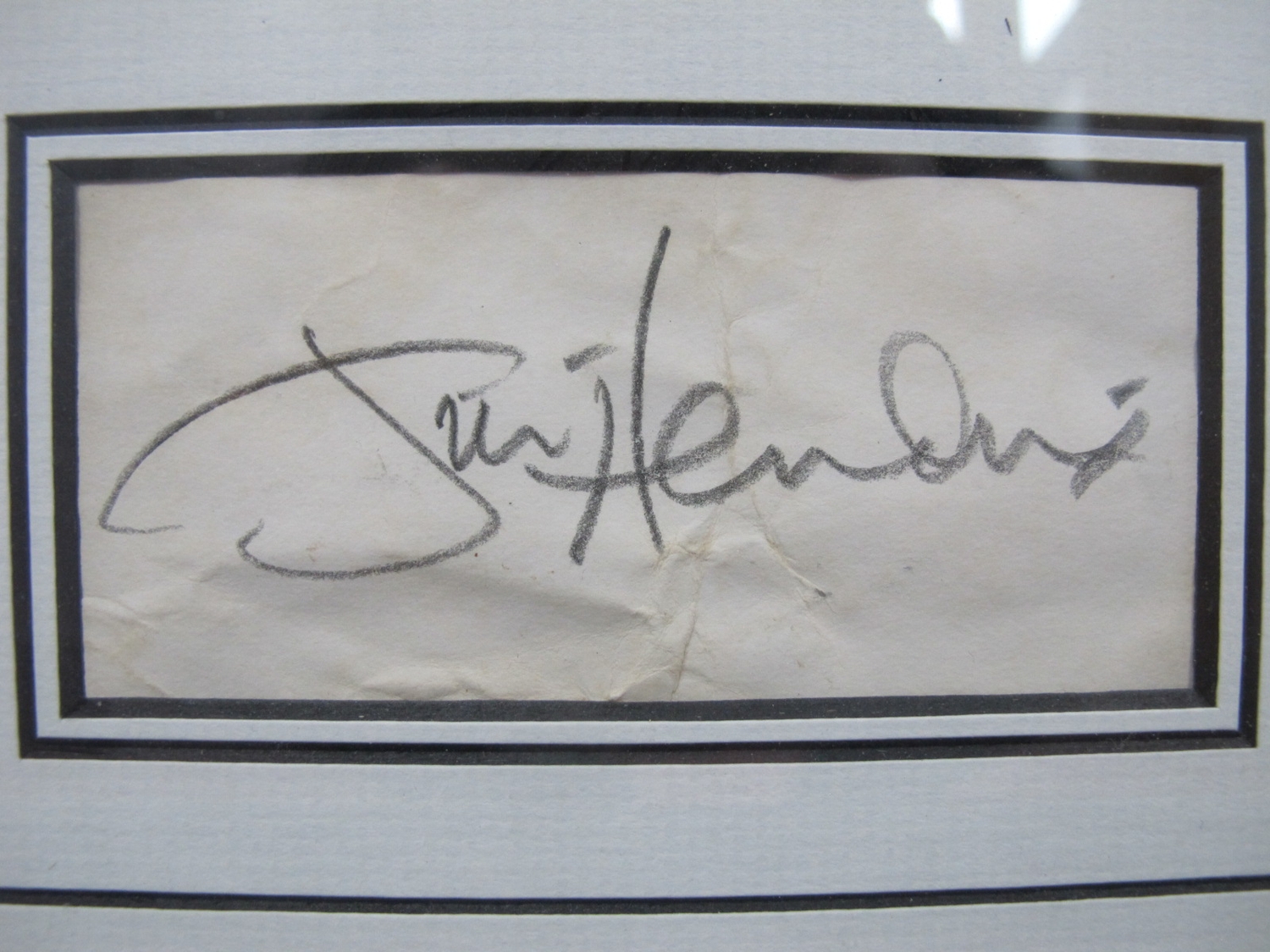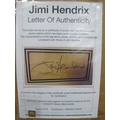 Jimi Hendrix Signature, signed in pencil, with a nicely framed picture; together with a letter of Authenticity from Rareandsigned.com.