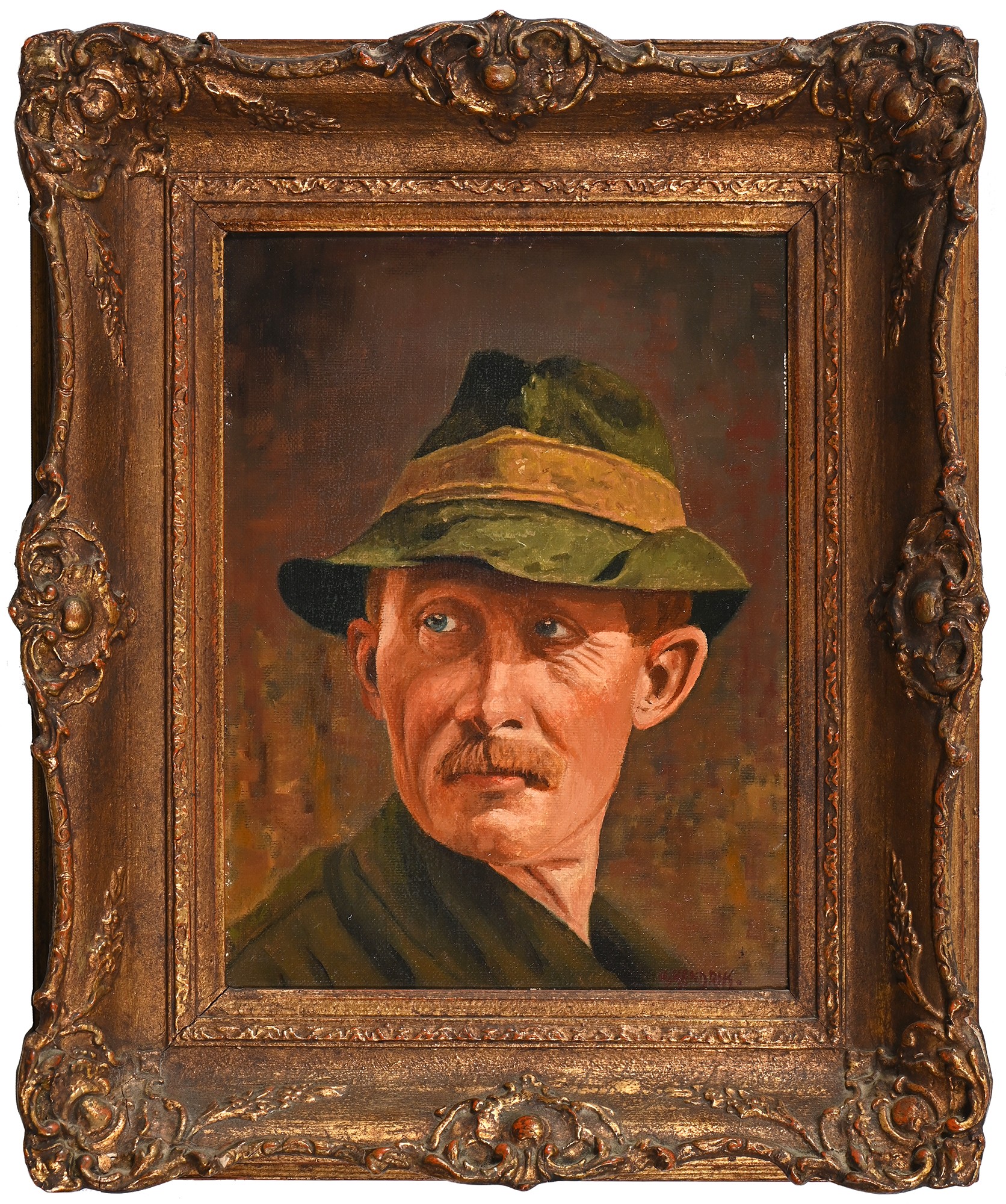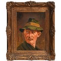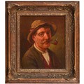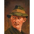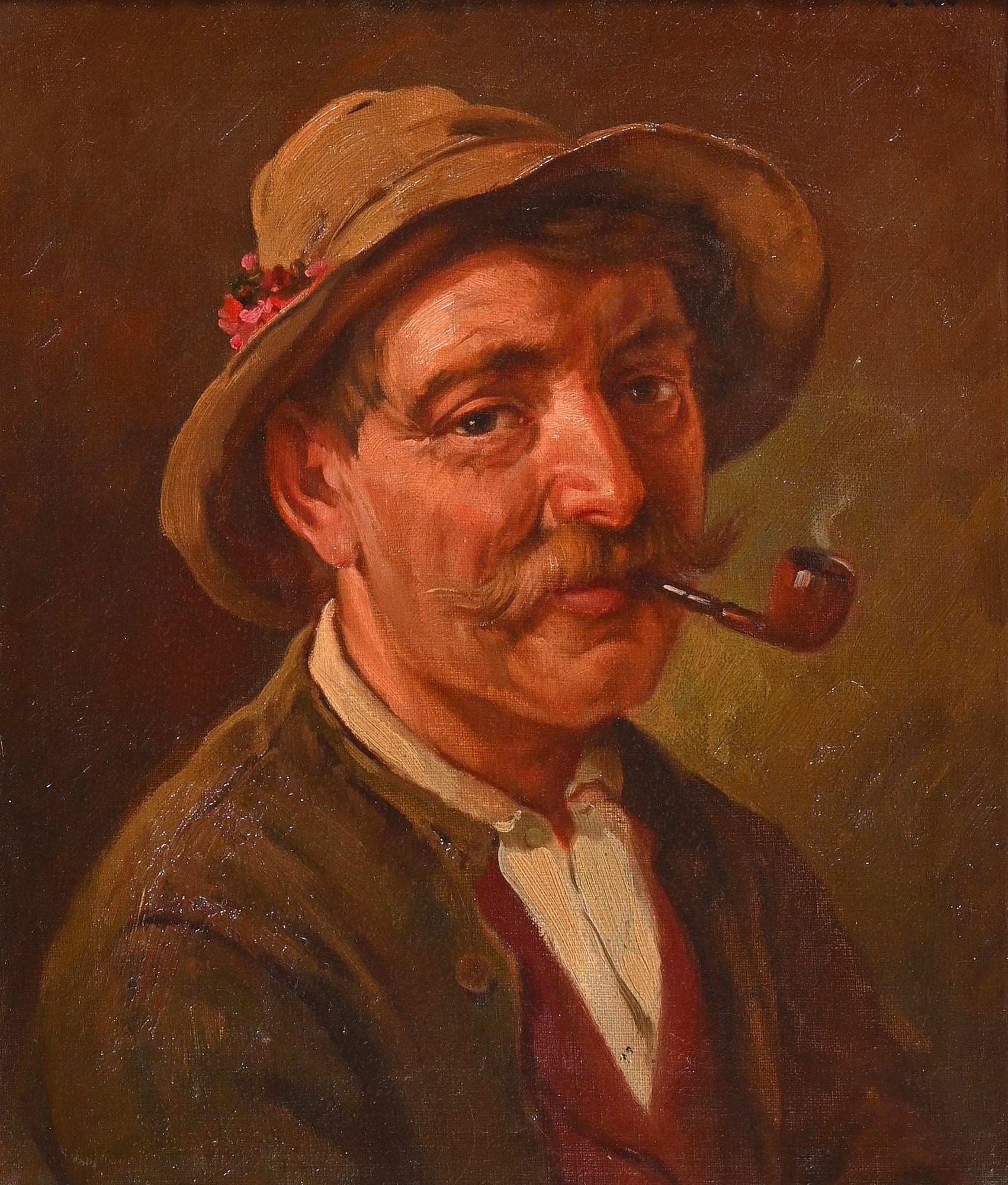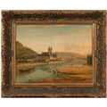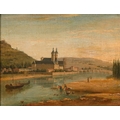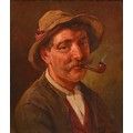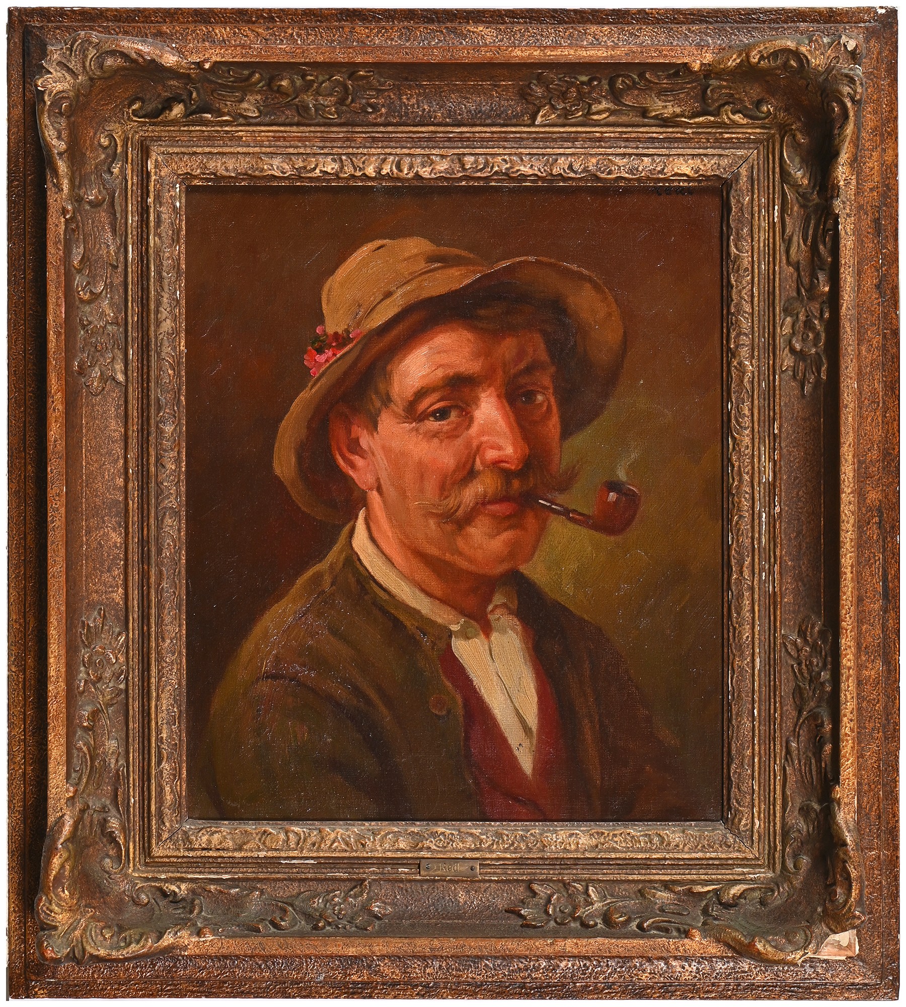 Austrian or German School, 19th century - Rhineland Town, oil on canvas, 33 x 42cm, Redl, early 20th century - Portrait of an Austrian Peasant, head-and-shoulders length, signed, inscribed plaque, oil on canvas, 36.5 x 31cm; a similar portrait by Hendrik, smaller (3)