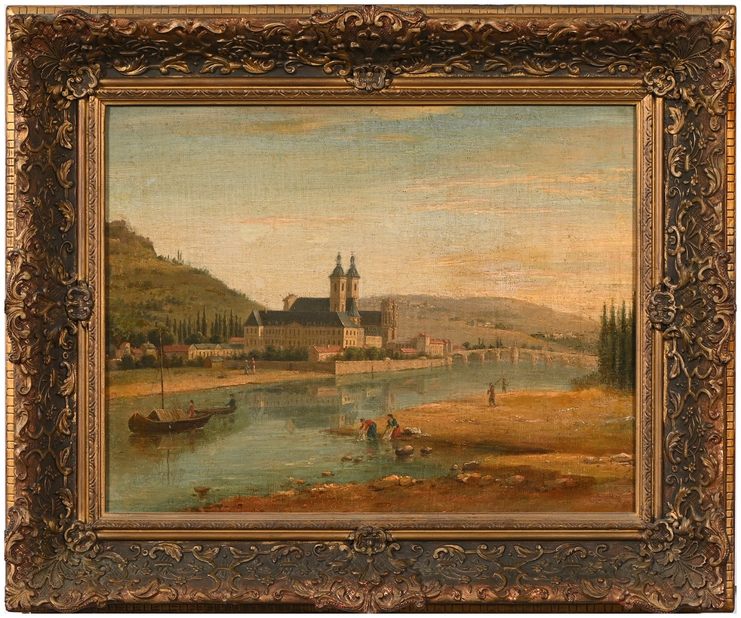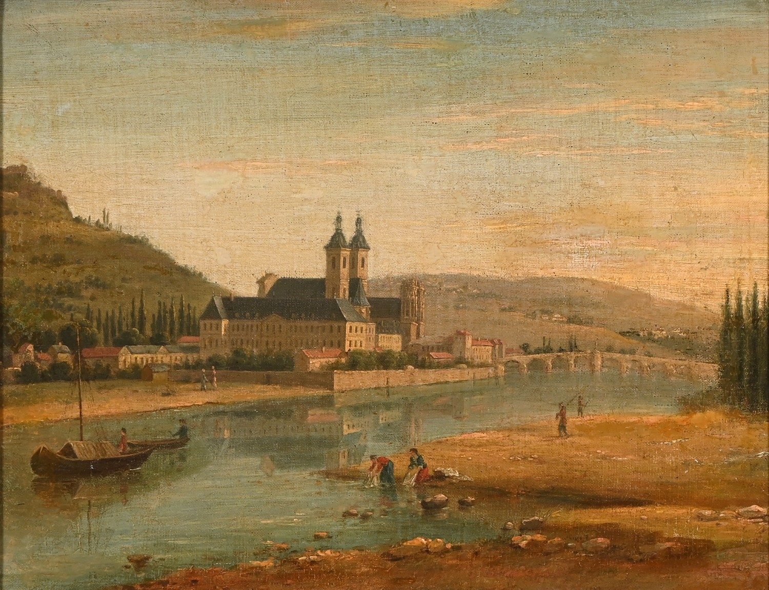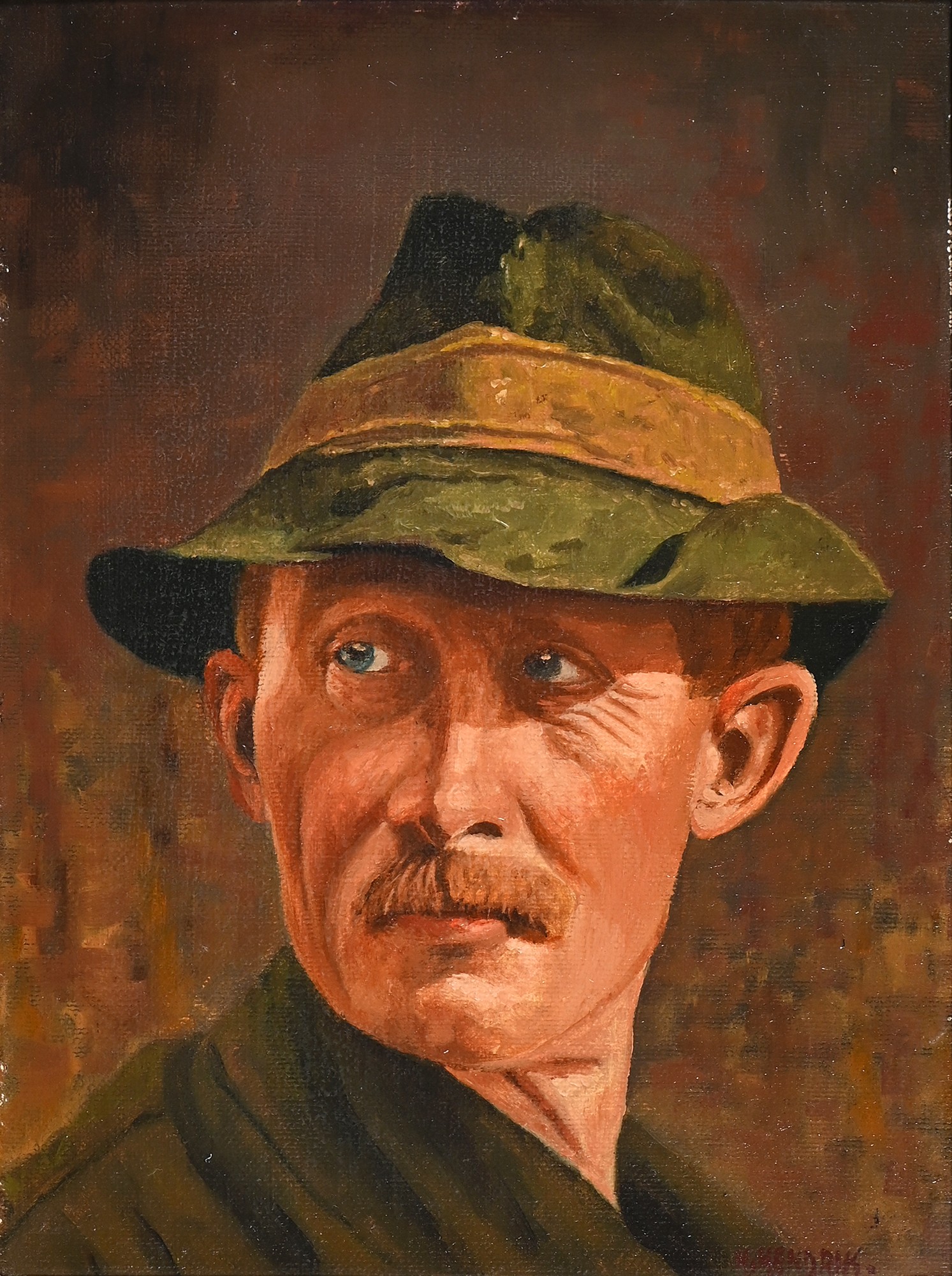Austrian or German School, 19th century - Rhineland Town, oil on canvas, 33 x 42cm, Redl, early 20th century - Portrait of an Austrian Peasant, head-and-shoulders length, signed, inscribed plaque, oil on canvas, 36.5 x 31cm; a similar portrait by Hendrik, smaller (3)