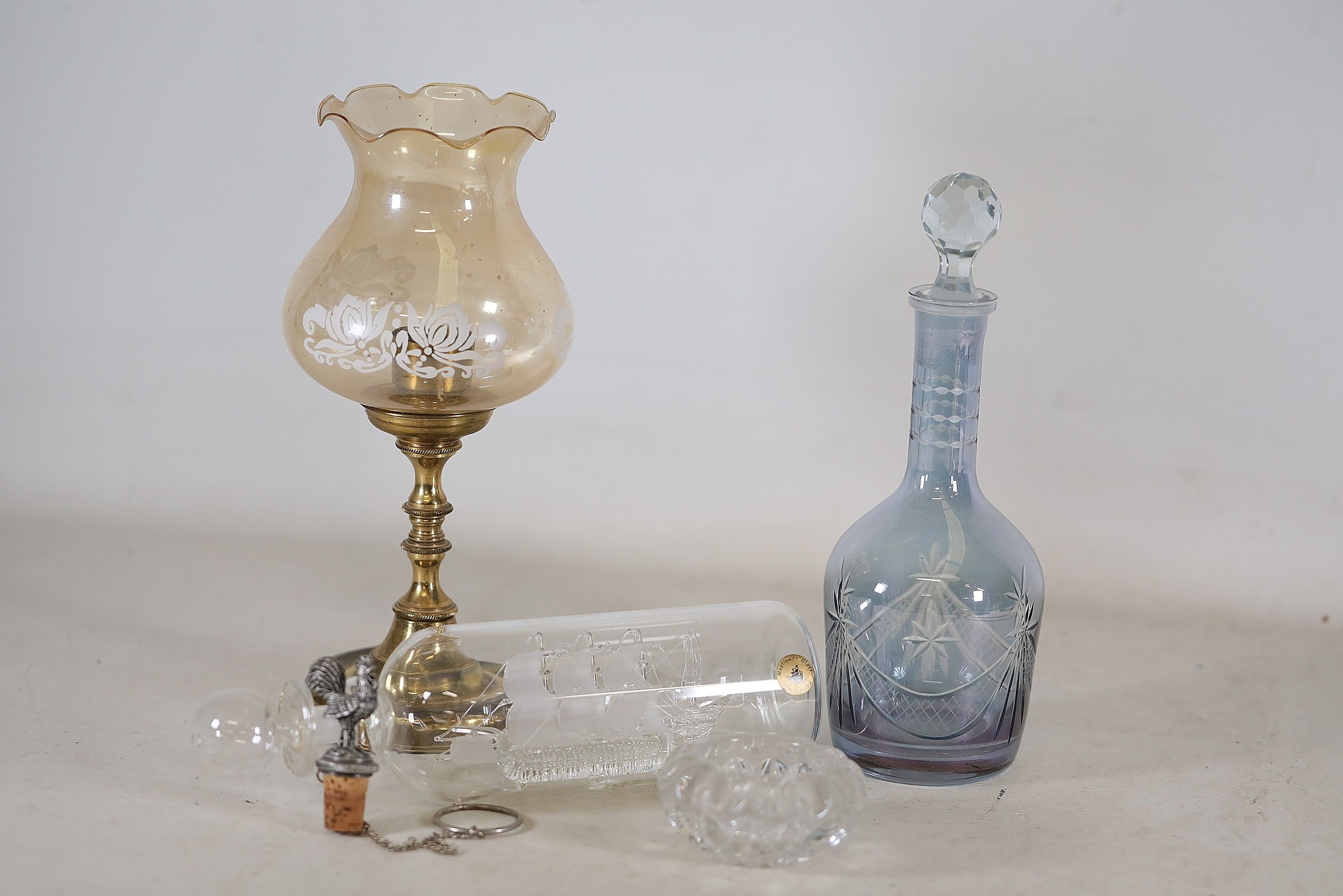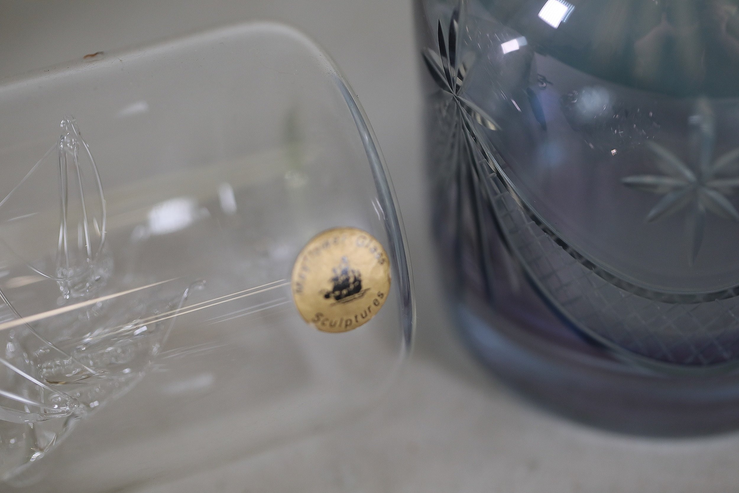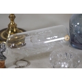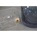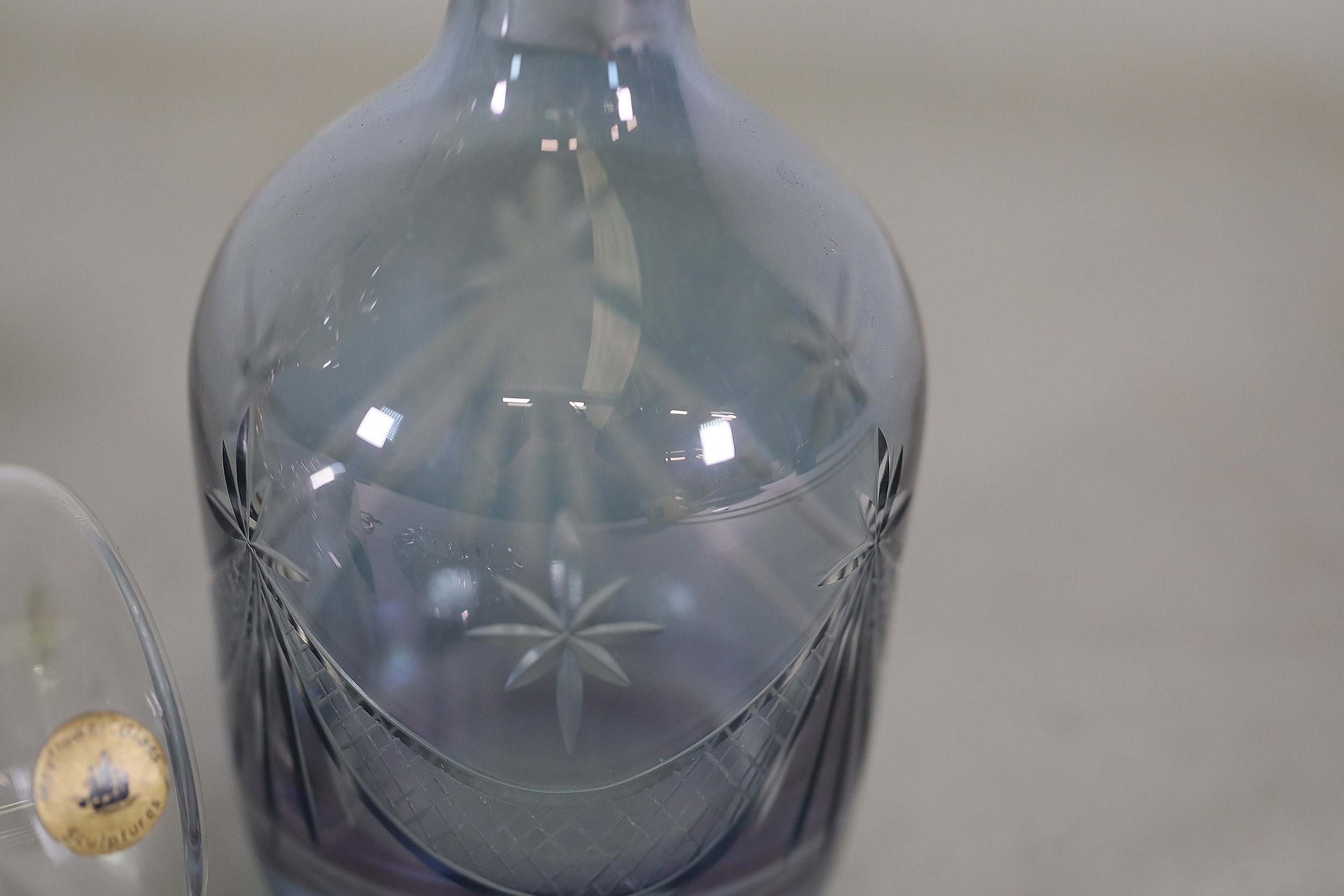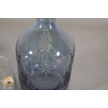 2. **Blue-Tinted Crystal Decanter with Stopper**: A glass decanter with faint blue shading, etched floral and crosshatched designs, and a geometric, faceted stopper. Mid-20th century.