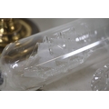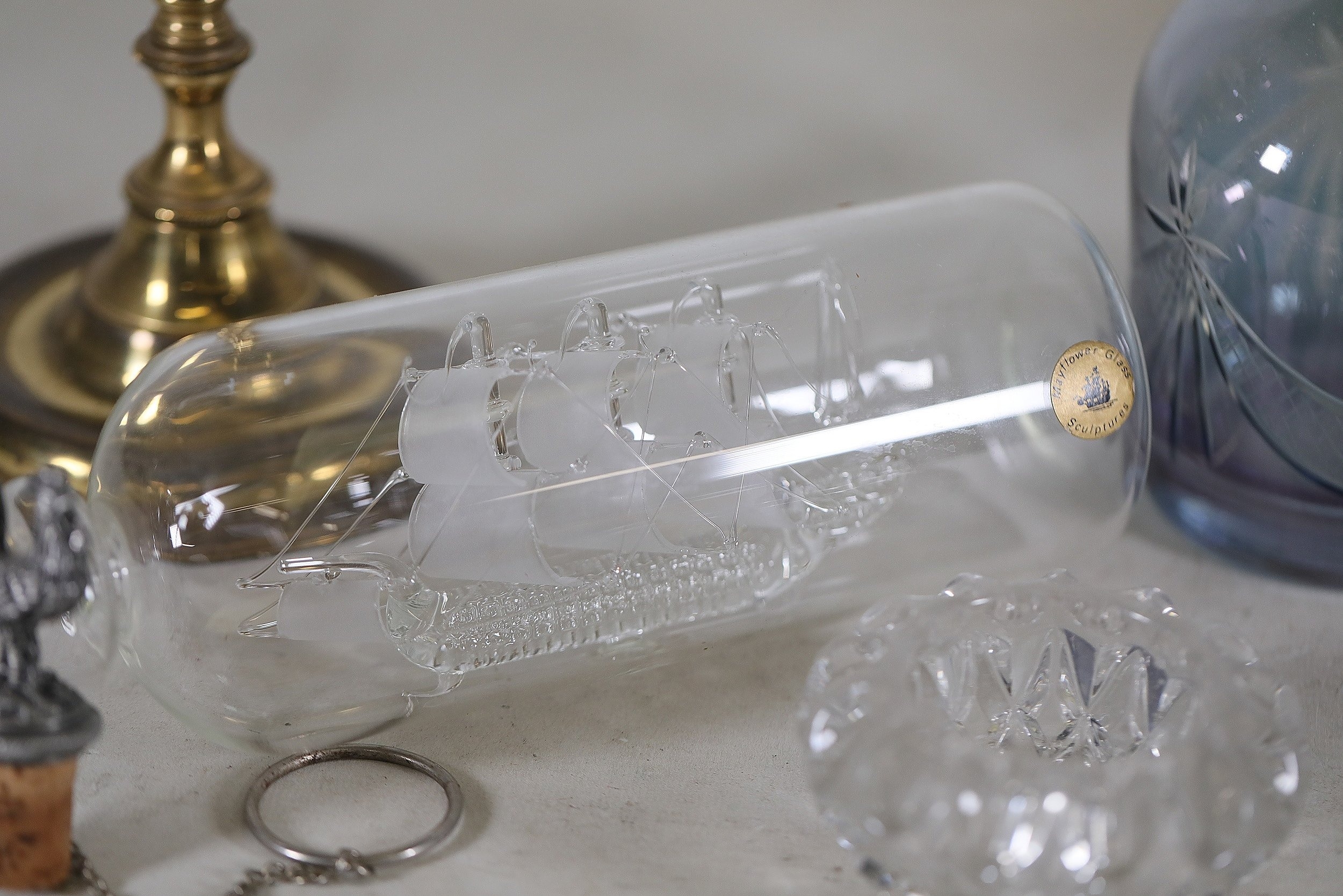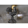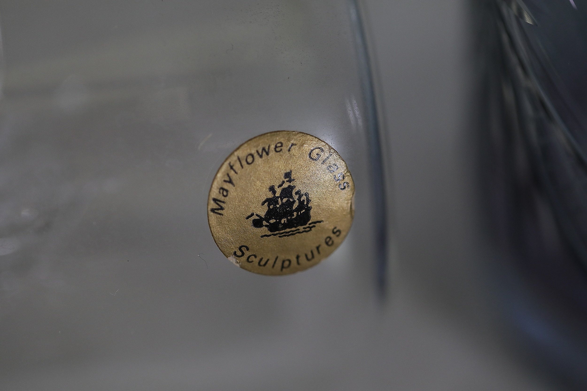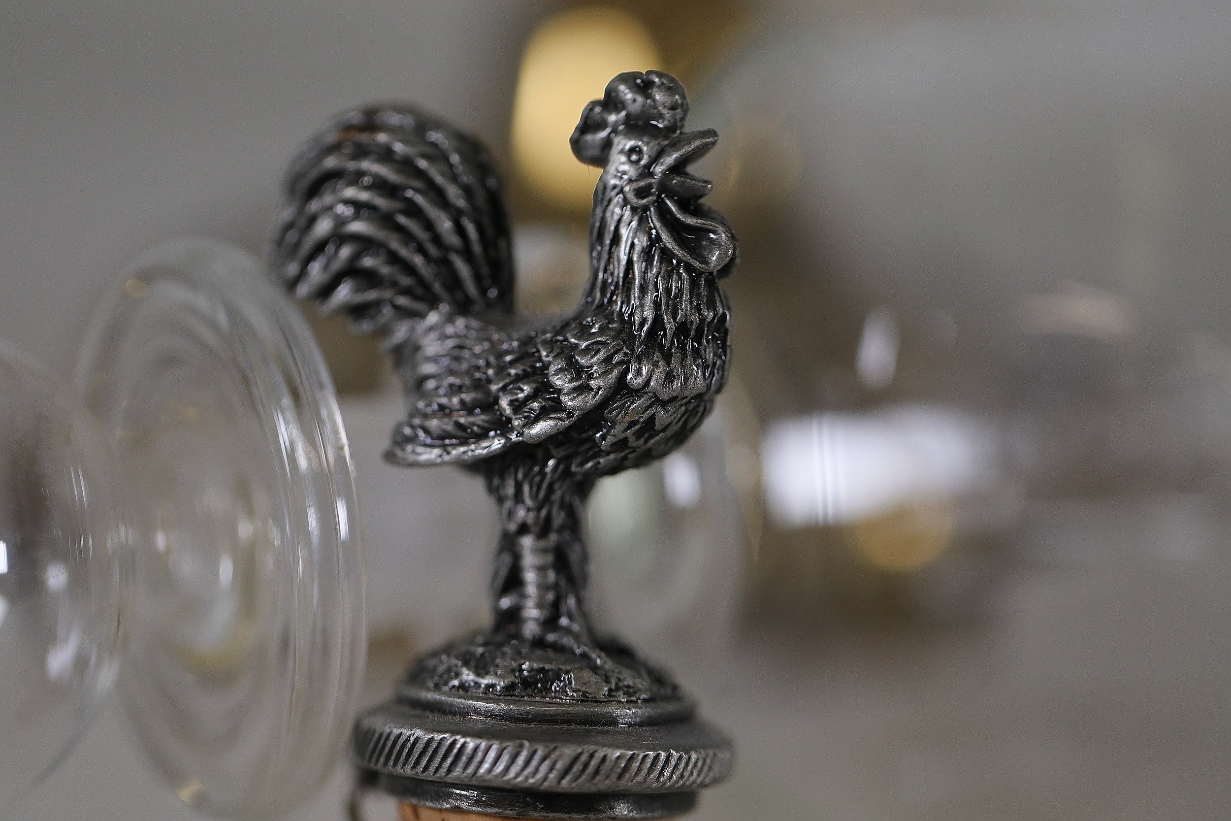 3. **Etched Glass Vessel with Rooster Stopper**: A clear cylindrical glass bottle etched with a three-masted ship and topped with a cork-mounted silver rooster figurine, complete with a decorative chain and ring. The vessel bears a golden label, reading "Mayflower Glass Sculptures," connecting it to mid-to-late 20th-century artisan glass production.