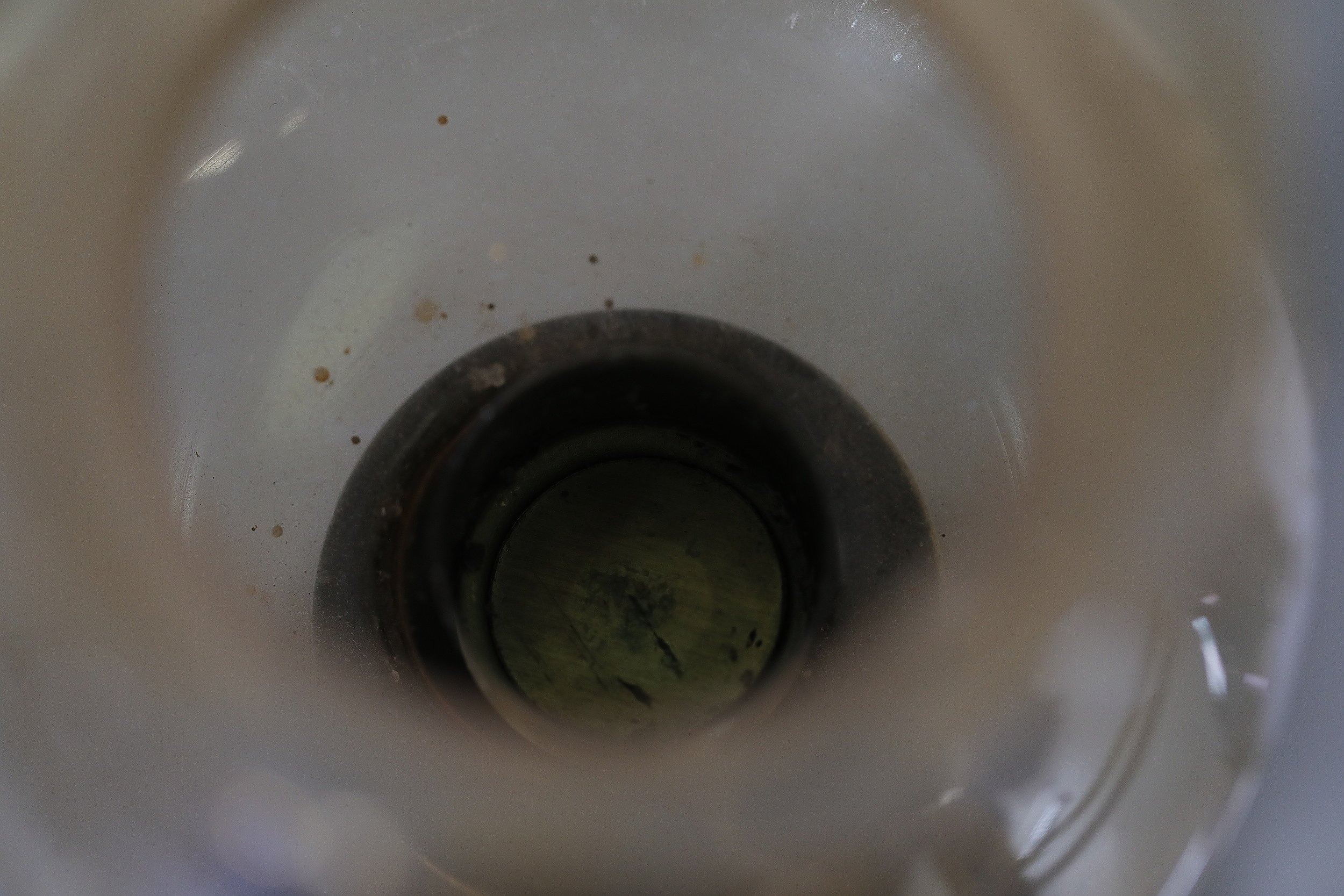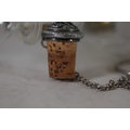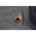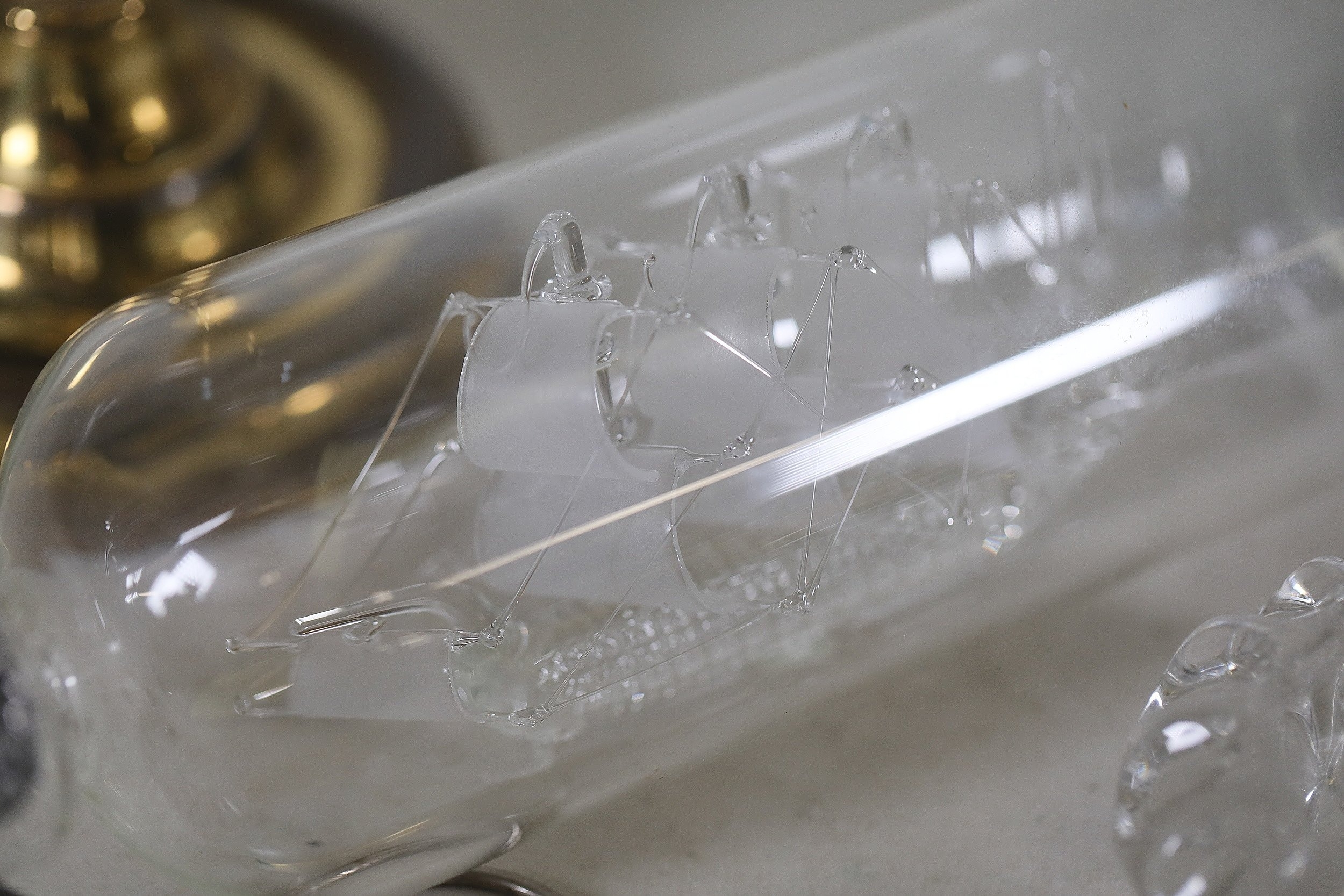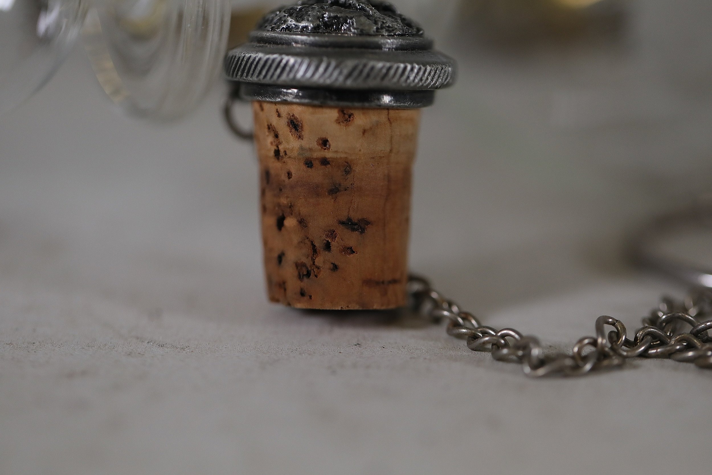 3. **Etched Glass Vessel with Rooster Stopper**: A clear cylindrical glass bottle etched with a three-masted ship and topped with a cork-mounted silver rooster figurine, complete with a decorative chain and ring. The vessel bears a golden label, reading "Mayflower Glass Sculptures," connecting it to mid-to-late 20th-century artisan glass production.