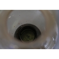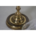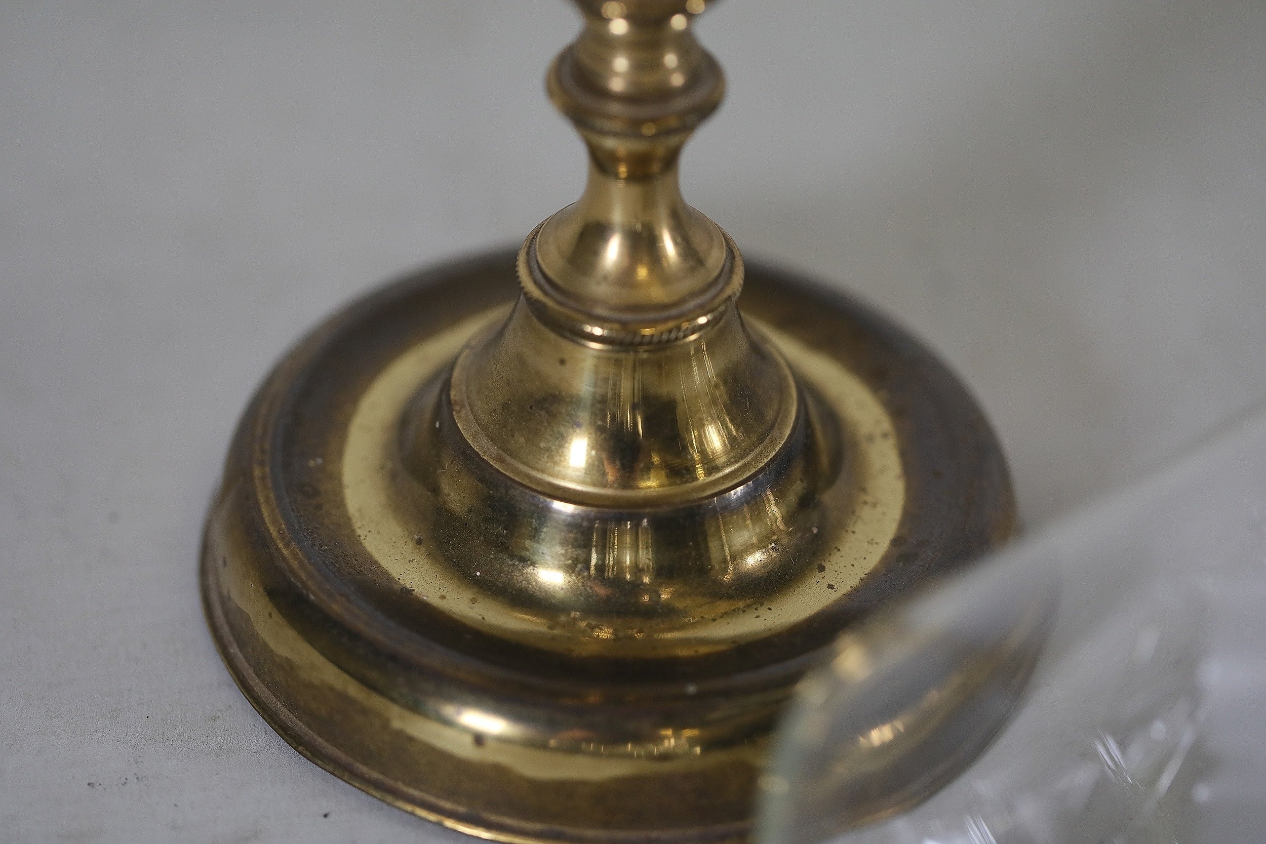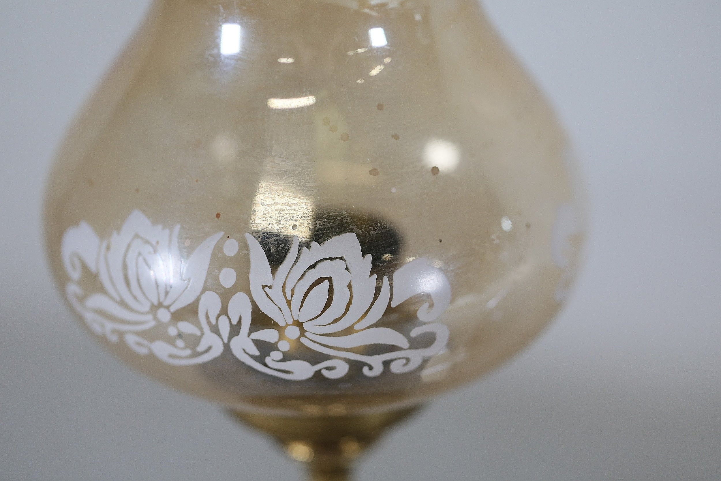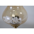 1. **Brass and Glass Lamp**: Featuring a polished brass base and a translucent amber-toned tulip-shaped glass shade with scalloped gilded edges. The shade is adorned with white floral painted motifs. Likely early-to-mid 20th century (circa 19301960).