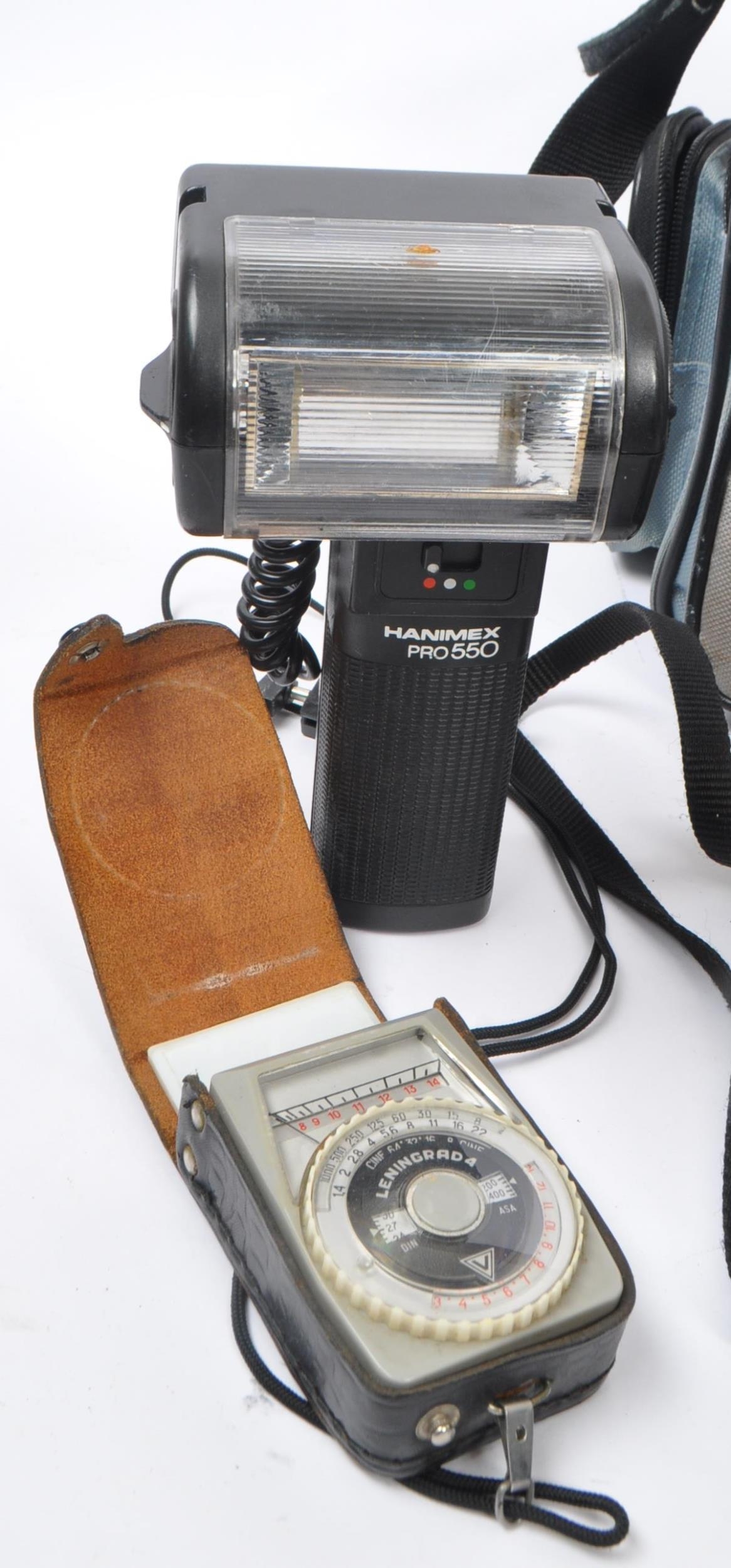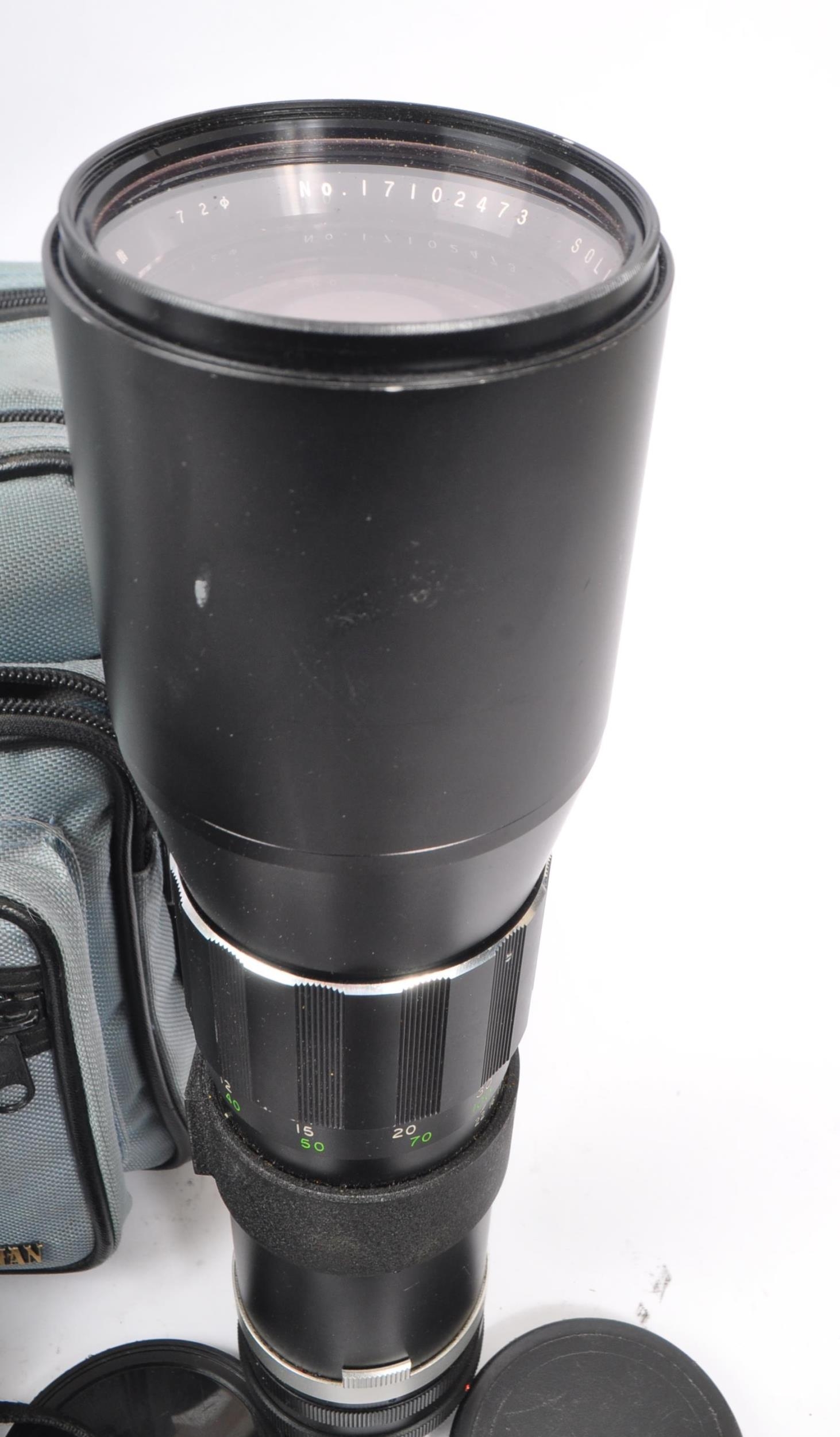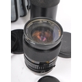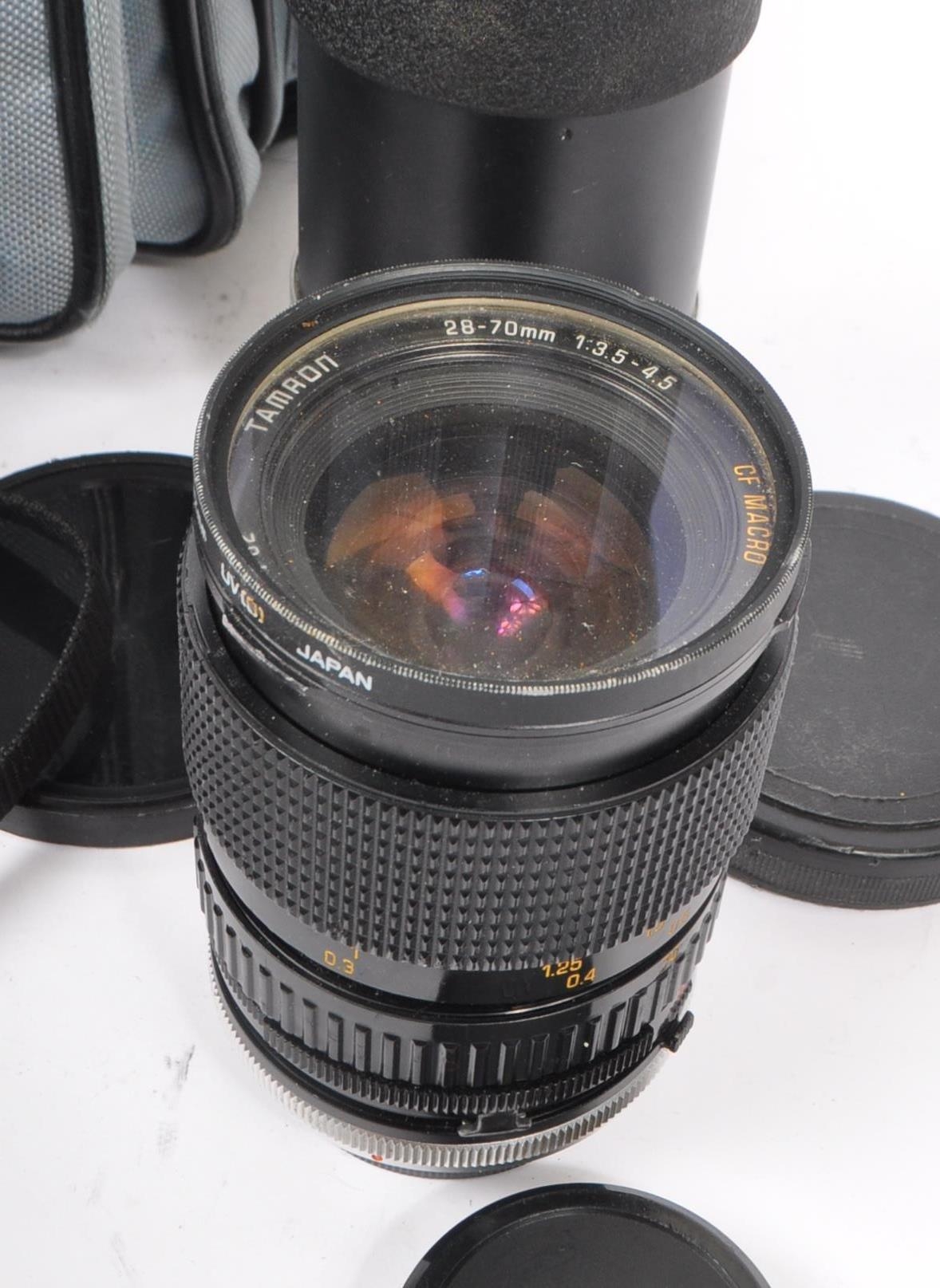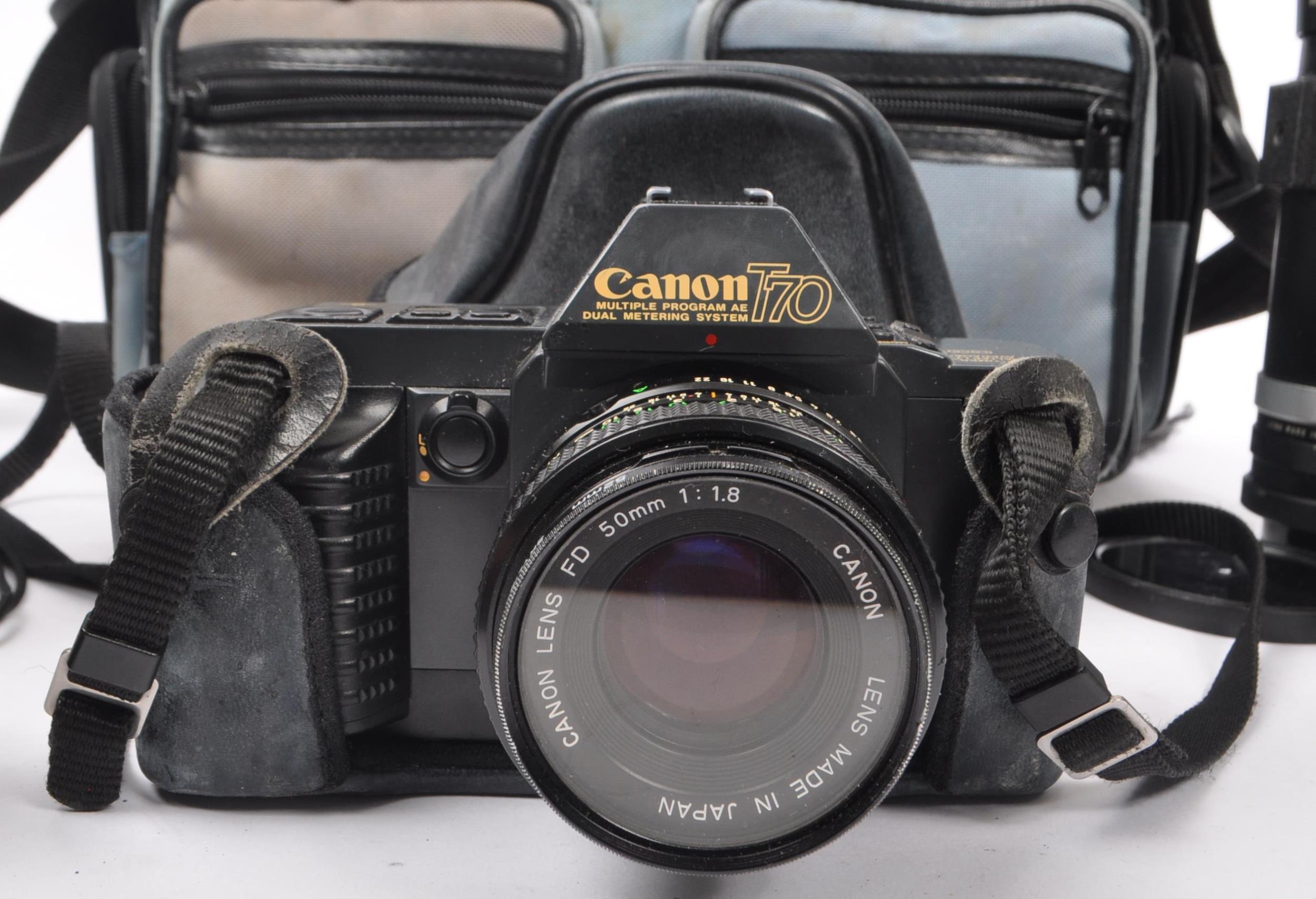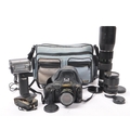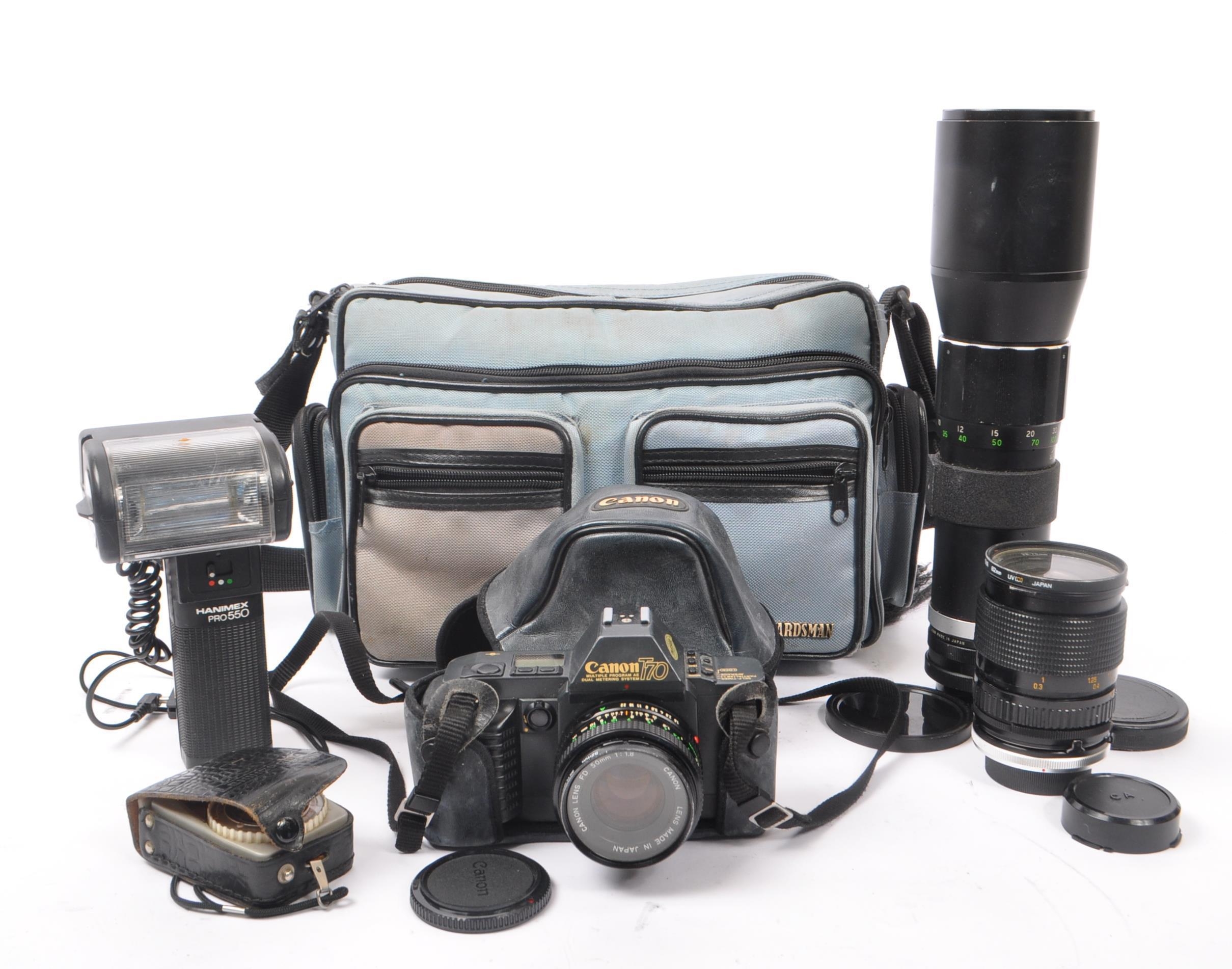 Canon - A late 20th century 1980s Canon T70 35mm SLR camera with Hanimex Pro 550 electronic flash and lenses. The camera in a black colourway, alongside Canon FD 50mm F1.8 lens, a Tamron 28-70mm F3.5-4.5 zoom lens, and a Soligor Tele-Auto 400mm F6.3