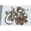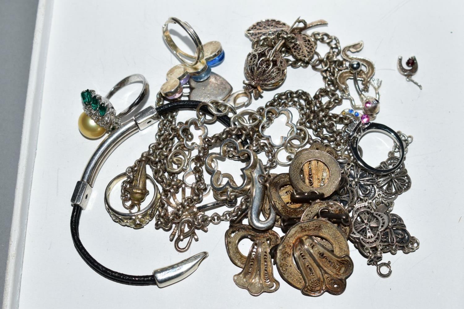 A SELECTION OF JEWELLERY, to include a filigree bracelet, clasp missing, a belcher link chain, three rings etc, some with marks to indicate silver, approximate total weight 124 grams